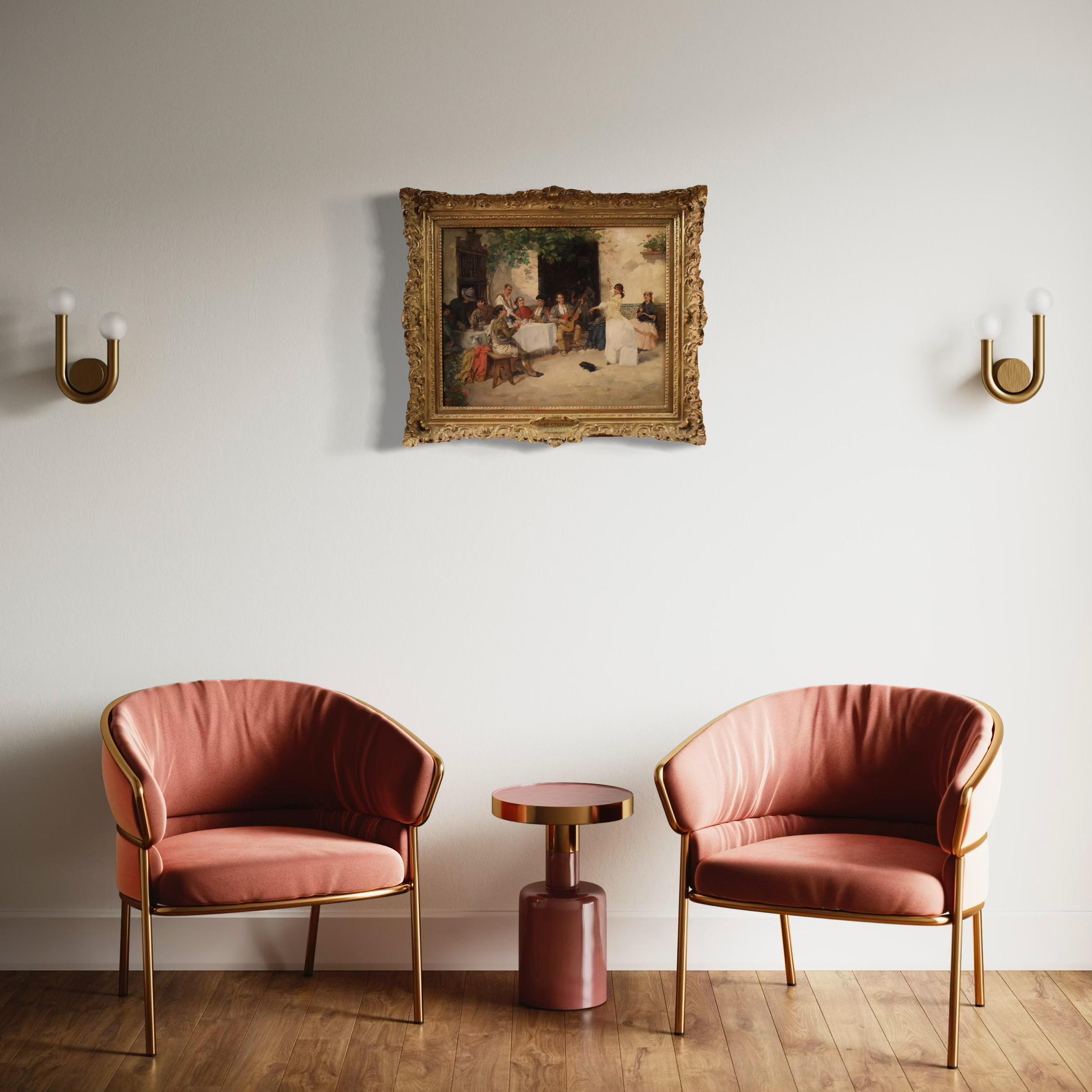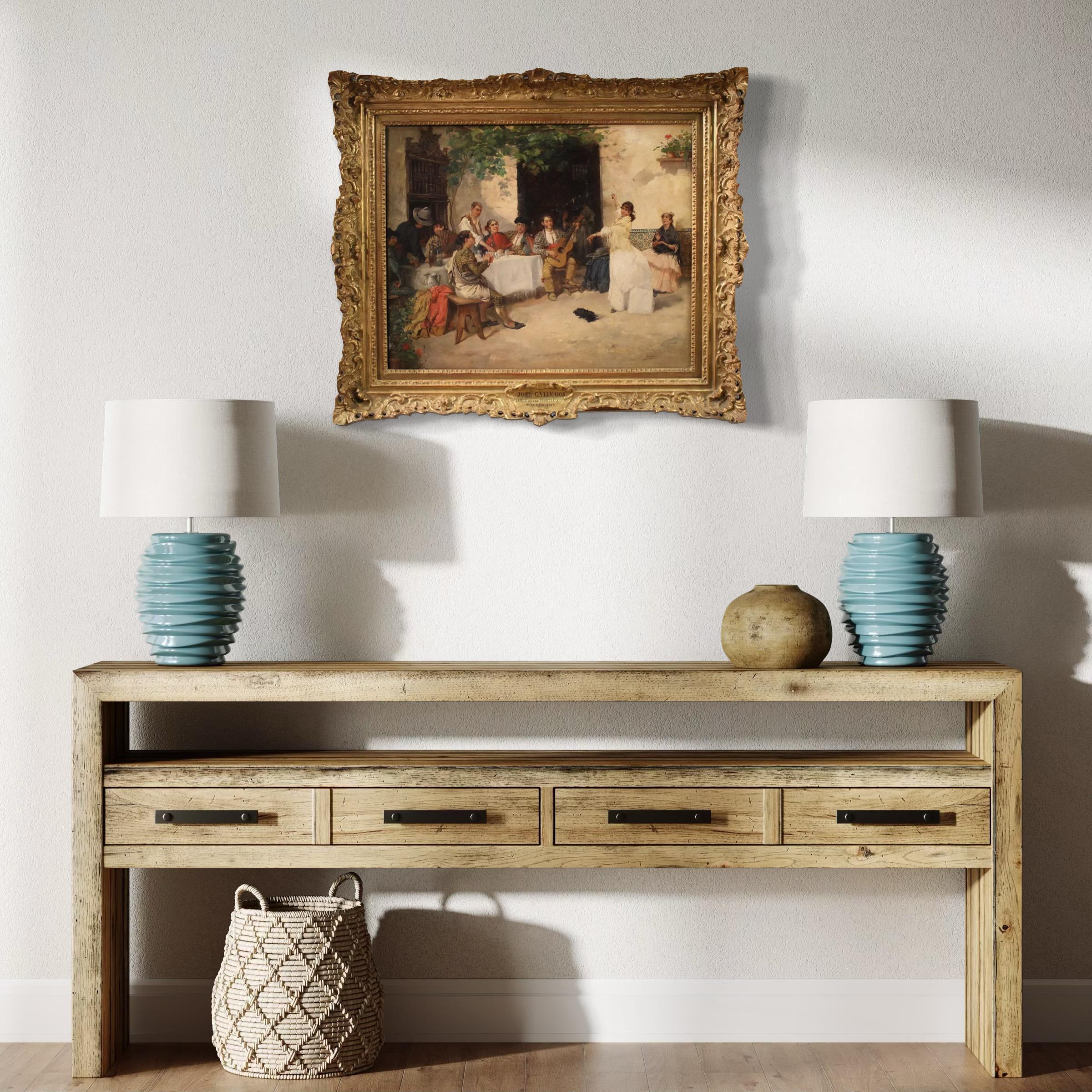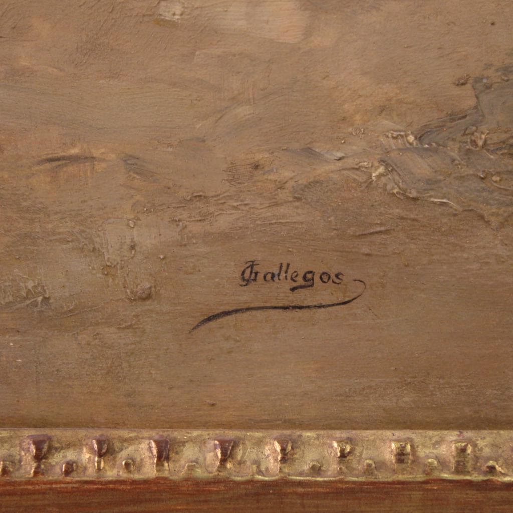A splendid Spanish painting from the second half of the 19th century. Oil on panel painting, signed Gallegos lower right, attributed to the great Andalusian painter José Gallegos y Arnosa (1857-1917). Known for his folkloric genre scenes and extraordinary attention to detail, his works were successful throughout Europe.