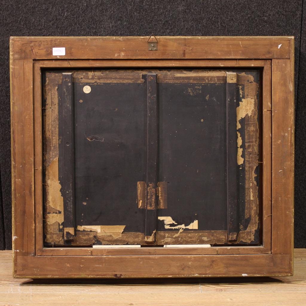 Scenographic contemporary frame in finely carved and gilded wood, also featuring the inscription: José Gallegos, Jerez de las Fronteras 1859, Madrid 1919 (see photo). The painting has already been restored, with small areas of color restoration, but is in overall good condition. Internal dimensions: H 48 x W 60 cm.
