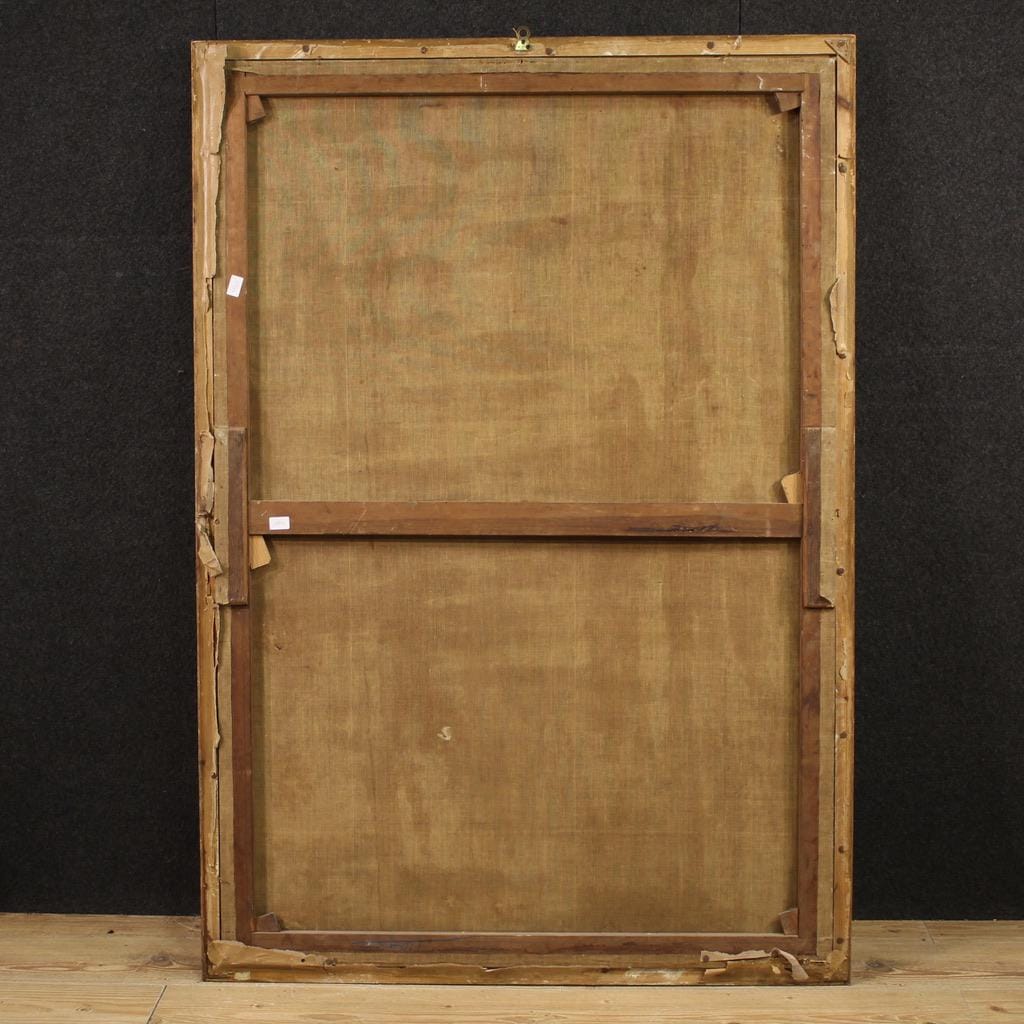 The composition and theatrical lighting recall Iberian devotional painting, reinterpreted in the 19th century. This evocative and highly decorative painting is suitable for refined, classic and modern settings. The 20th-century frame is carved and gilded wood, with some signs of aging. The painting has undergone restoration, including relining, replacement of the stretcher, and restoration of the color in some areas.