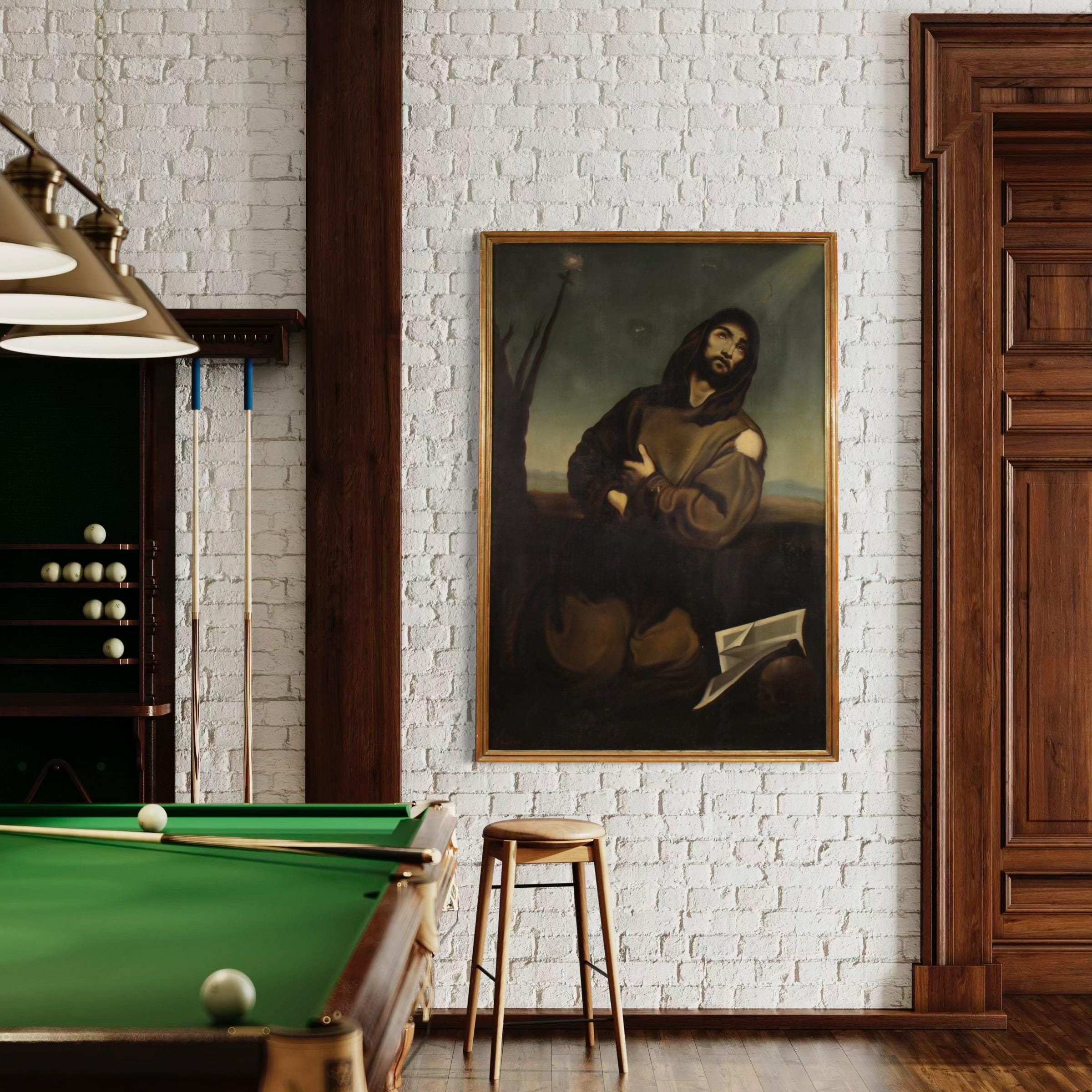 Large Spanish painting, signed by J. Amat and dated 1865. Oil on canvas artwork depicting Saint Francis of Assisi in ecstasy, artwork of exquisite artistry. Draped in his habit, the Saint is depicted kneeling next to a skull and a book, symbols of vanitas and meditation on the transience of life.