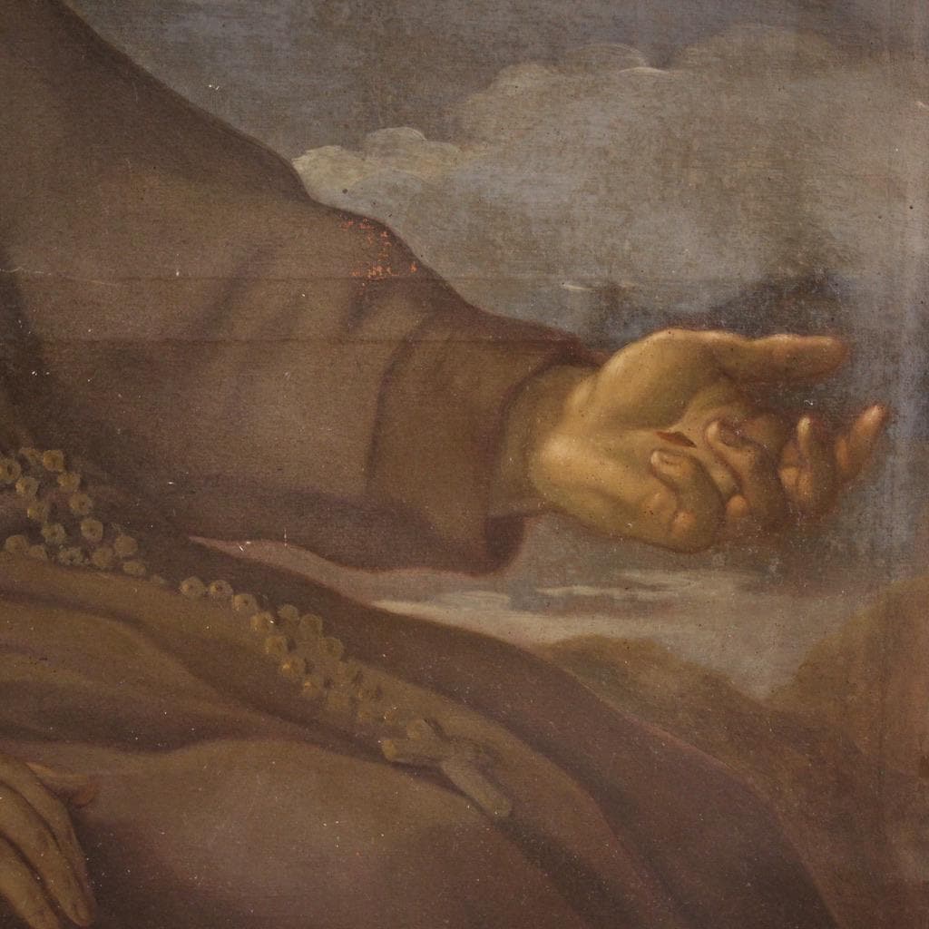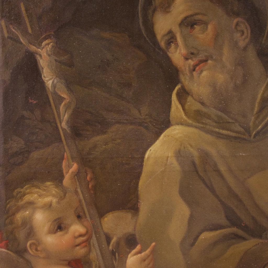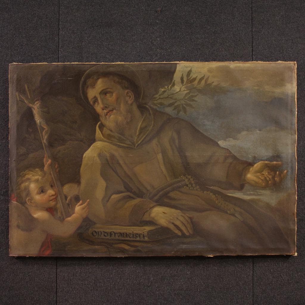 Great Italian painting from the second half of the 18th century. Oil on canvas painting, on the first canvas, depicting Saint Francis of Assisi in ecstasy. The Saint is accompanied by a splendid angel holding a crucifix, flanked by a skull and a scourge, iconographic symbols linked to penance and meditation on the transience of life.