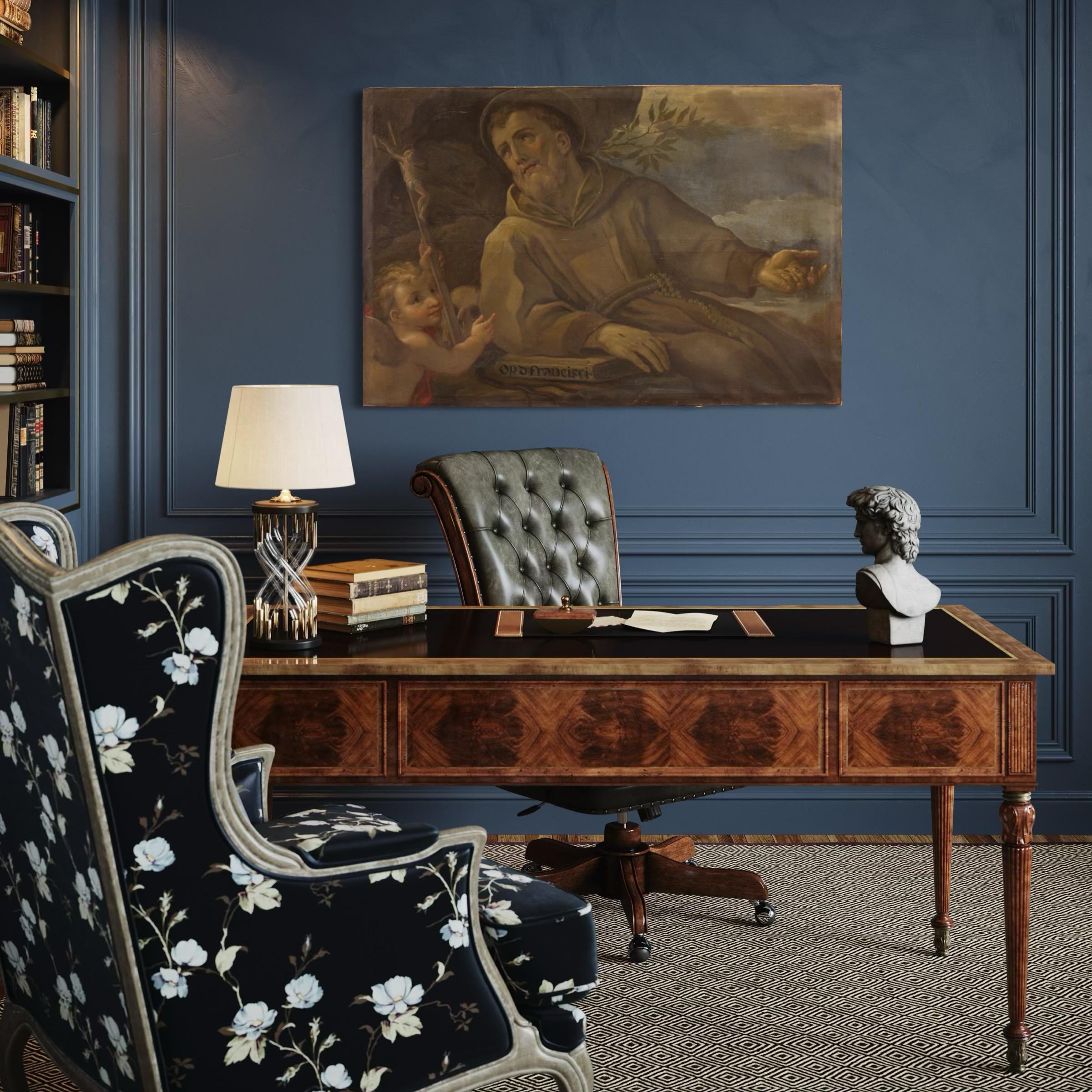 Saint Francis gazes intently at the crucifix and leans on a large book with the devotional inscription "Op. d. Francisci," alluding to the Saint's works. This exquisitely painted painting stands out for the expressiveness of the Saint's face and the sweetness of the little angel, transporting you to a mystical and serene atmosphere.