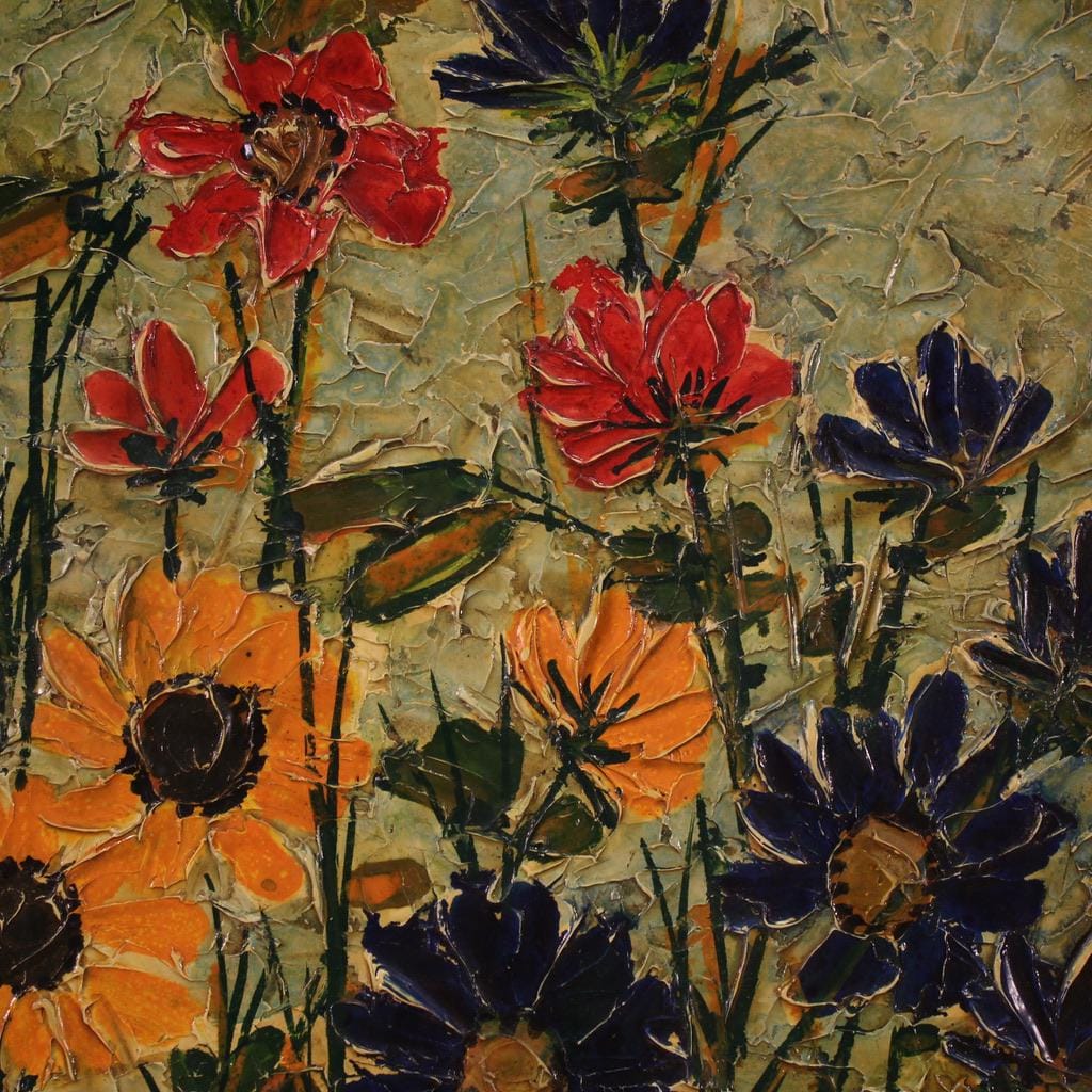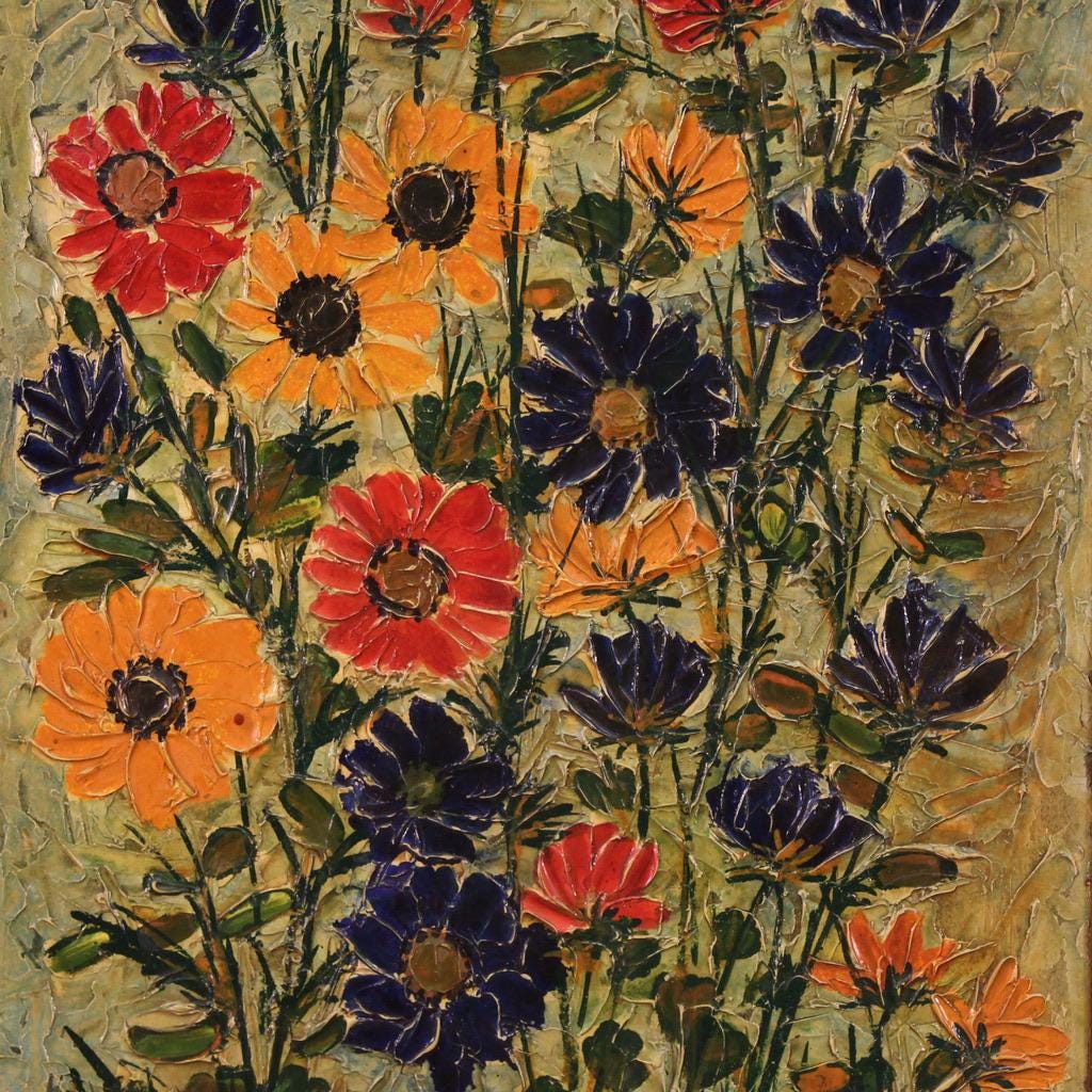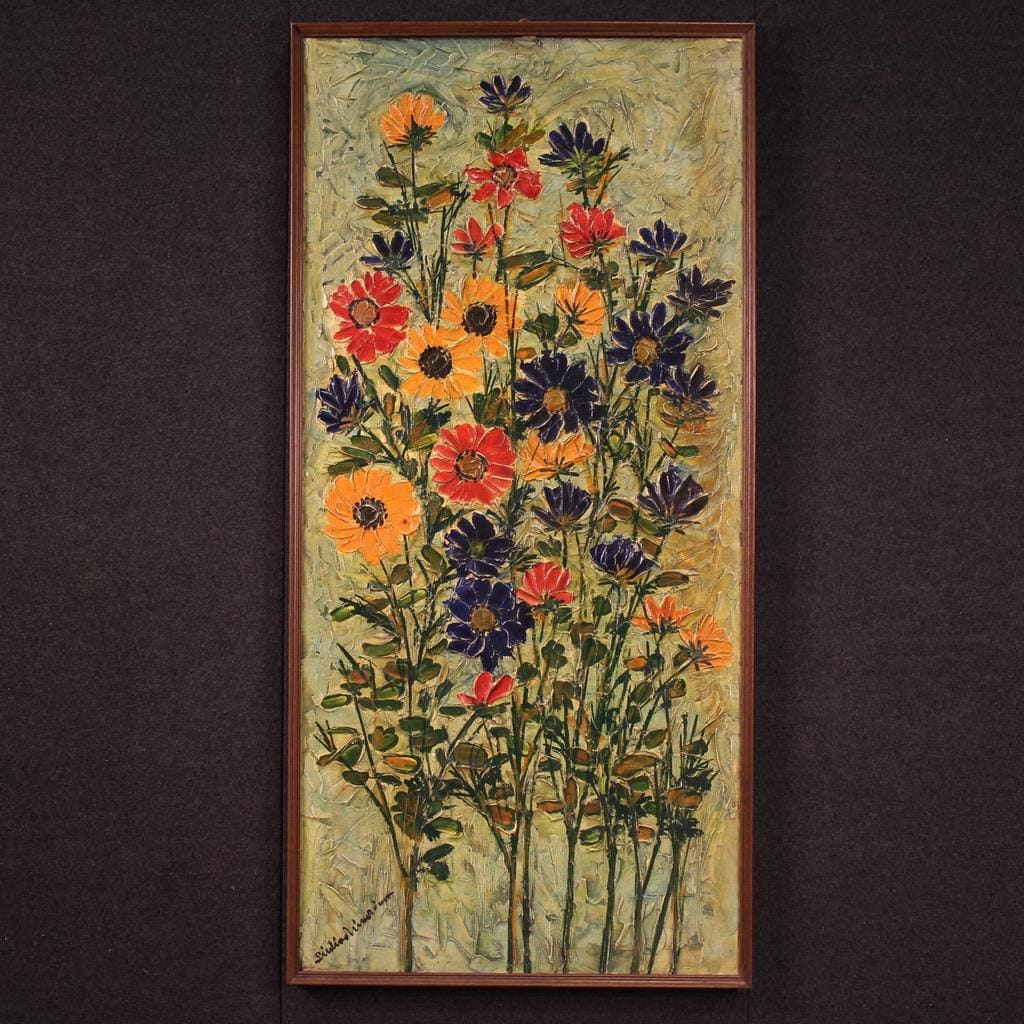 Italian painting from the second half of the 20th century. Oil on plywood panel depicting a still life with flowers in the Impressionist style, featuring excellent pictorial quality. A large, impactful painting, with excellent luminosity and vibrant colors. The artwork is adorned with a simple wooden frame in good condition.