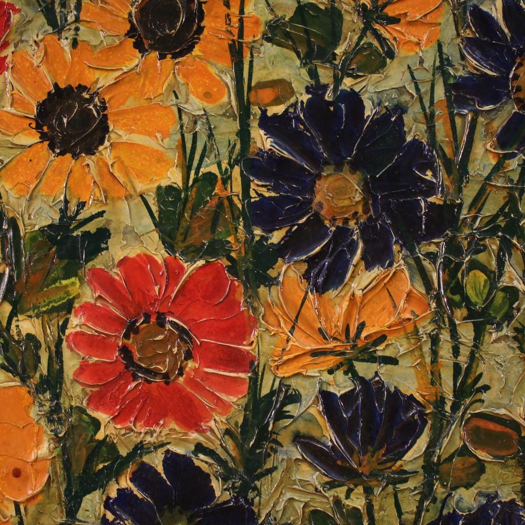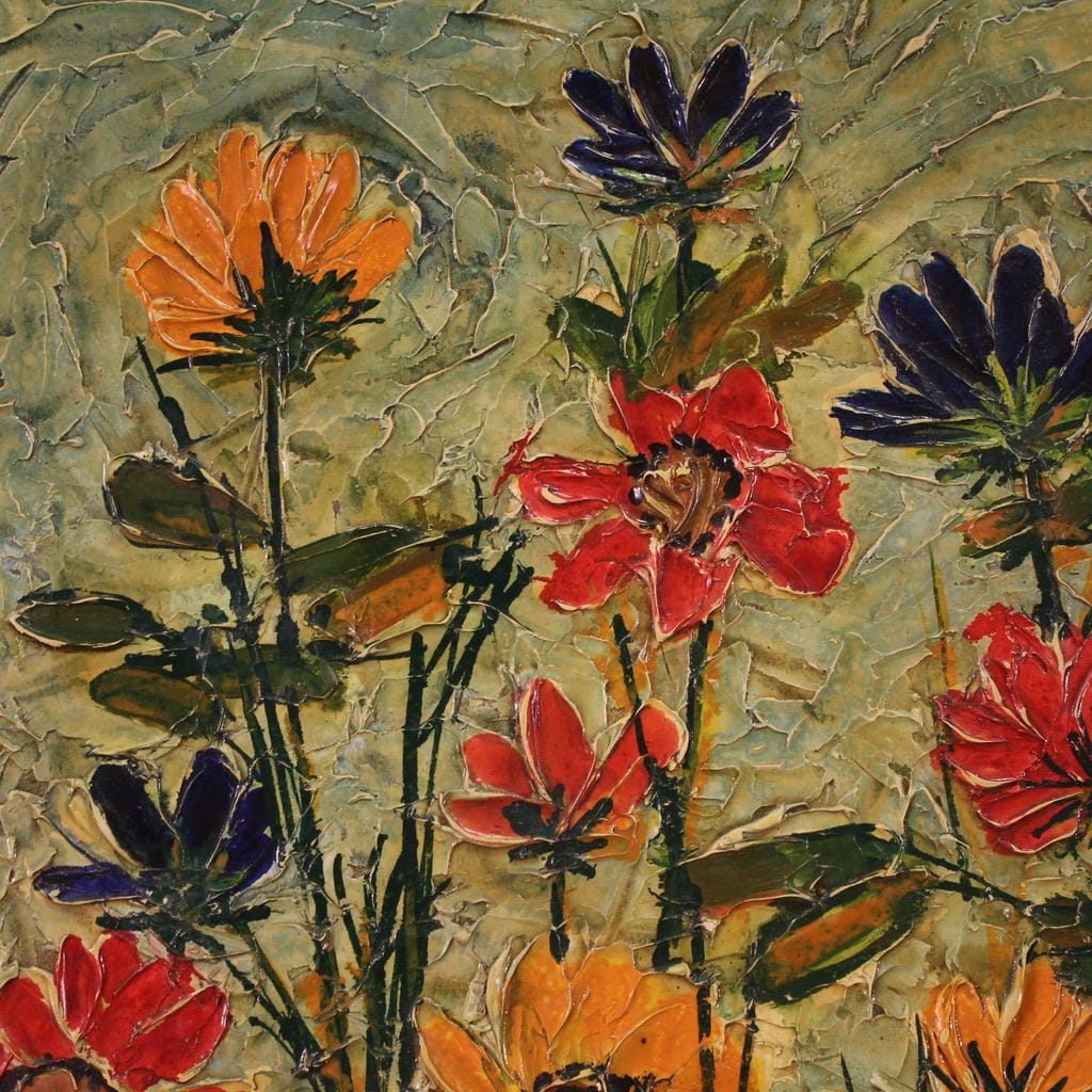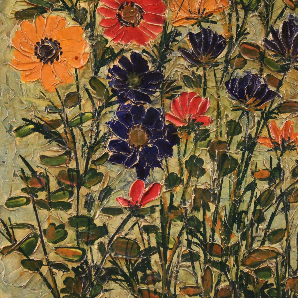 Italian painting from the second half of the 20th century. Oil on plywood panel depicting a still life with flowers in the Impressionist style, featuring excellent pictorial quality. A large, impactful painting, with excellent luminosity and vibrant colors. The artwork is adorned with a simple wooden frame in good condition.