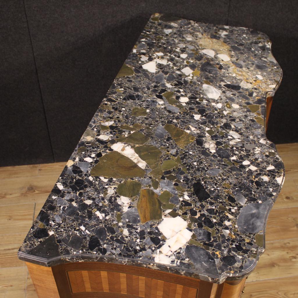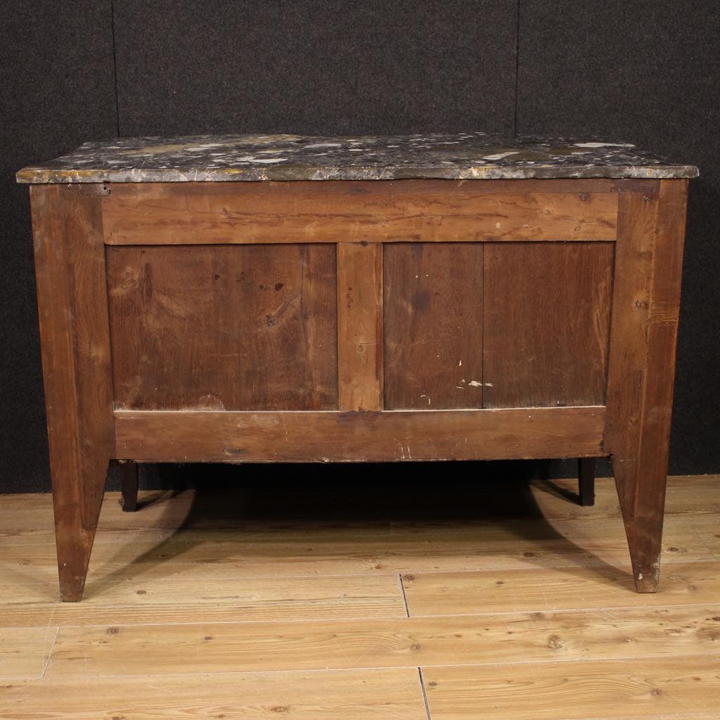 French chest of drawers from the late 19th century. Transition-style furniture, curved front and sides, veneered and inlaid with mahogany, walnut, maple, rosewood, and fruitwood. The commode has three spacious drawers complete with working keys and original locks. The original marble top is in good condition, excellent size, and has been in good condition. A beautifully sized and well-proportioned bedroom or living room dresser, suitable for antique dealers and interior decorators. Standing on four sturdy legs, the commode is in good condition.