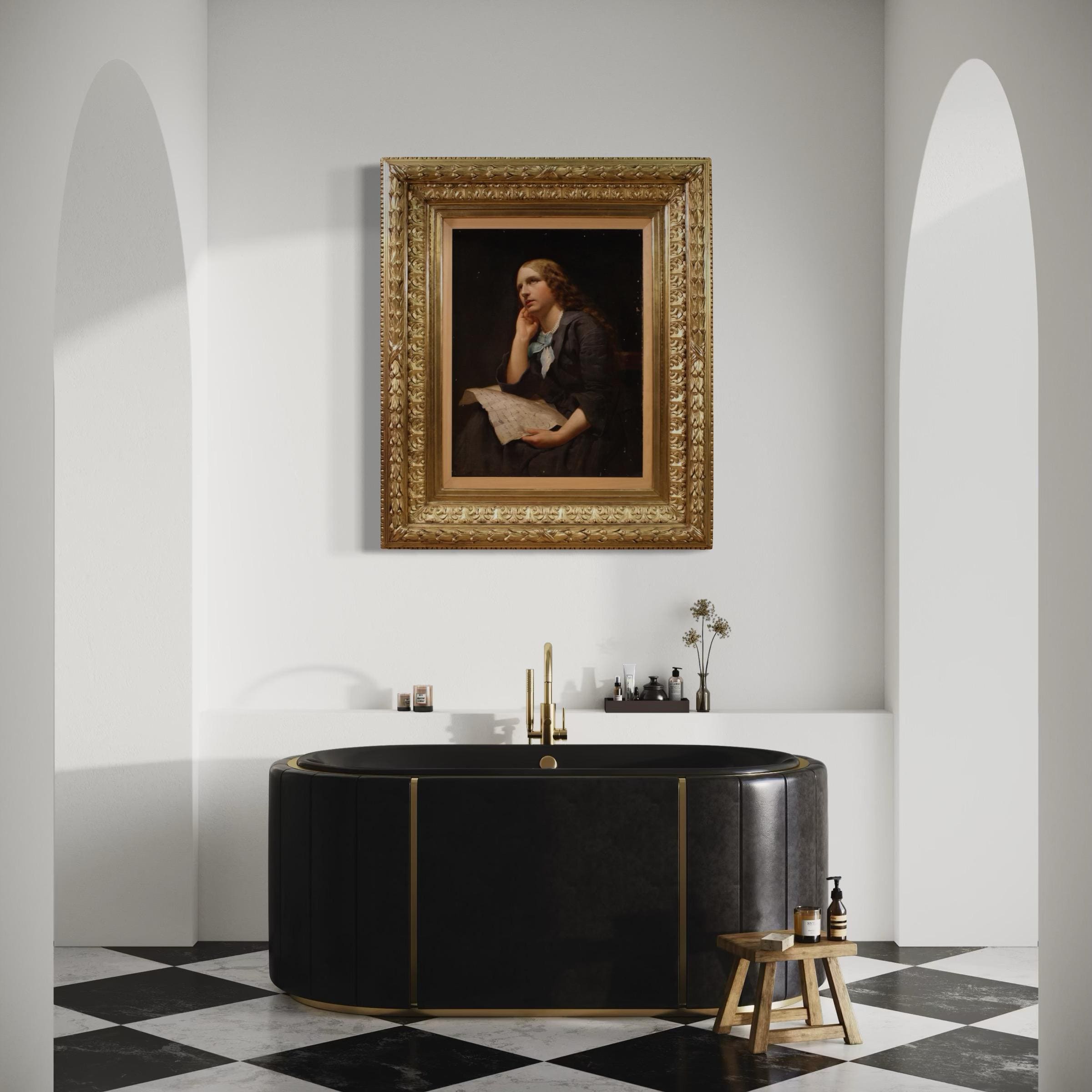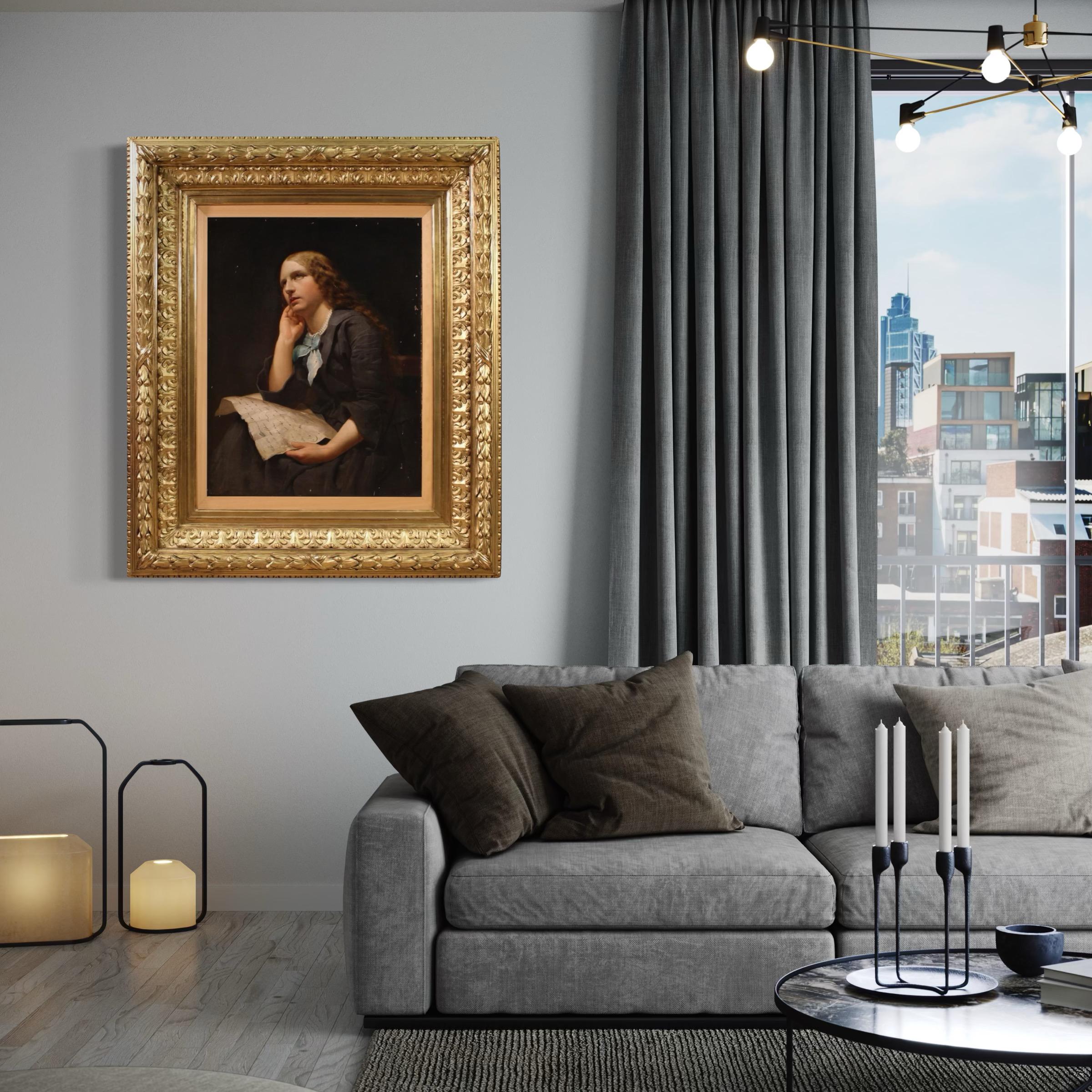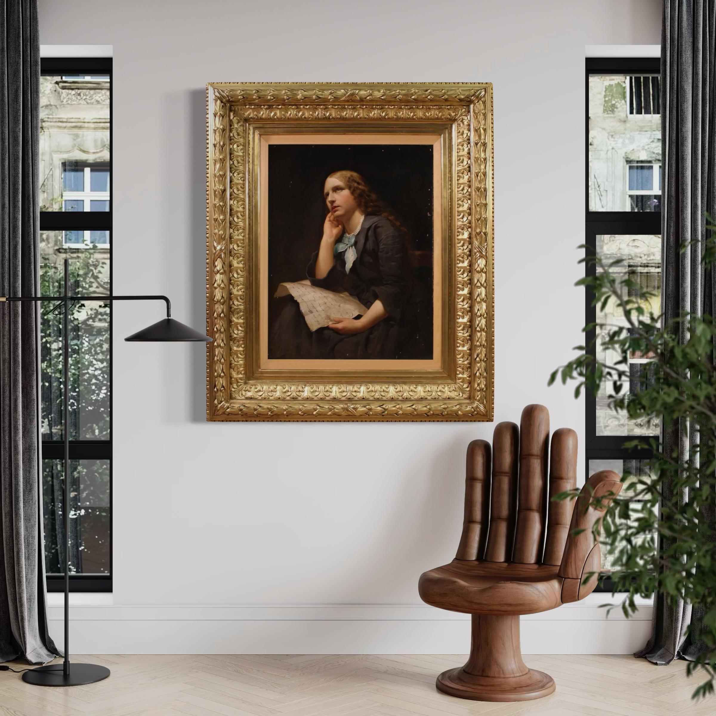 A magnificent 19th-century Italian painting. Oil on canvas, first canvas, painting depicting a young woman absorbed in thought, of extraordinary pictorial quality. The girl with long blond hair is dressed simply with a delicate blue ribbon around her neck. She is captured in a moment of deep meditation, holding a sheet of paper in her hands, likely a letter from her distant lover.