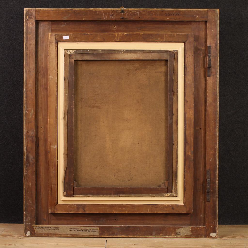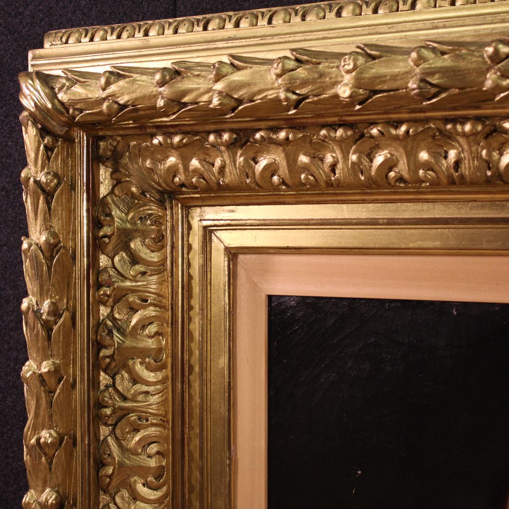 A large painting, ideal for classical or contemporary settings where a hint of grace and poetic contemplation is desired. Spectacular 20th-century frame in finely carved and gilded wood, highly decorative, with some signs of aging. A small wooden mat was used to fit the painting into a non-contemporary frame. The painting has some minor paint drops (see photo), but is generally in good condition. Internal dimensions: H 90 x W 70 cm.