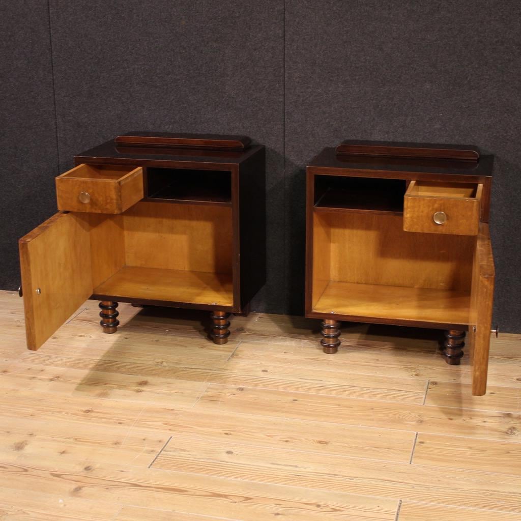 Pair of Italian bedside tables from the 1960s and 1970s. Carved and veneered furniture in mahogany, burl, and fruitwood, of fabulous lines and excellent service. They have a drawer, an open compartment, and a door, offering plenty of storage space. The wooden top is adorned with a rounded shelf (see photo).