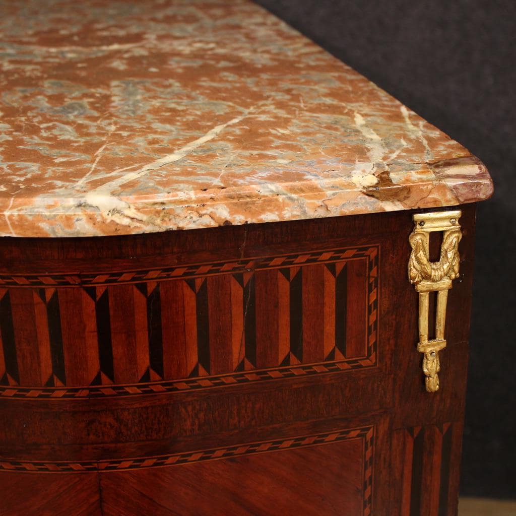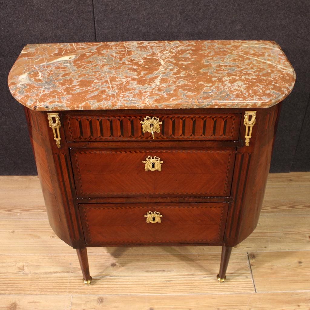 Small French commode from the second half of the 19th century. This Napoleon III-era dresser is finely veneered and inlaid with geometric decorations in mahogany, maple, walnut, ebonized wood, and fruitwood, of beautiful lines and proportions. The original marble top is of good size and serviceable. The marble has undergone a small restoration in the back right corner (see photo).