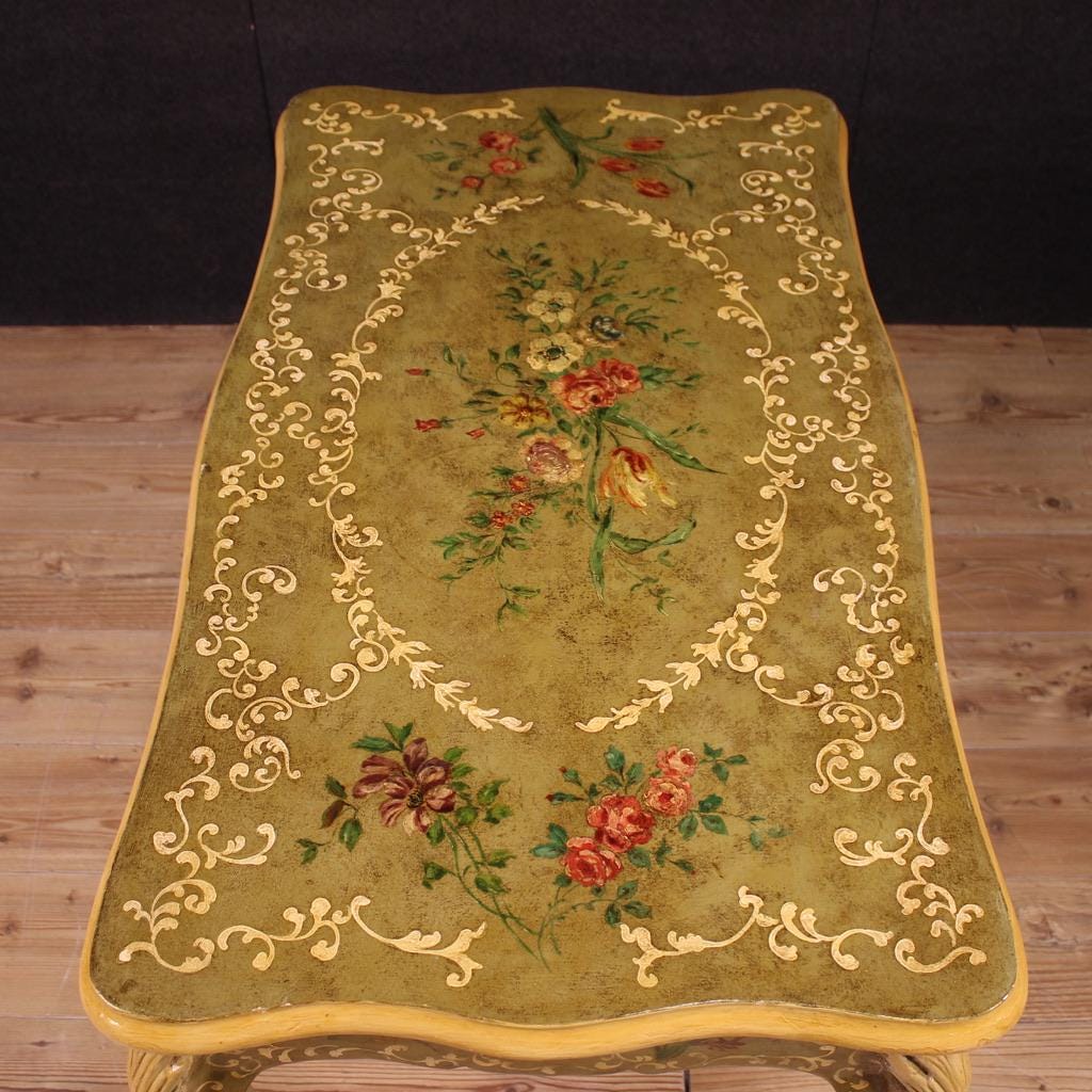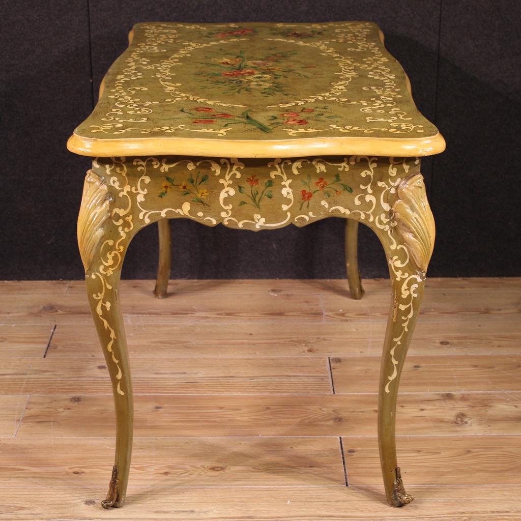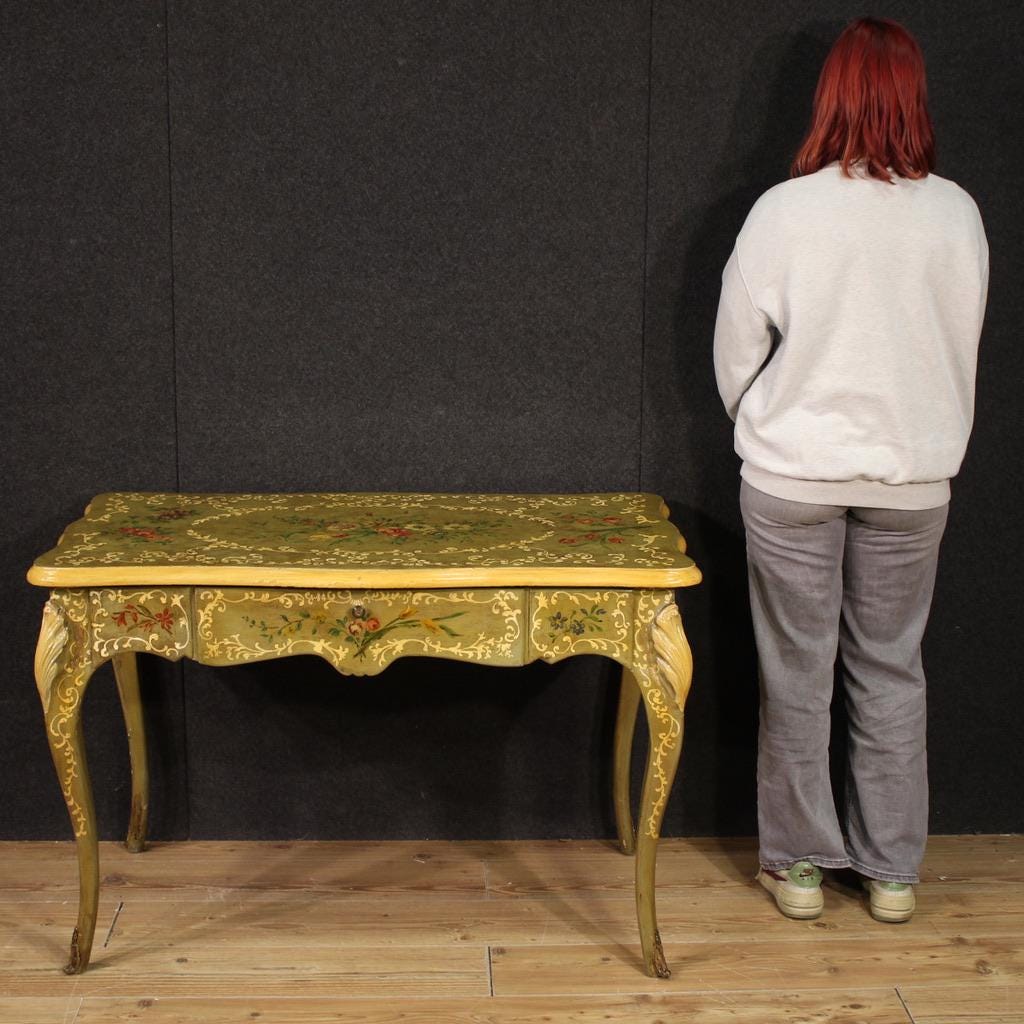 French writing desk from the mid-20th century. Beautifully proportioned and beautifully crafted furniture is crafted from carved, lacquered, and hand-painted wood with floral decorations. Desk finished for the center features a generously sized front drawer and a generously sized wooden top, also suitable for professional use. This elegant writing desk rests on four sturdy, curved legs. The feet are decorated with bronze (see photo). This desk is ideal for a bedroom, living room, or study, and is ideal for antique dealers and interior decorators. In good condition.