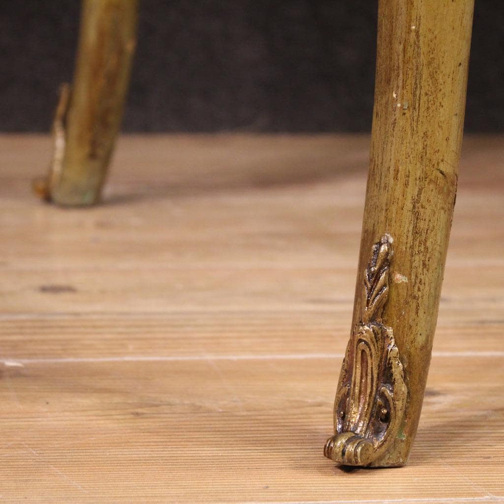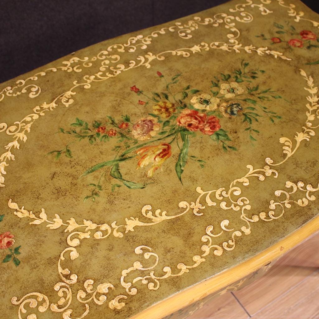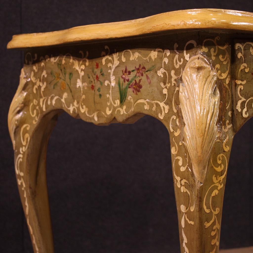 French writing desk from the mid-20th century. Beautifully proportioned and beautifully crafted furniture is crafted from carved, lacquered, and hand-painted wood with floral decorations. Desk finished for the center features a generously sized front drawer and a generously sized wooden top, also suitable for professional use. This elegant writing desk rests on four sturdy, curved legs. The feet are decorated with bronze (see photo). This desk is ideal for a bedroom, living room, or study, and is ideal for antique dealers and interior decorators. In good condition.