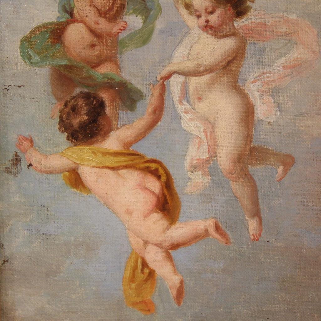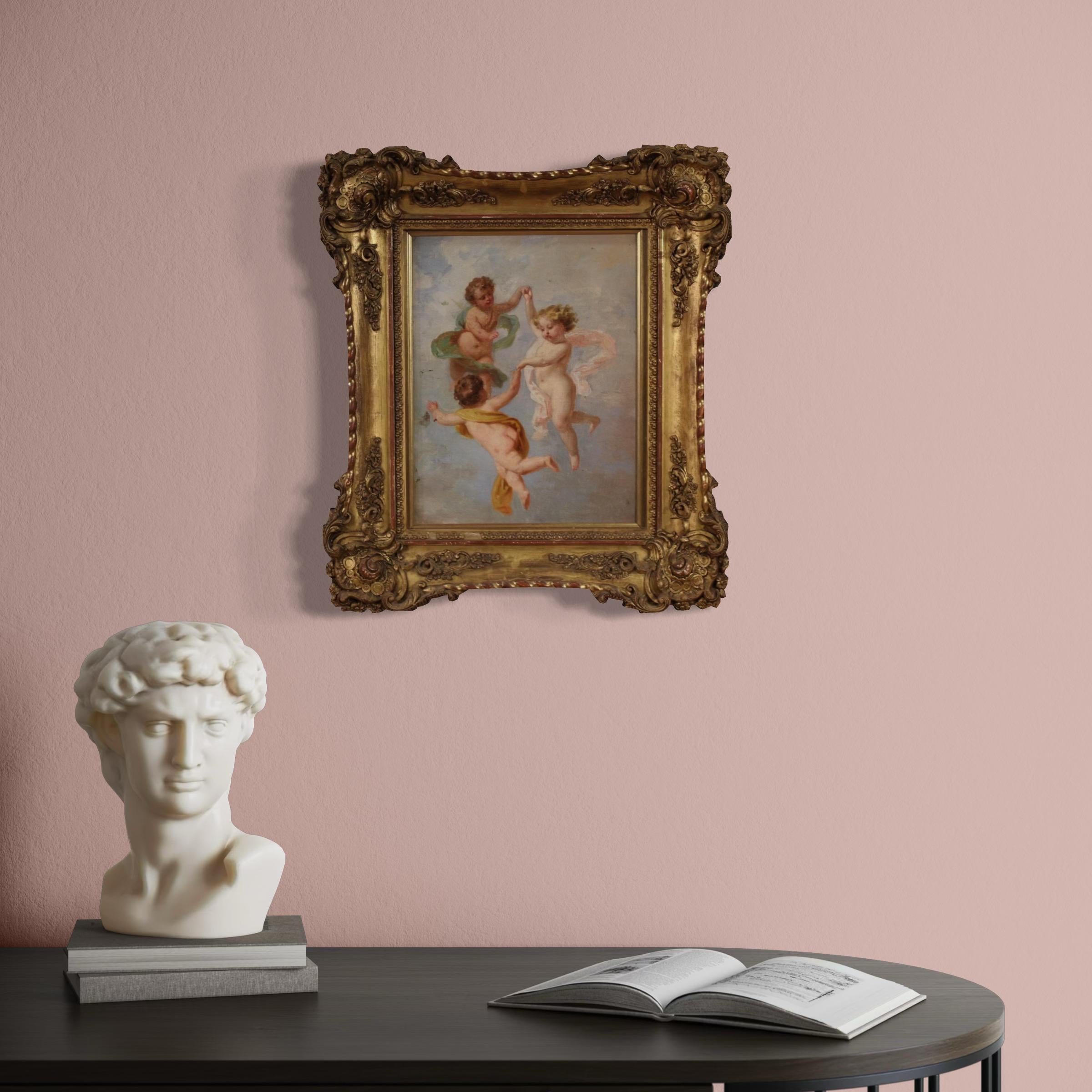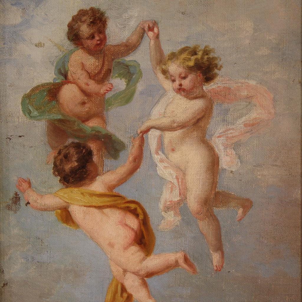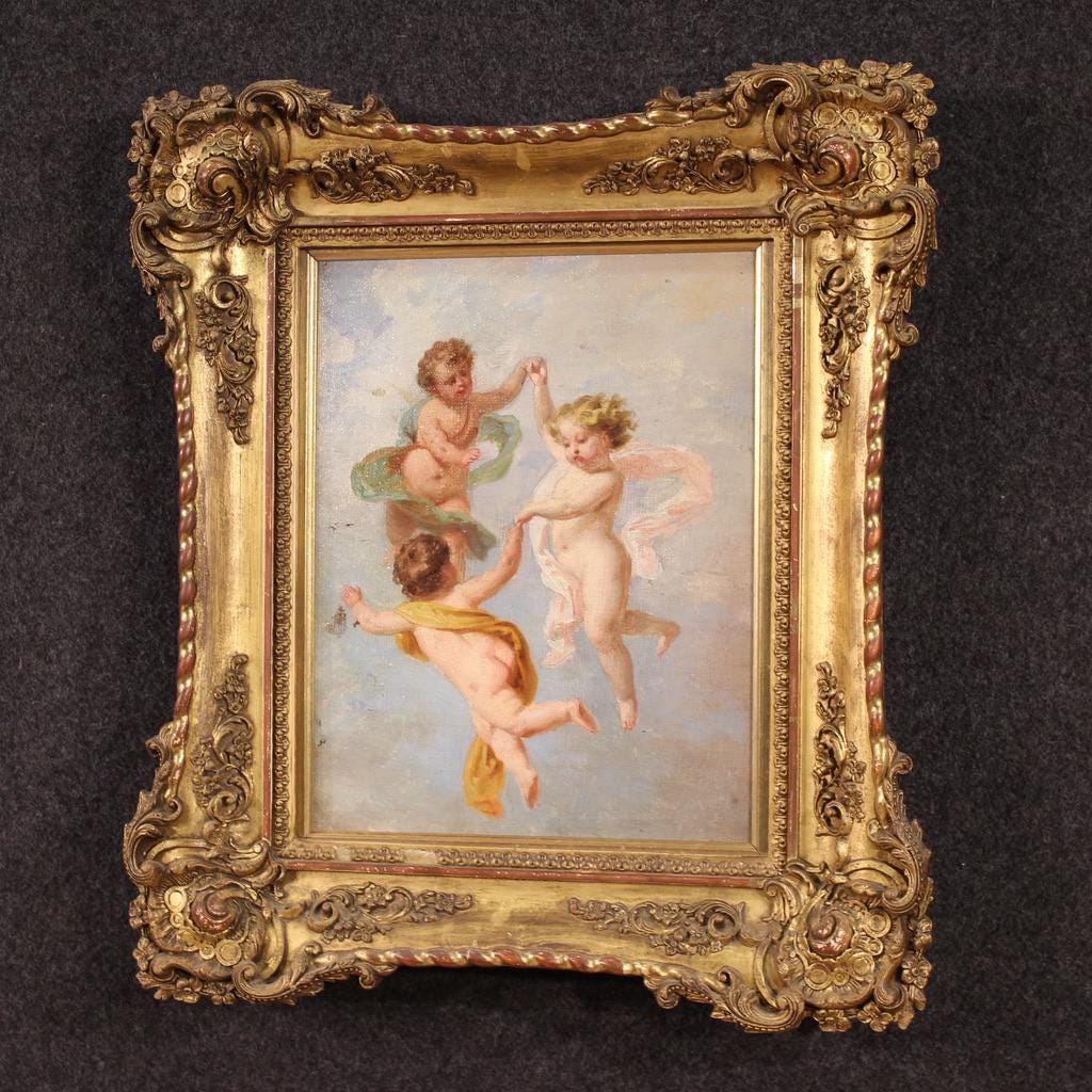 A refined Italian painting from the second half of the 19th century. An oil on canvas artwork depicting dancing cherubs, crafted with excellent quality. The painting is adorned with an elegant contemporary wood and plaster frame, finely carved and gilded. The painting, set against a light background, offers excellent luminosity, with well-preserved colors and is protected by glass.