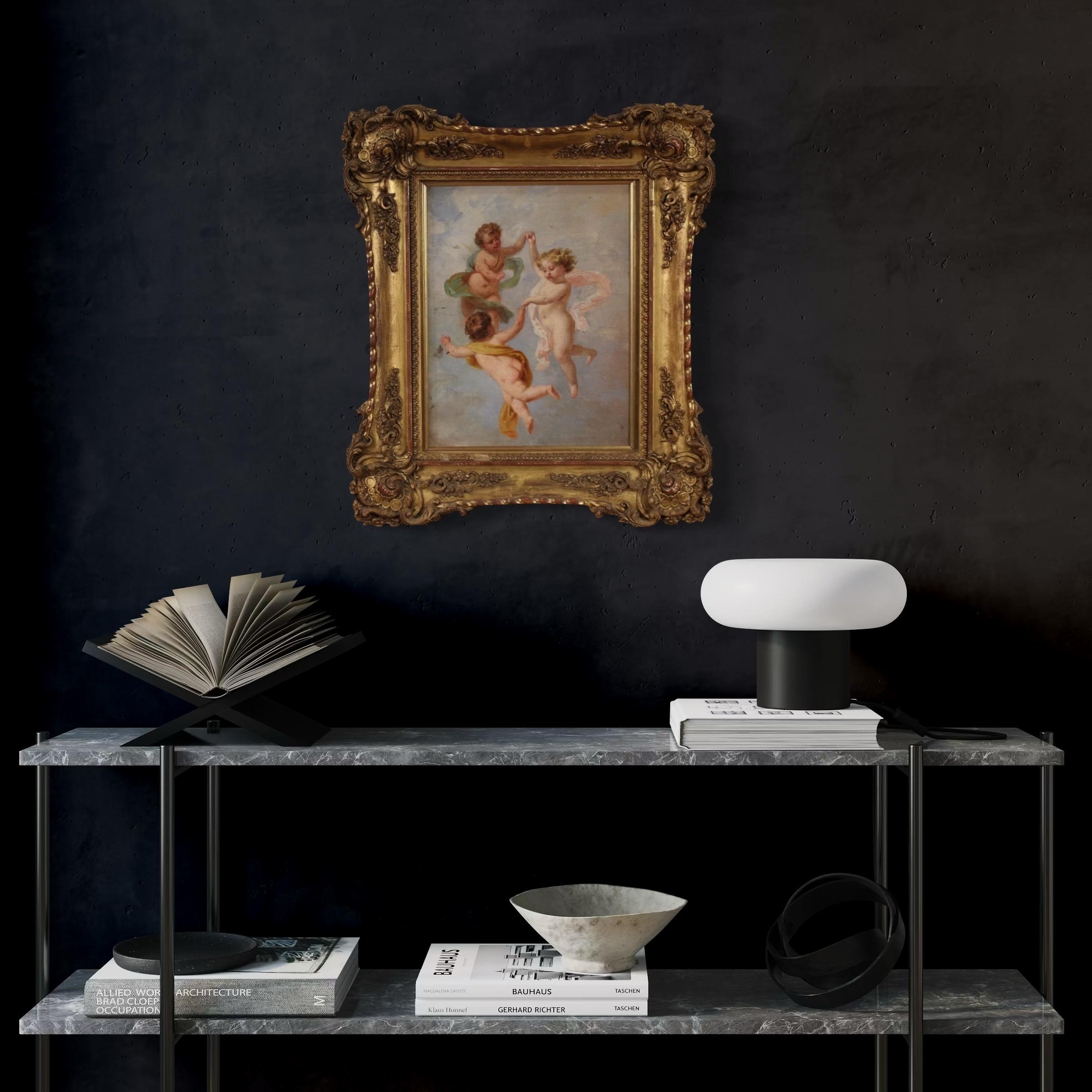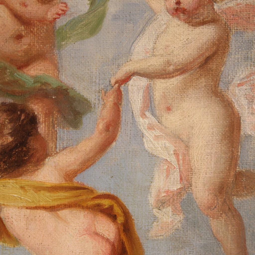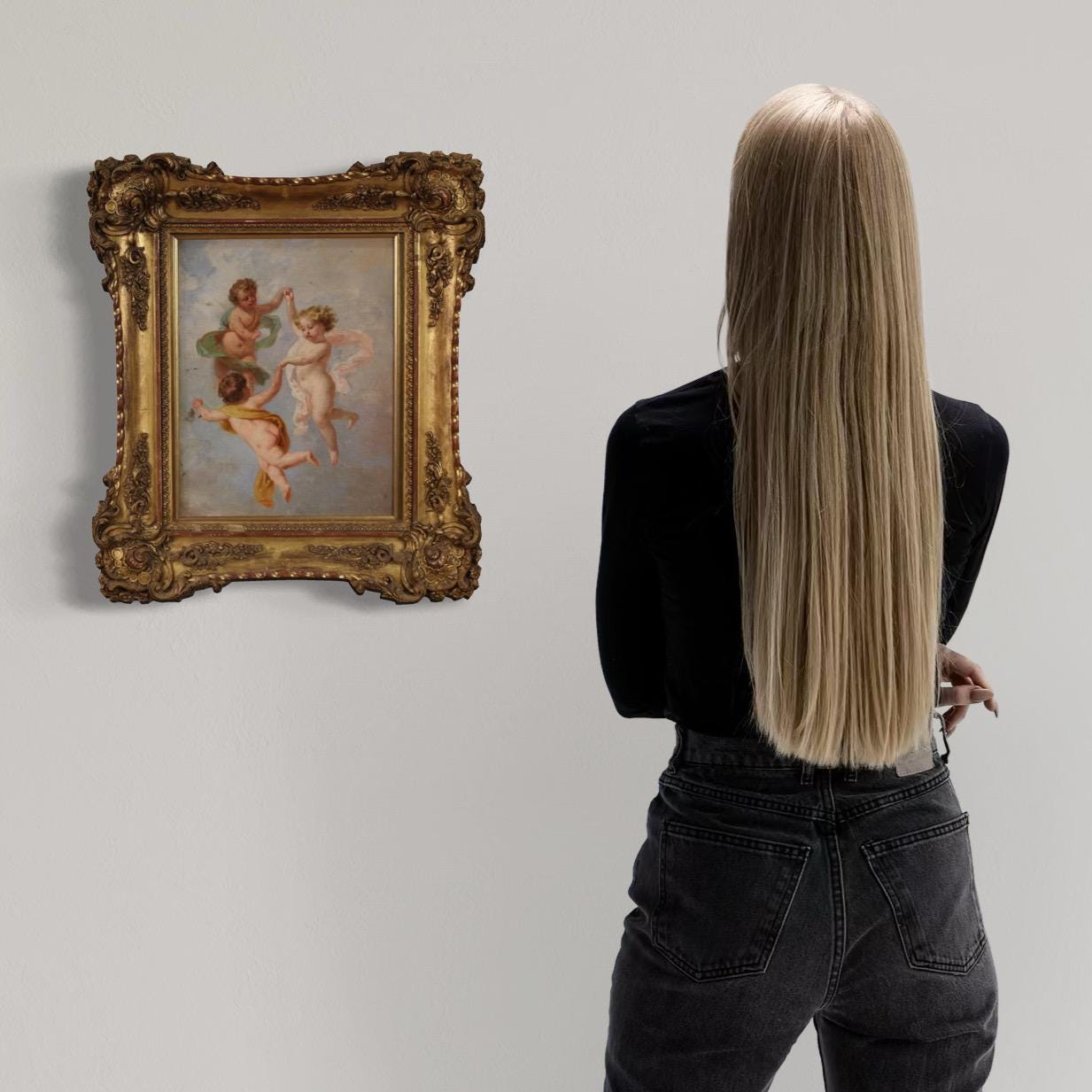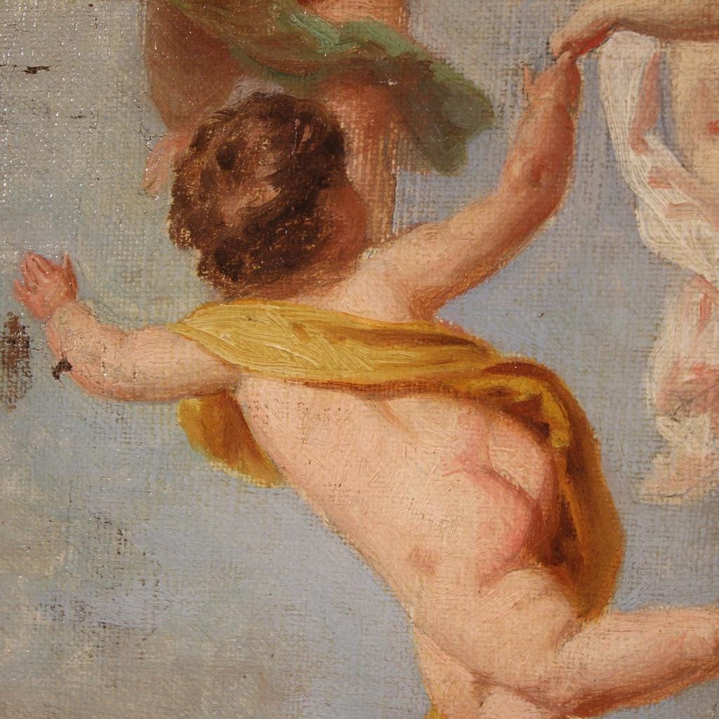 A refined Italian painting from the second half of the 19th century. An oil on canvas artwork depicting dancing cherubs, crafted with excellent quality. The painting is adorned with an elegant contemporary wood and plaster frame, finely carved and gilded. The painting, set against a light background, offers excellent luminosity, with well-preserved colors and is protected by glass.