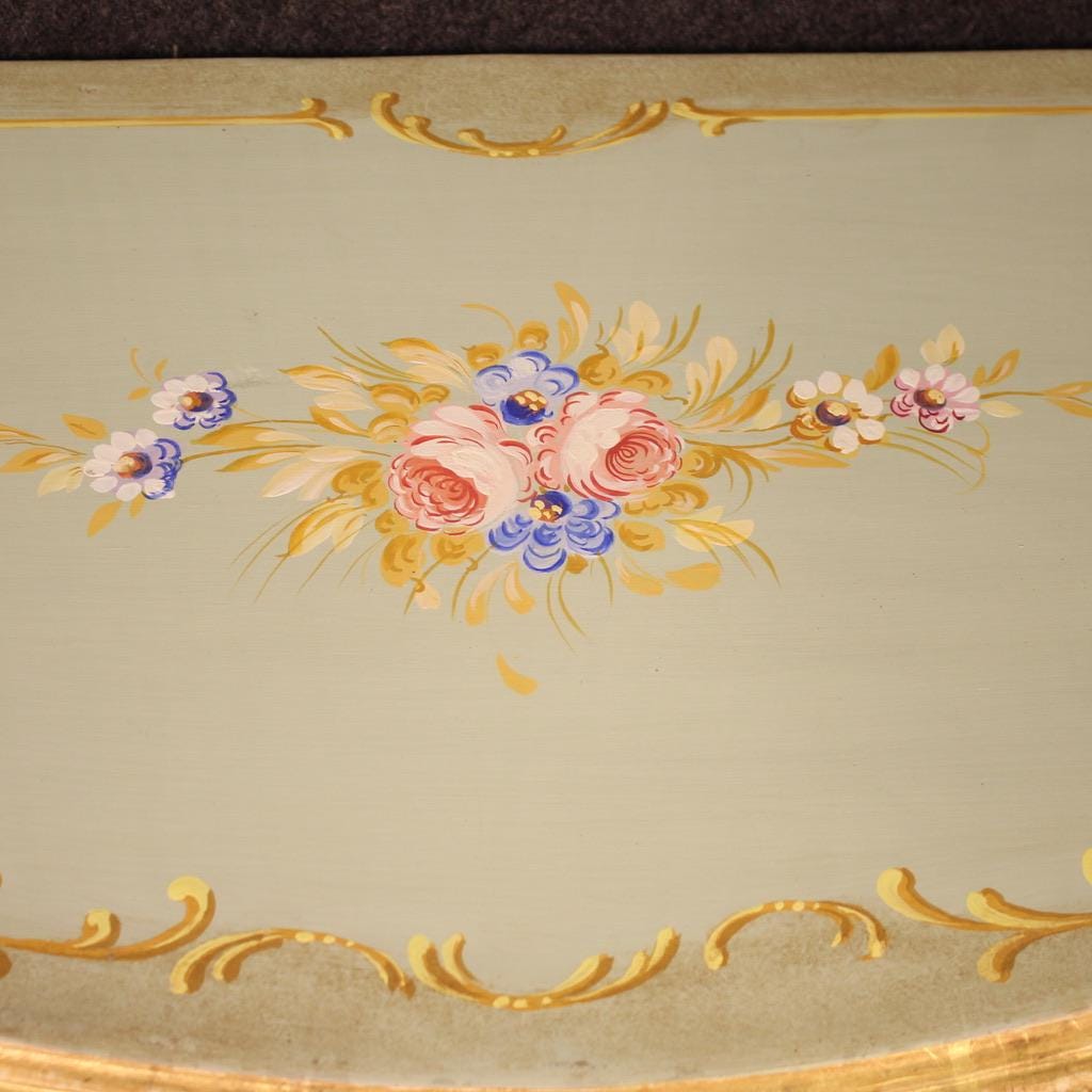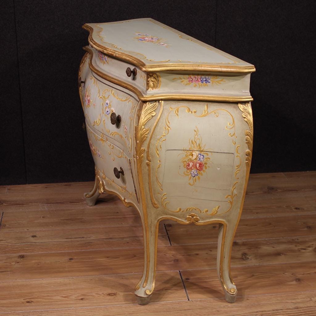 An elegant Venetian dresser from the mid-20th century. This curved furniture is finely carved, lacquered, gilded, and painted with exquisite floral decorations. It has three drawers and a wooden top, of good size and function. This well-proportioned bedroom or living room commode is ideal for antique dealers and interior decorators.