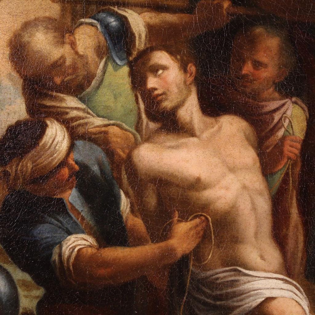 A splendid 17th-century Italian painting. This painting oil on canvas depicts a dramatic scene, a Saint bound and presented to torture before his imminent martyrdom. The composition is structured on two levels: the mass of executioners at the bottom, and the architectural layout, reminiscent of an ancient Roman city, at the top. The scene is constructed with a strong theatrical sense, with the young, half-naked saint at the center, illuminated by a warm, grazing light that creates a sense of movement, sculpting his muscles.