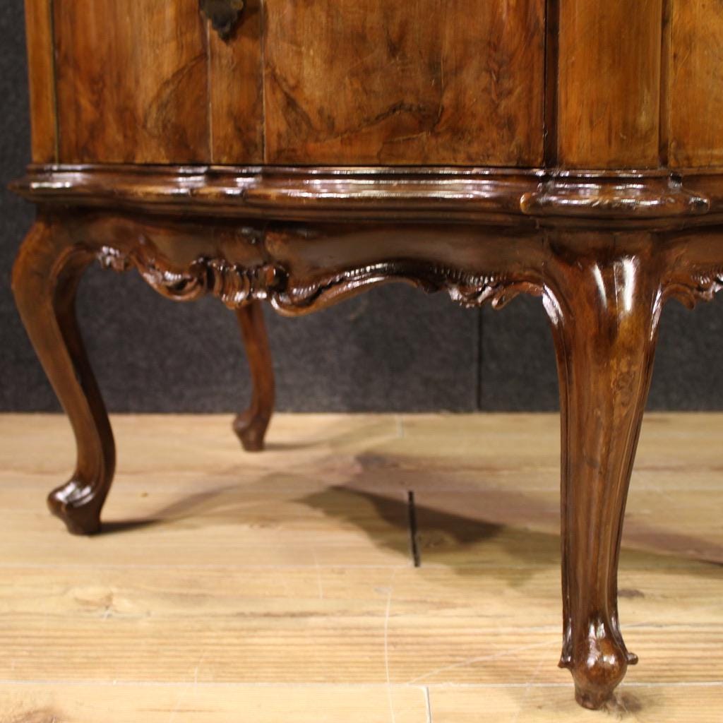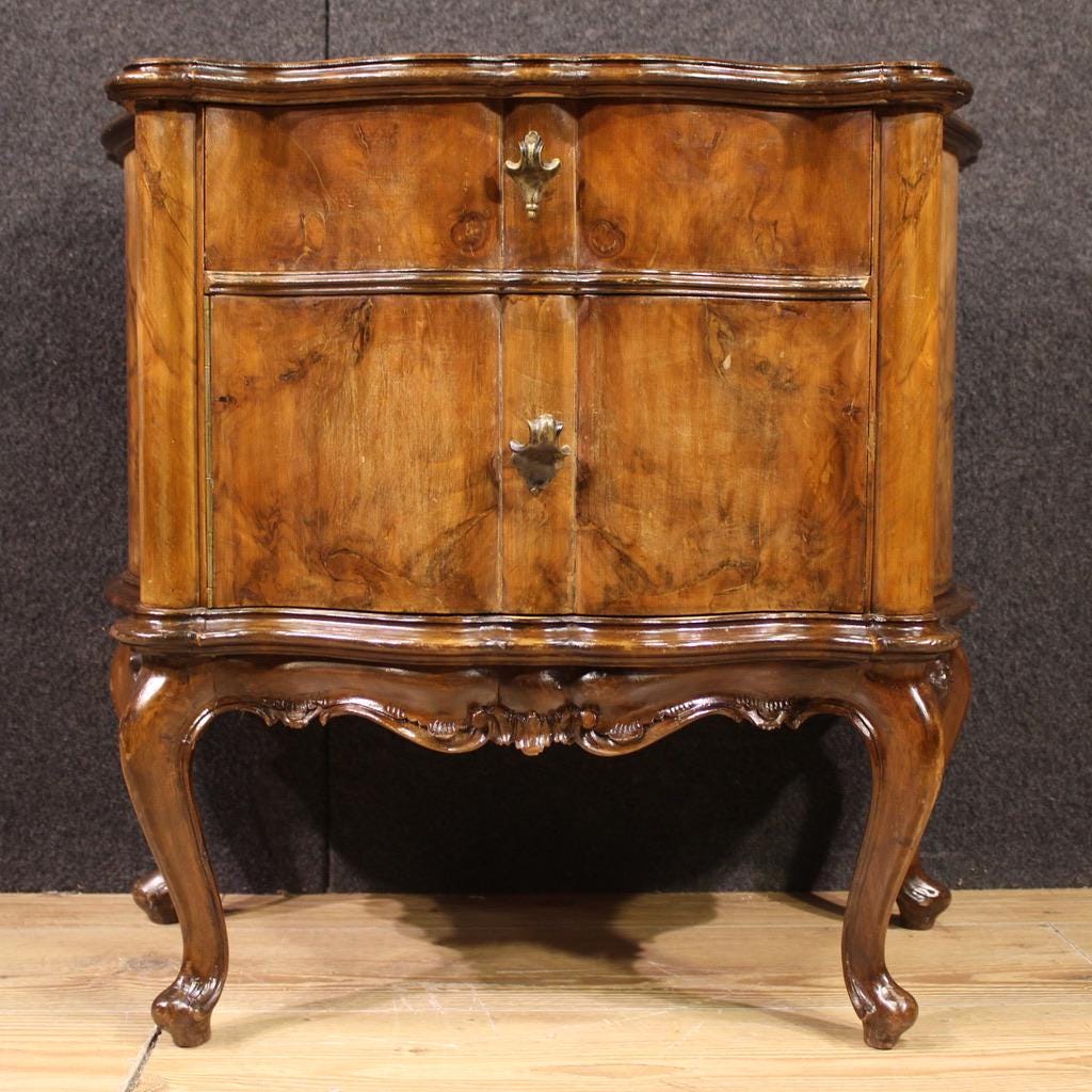 Pair of Venetian bedside tables from the mid-20th century. Beautifully carved and veneered in walnut and beech bedside tables with curved fronts and sides, attractively designed and attractively furnished. They have a drawer and a door, offering ample storage space.