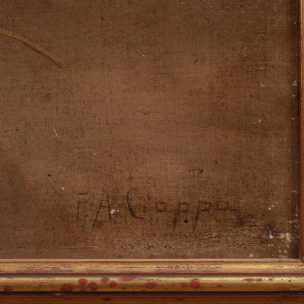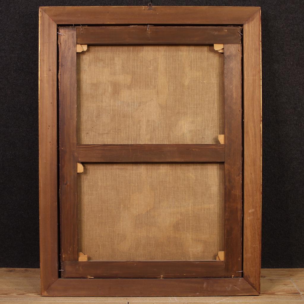 The painting was covered with glass for several years (now missing), and therefore features very vibrant and vivid colors. The artwork comes complete with a non-contemporary 20th-century carved and gilded frame in good condition. The painting has undergone conservative restoration and relining. Overall, it is in good condition. Internal dimensions: H 96.5 x W 70.5 cm.