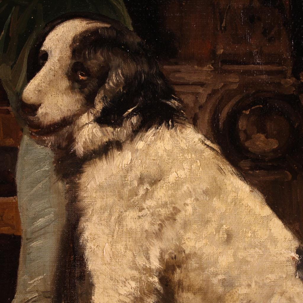 Antique 19th-century Italian painting. Oil on canvas artwork depicting a man in a tavern with a dog, well-crafted. A finely sized and attractively decorated painting, signed lower right (see photo), attributed to the painter Federico Alessandro Ciappa (1766-1826). Authentication is missing. This vertically arranged painting is enriched with numerous details (see photo). It is suitable for antique dealers and collectors.