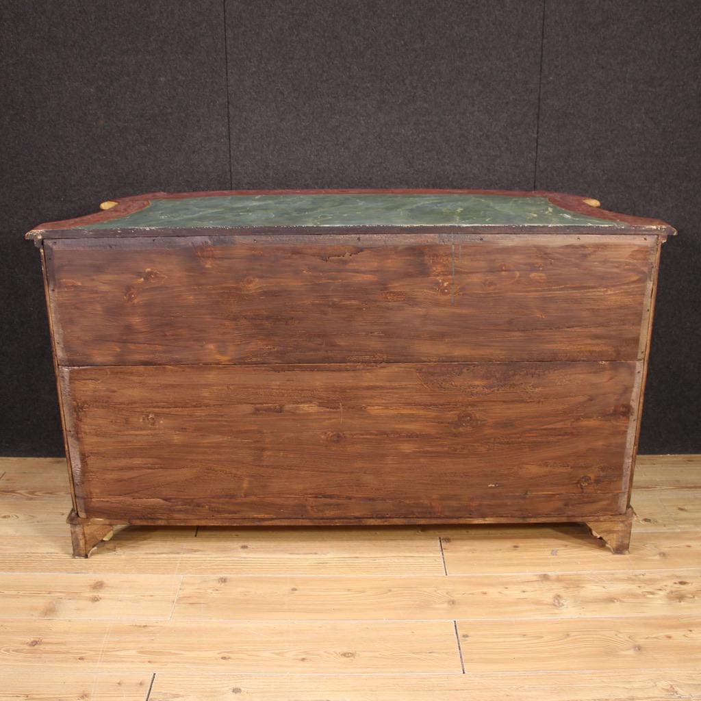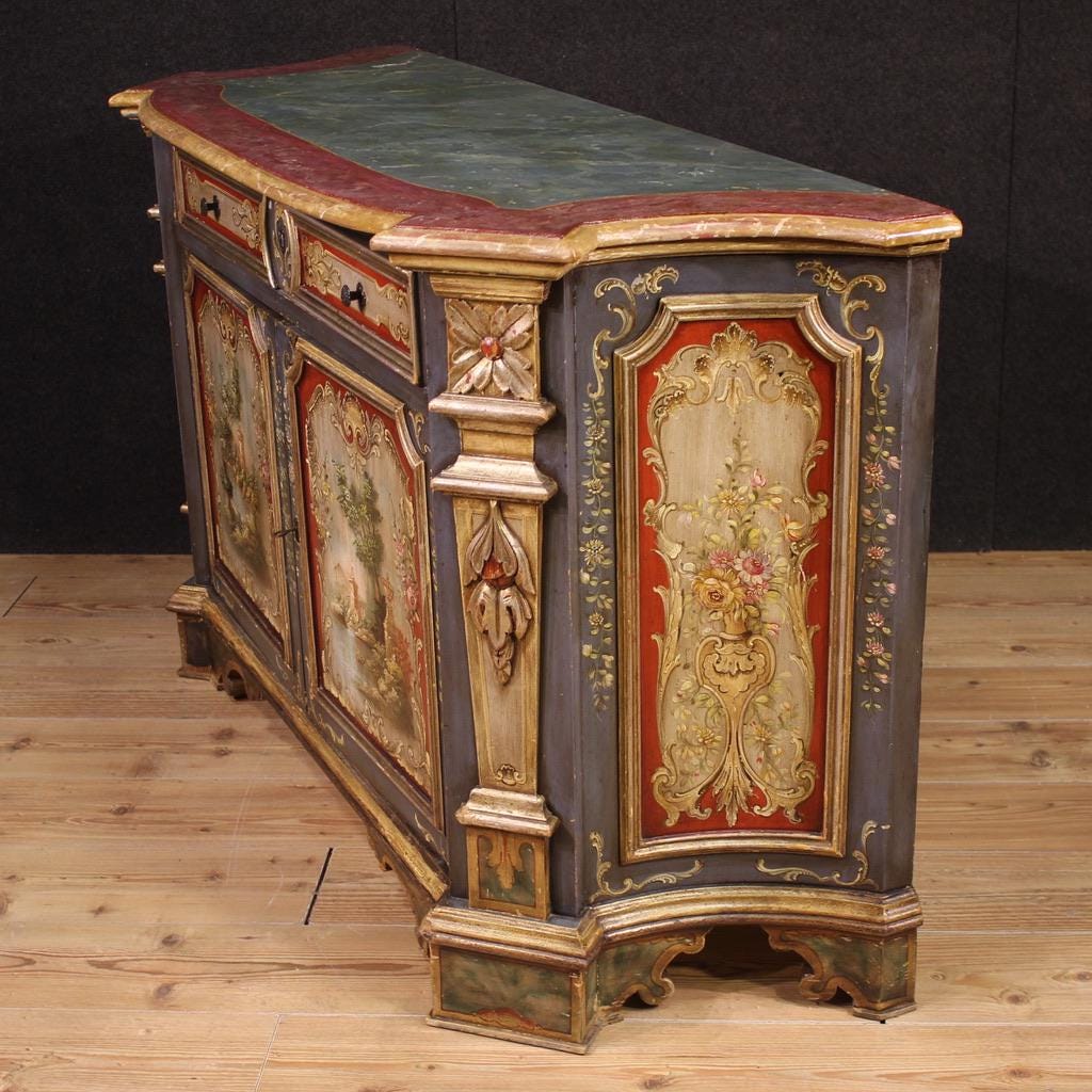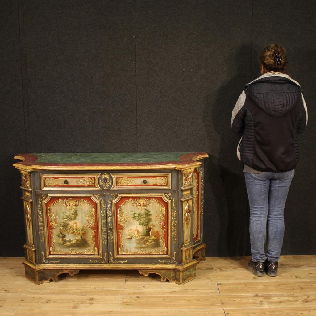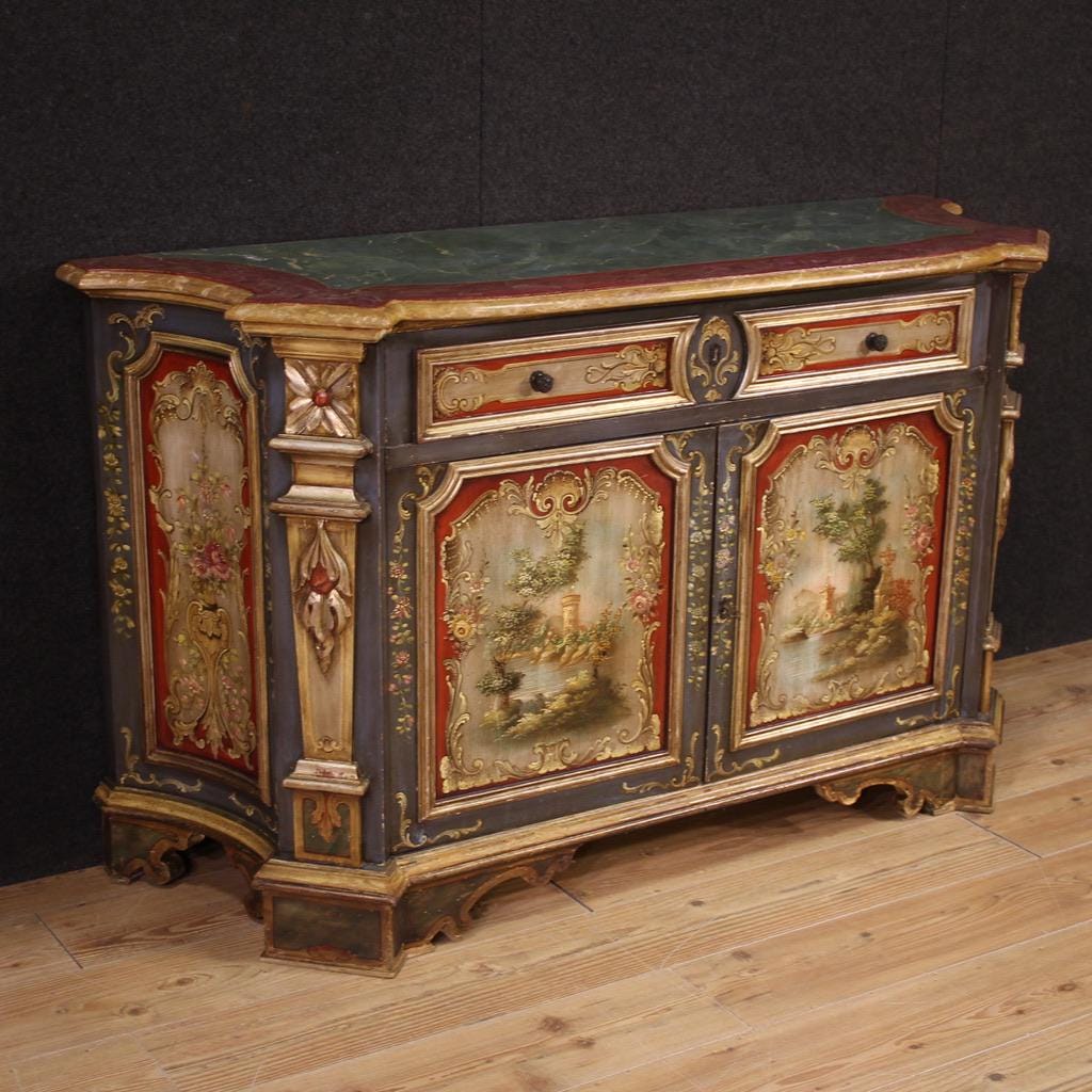 Venetian sideboard from the second half of the 20th century. Carved, lacquered, and hand-painted wood furniture with floral and architectural landscape decorations on the doors. The sideboard features two doors and one generously sized drawer. The wooden top is lacquered in a faux marble finish, making it a generously sized and useful furniture.