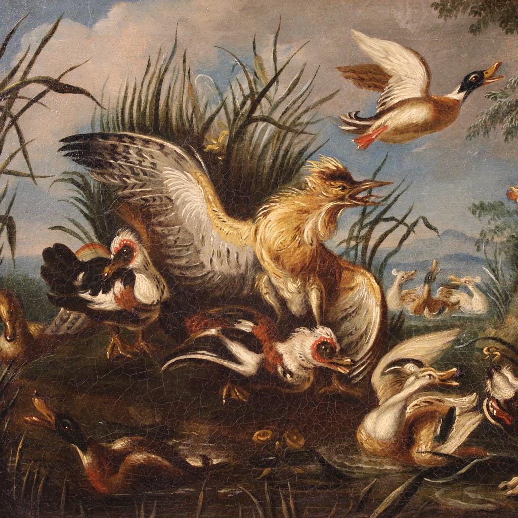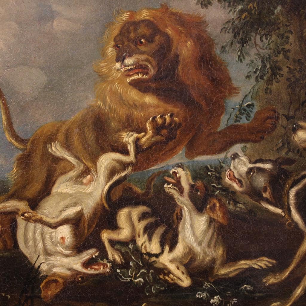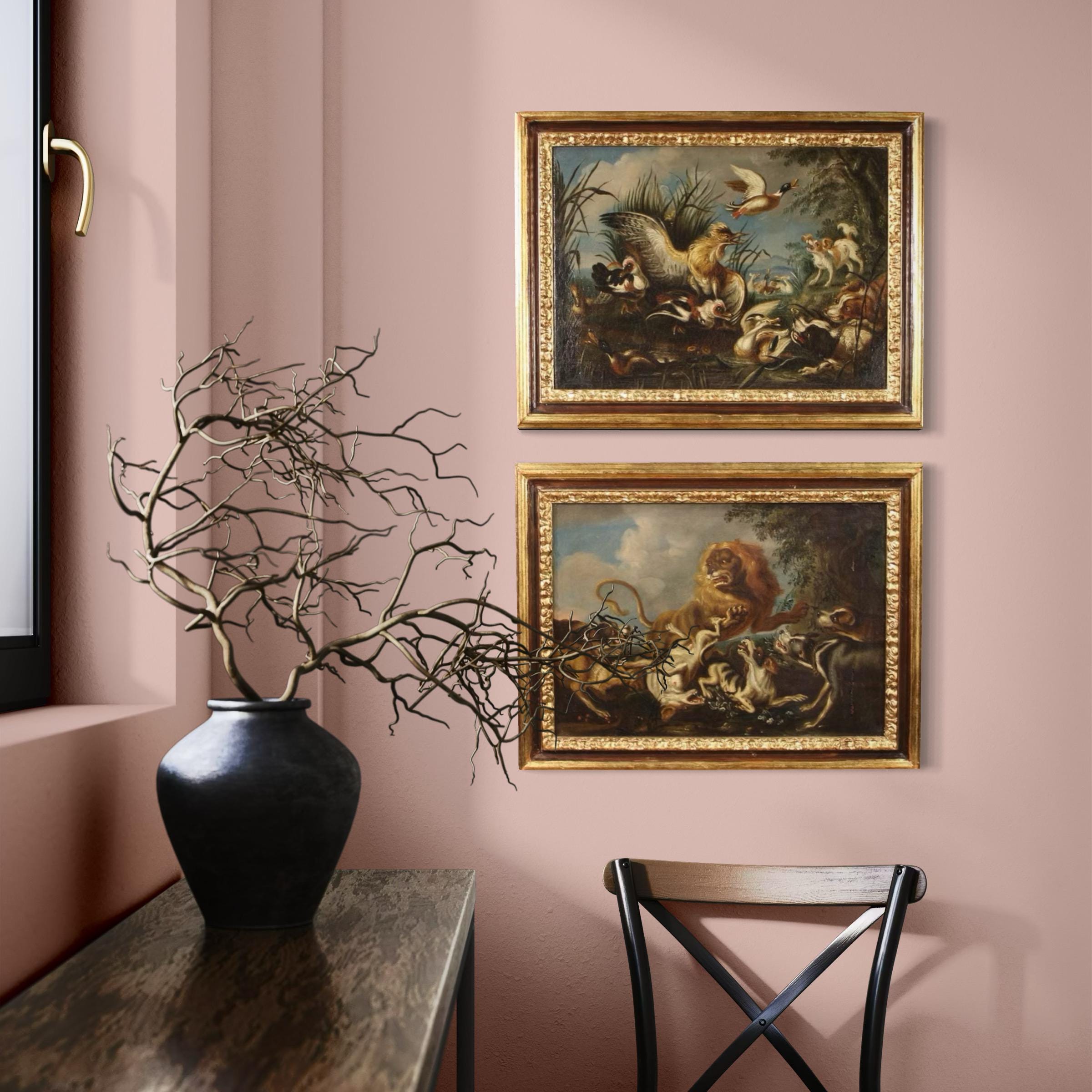 A magnificent pair of 18th-century Flemish paintings. Oil on canvas artworks depict two splendid still lifes: a lion hunt and a bird hunt. In the first, the king of the savannah impetuously confronts a pack of hunting dogs; in the second, the violence transforms into a whirlwind of feathers, a watery landscape vibrant with movement and light.