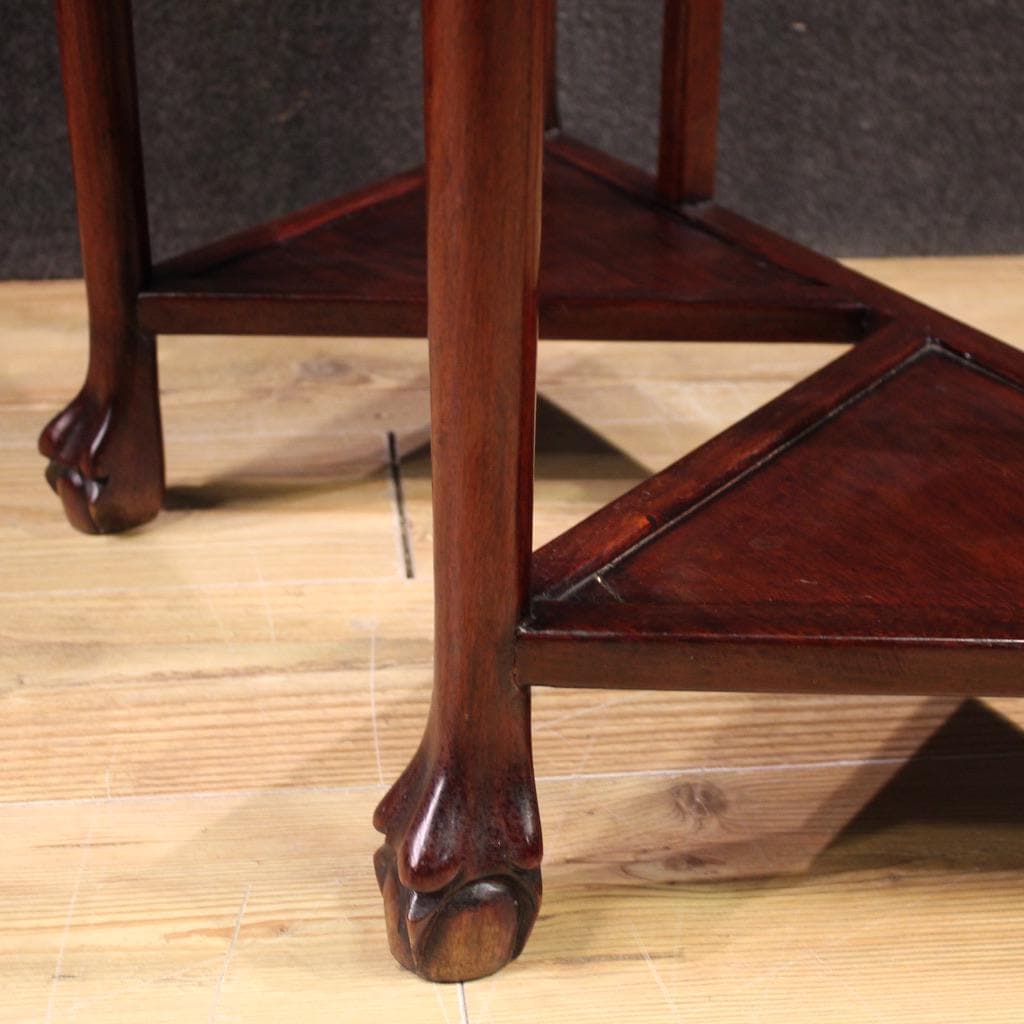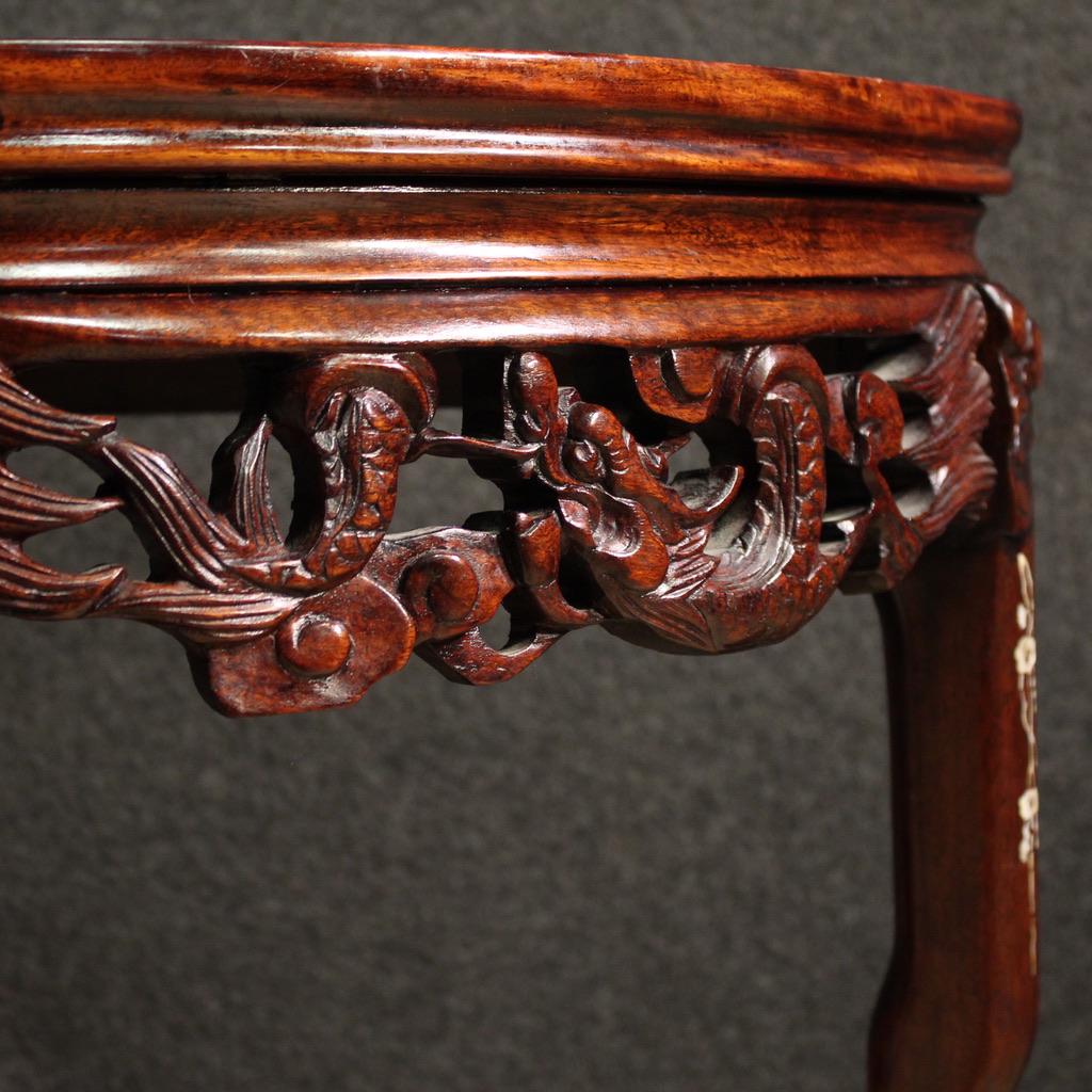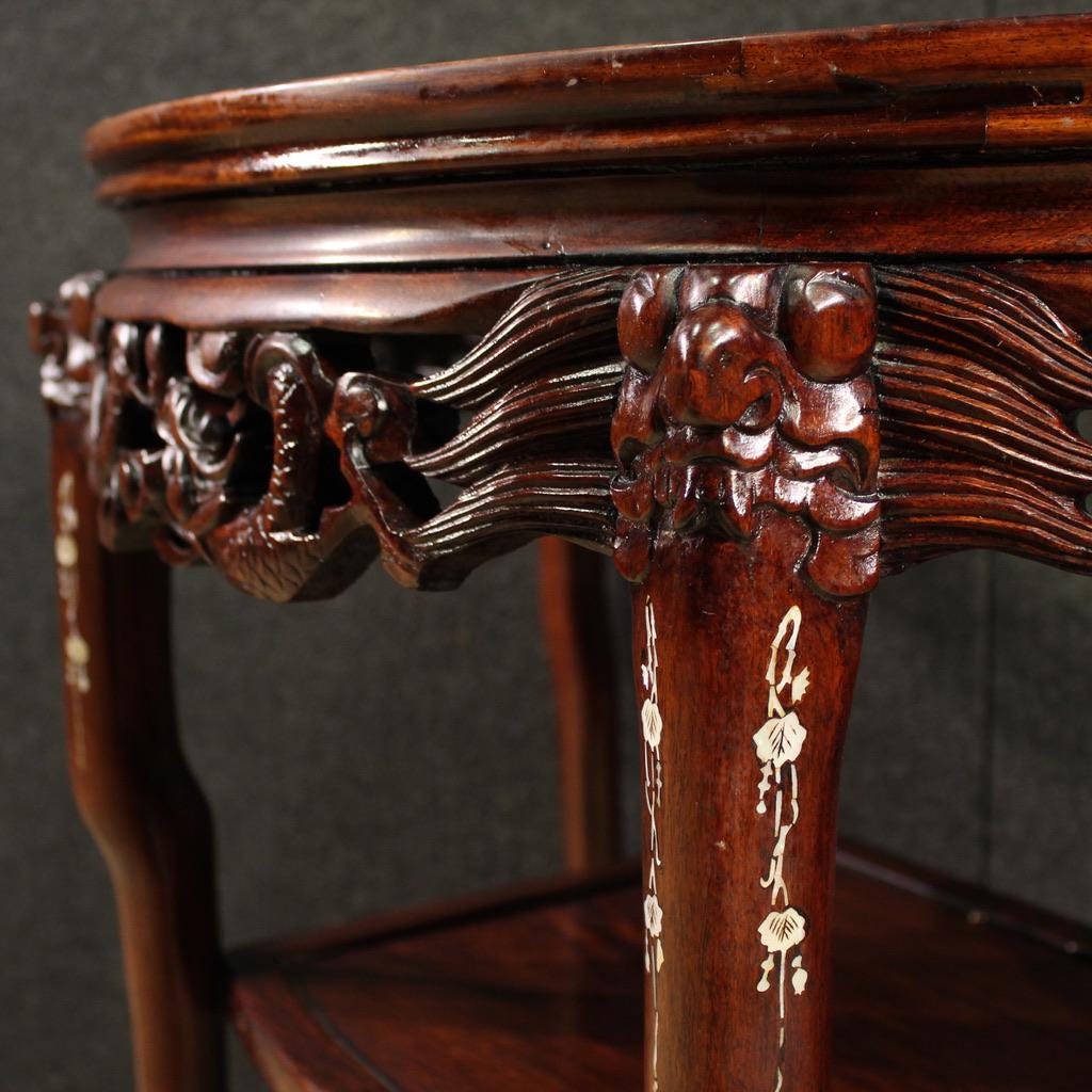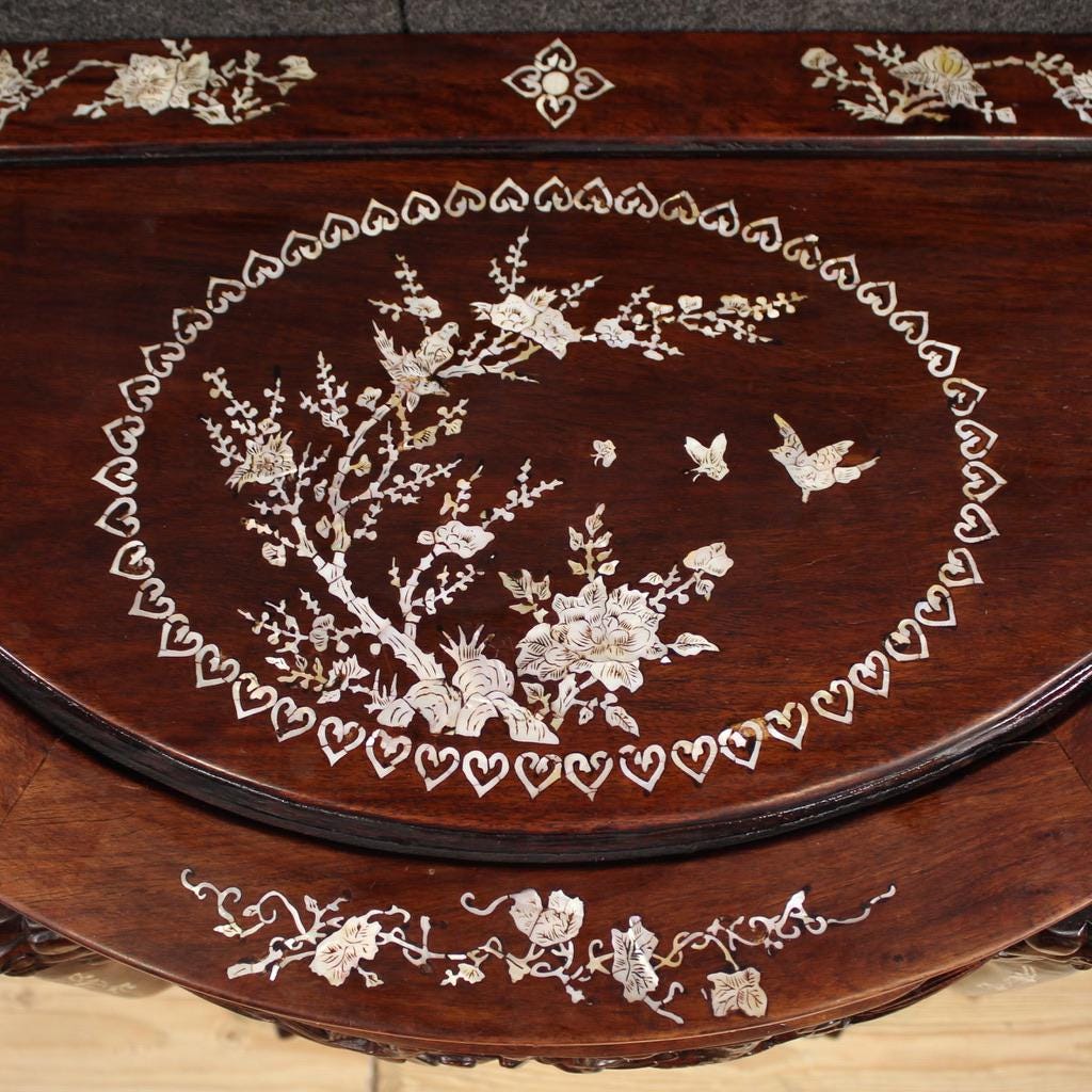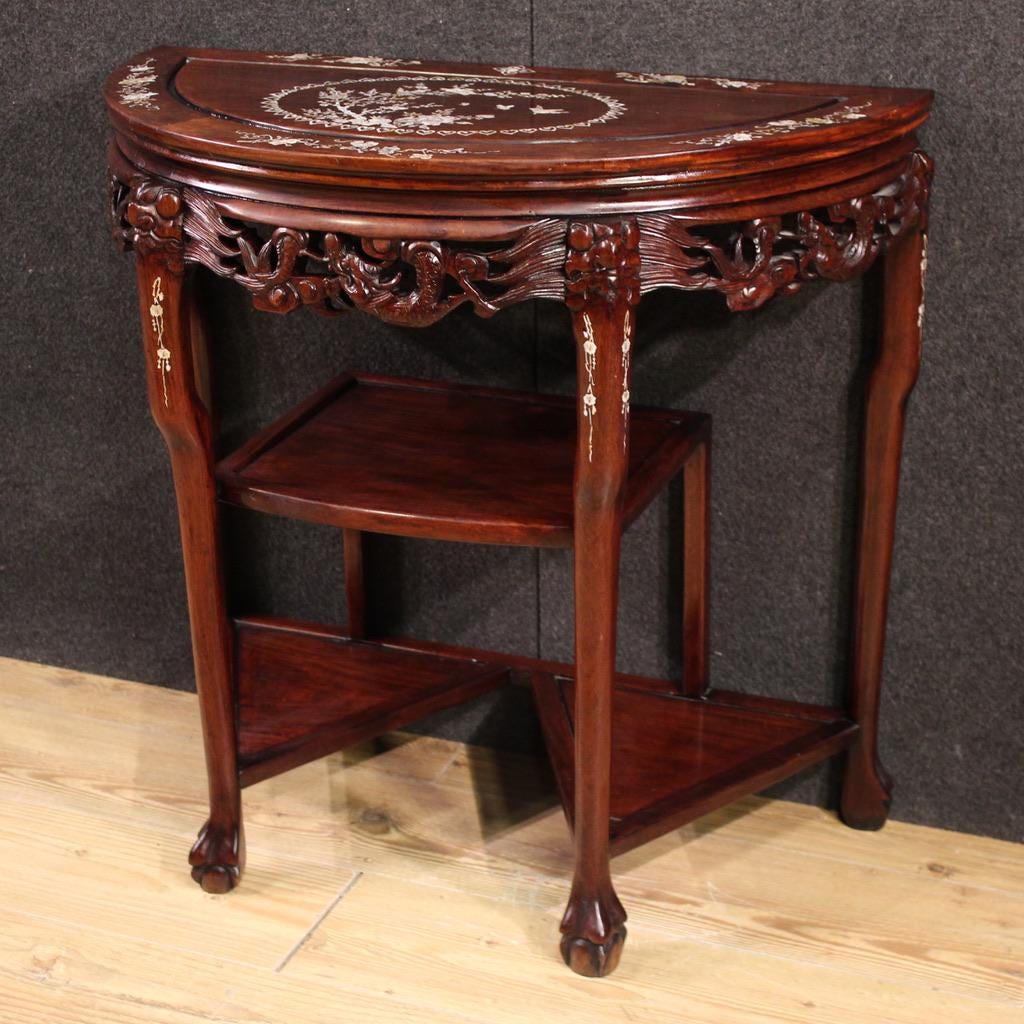 20th-century Chinese console table. Carved and inlaid in exotic wood with a mother-of-pearl effect decorations, of excellent quality. A half-moon console table with two triangular shelves at the bottom, a rectangular top in the middle, and a wooden top, finely inlaid with floral and animal decorations. It is of good size and serviceable.