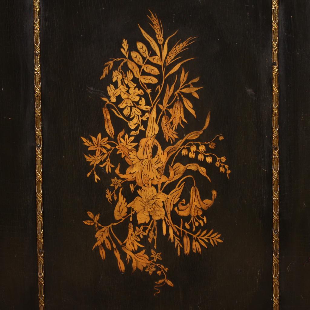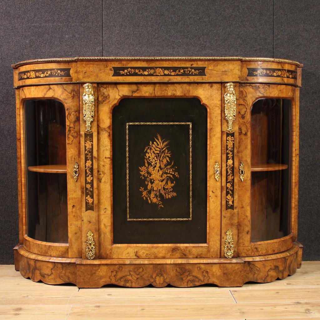 English sideboard from the early 20th century. Three-door cabinet, carved and inlaid in walnut, burl, ebonized wood, rosewood, maple, and fruitwood. The three-door sideboard is of excellent capacity, with a good-sized wooden top, showing some signs of wear (see photo).