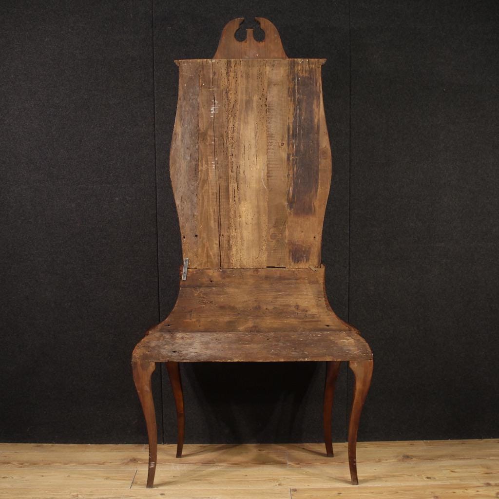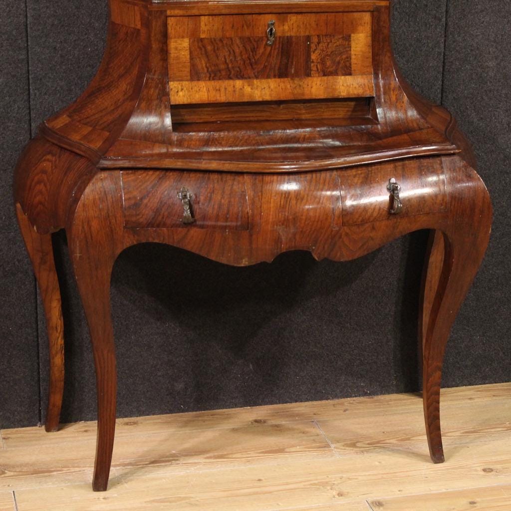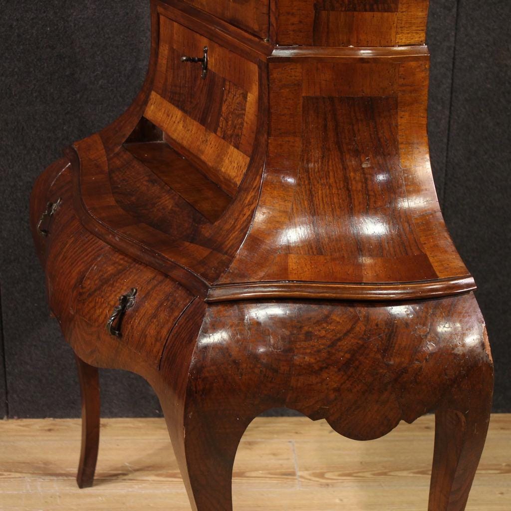 Venetian trumeau from the mid-20th century. Curved furniture, carved and veneered in walnut, burl, beech, and fruitwood. Double-body trumeau with two external drawers and a lower drawer (see photo). The interior of the bureau includes a small writing surface, two document compartments, and a central door (see photo).