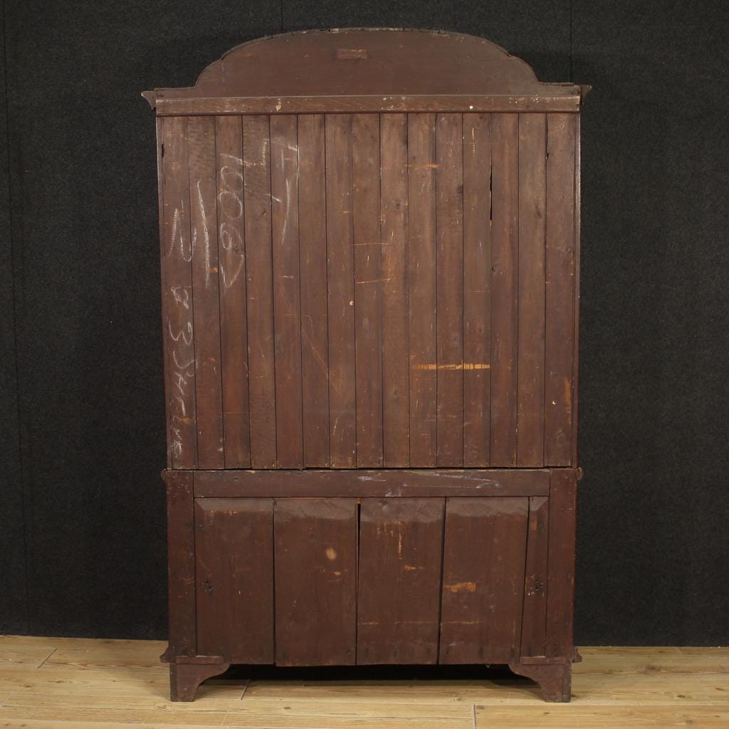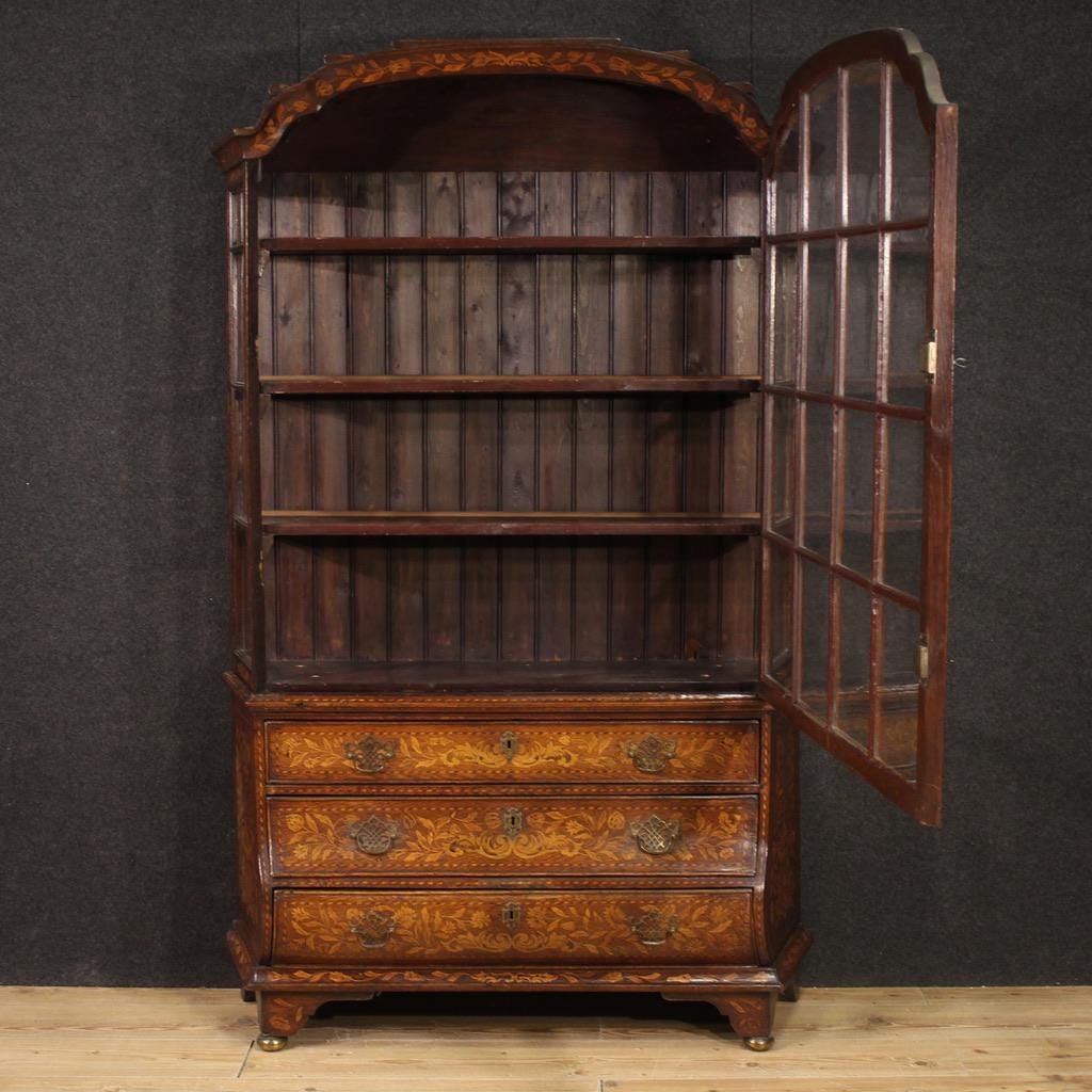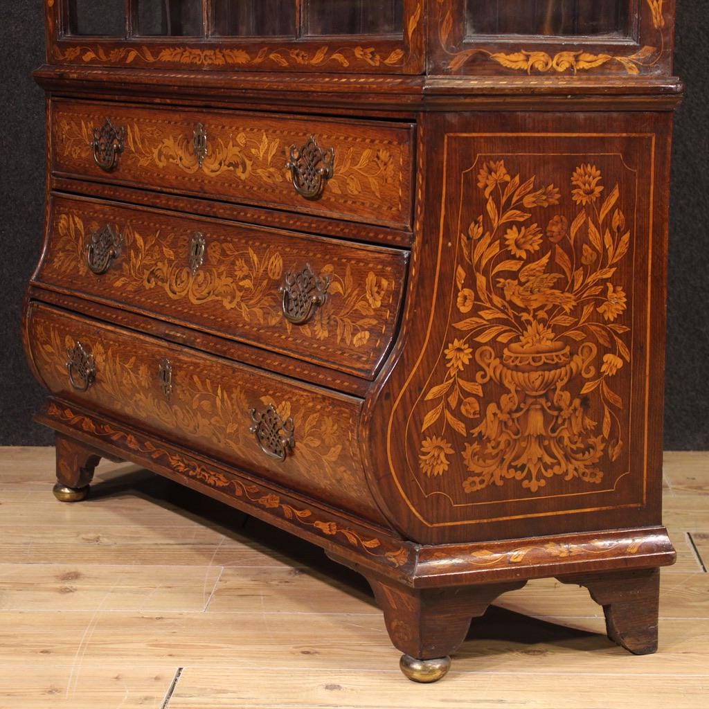 Dutch display cabinet from the second half of the 19th century. Carved and inlaid with floral decorations, made of oak, maple, and fruitwood, this beautiful furniture features a pleasing design and attractive furnishings. The double-body display cabinet has three drawers with keys and working locks, offering a good capacity, in the lower part. The upper body has a single large door complete with two working locks and their keys.
