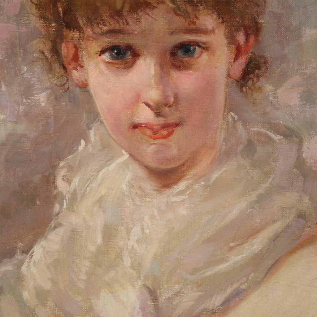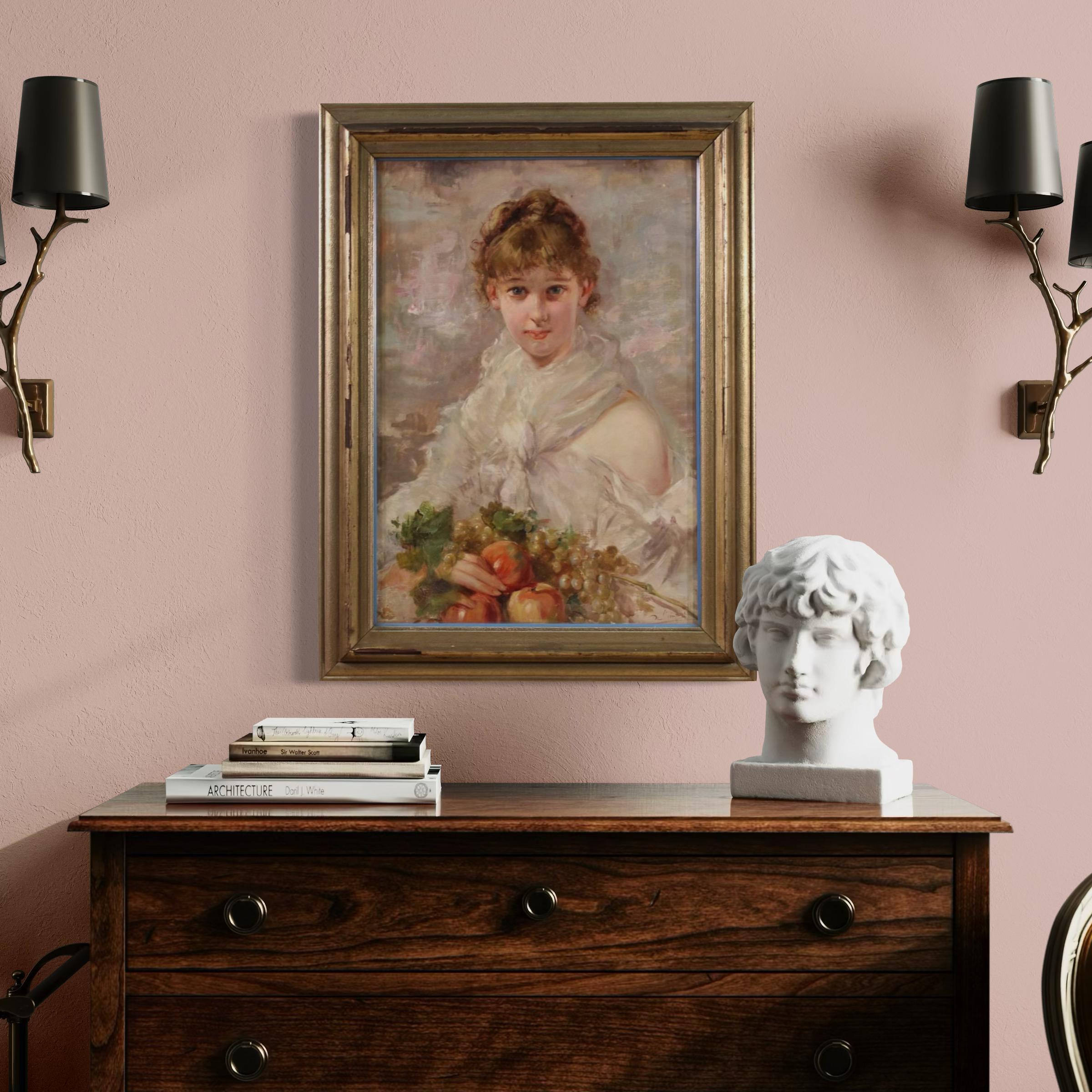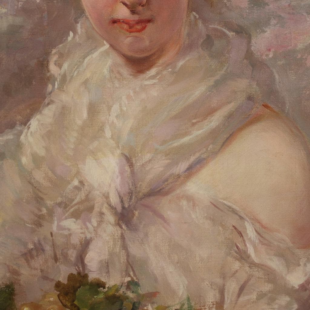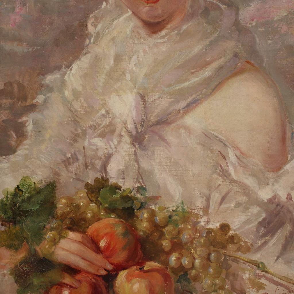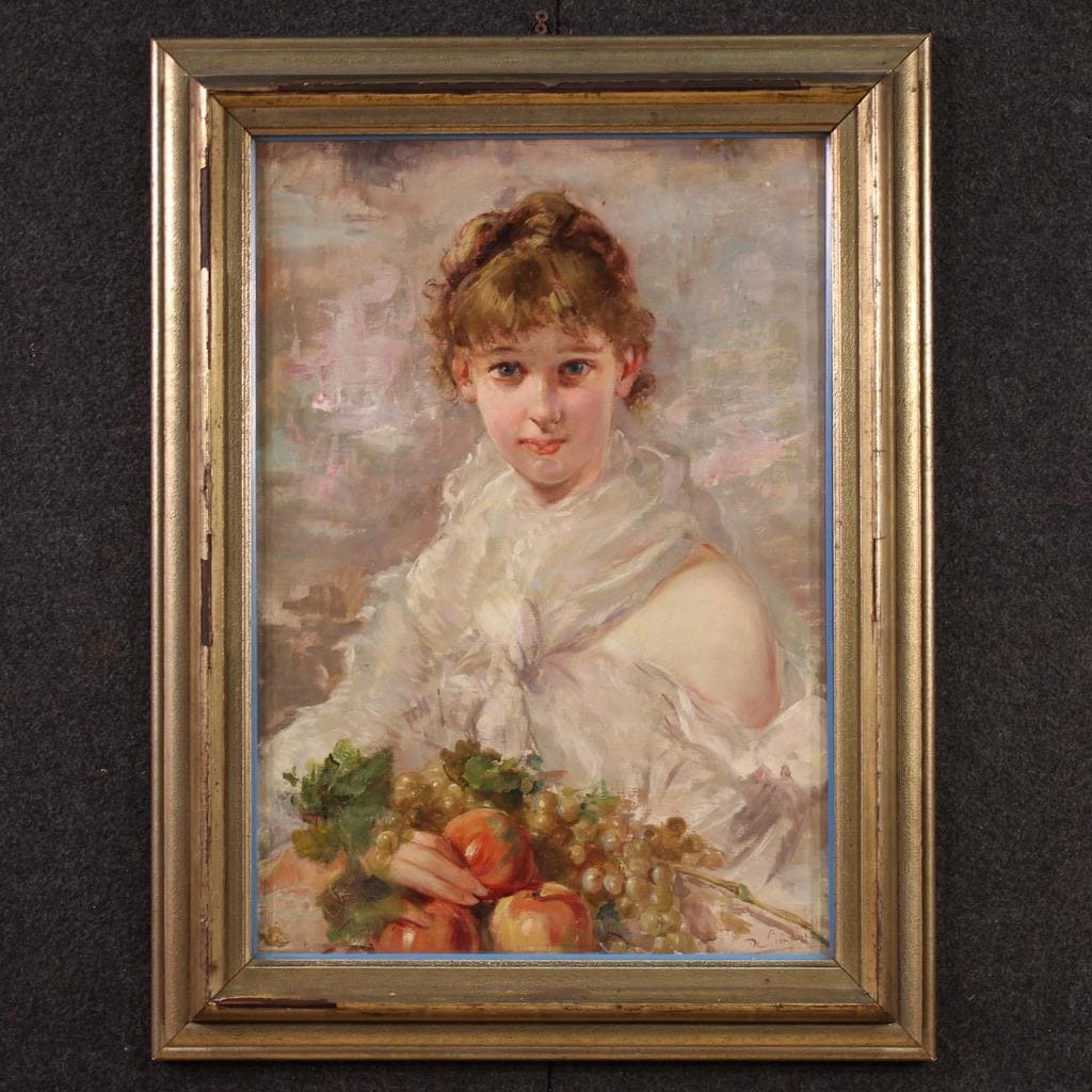 Italian painting from the first half of the 20th century. Oil on canvas artwork, first canvas, depicting a portrait of a young girl with fruit, with good pictorial quality. The painting unfolds vertically, has good luminosity, and is characterized by vibrant colors thanks to the protection of the front glass, which has preserved it well. Signed lower right (see photo), signature under study.
