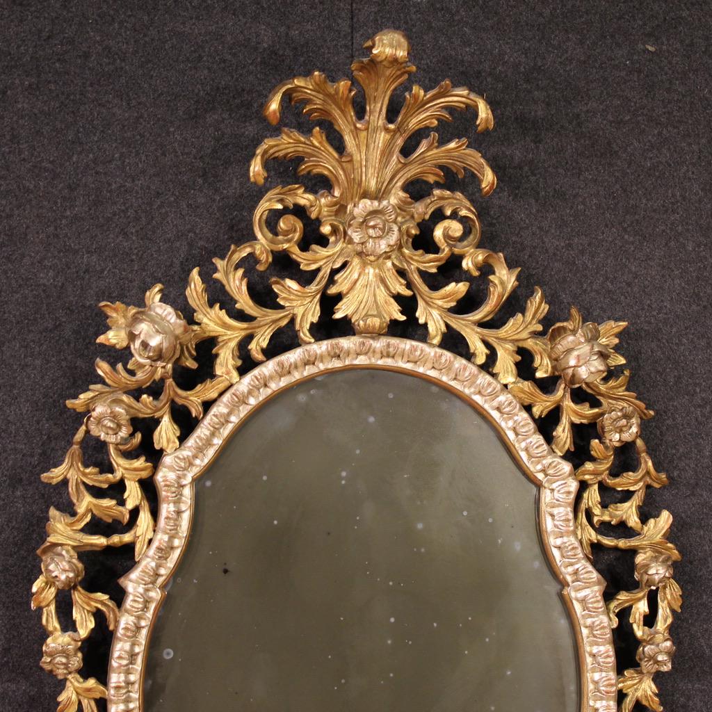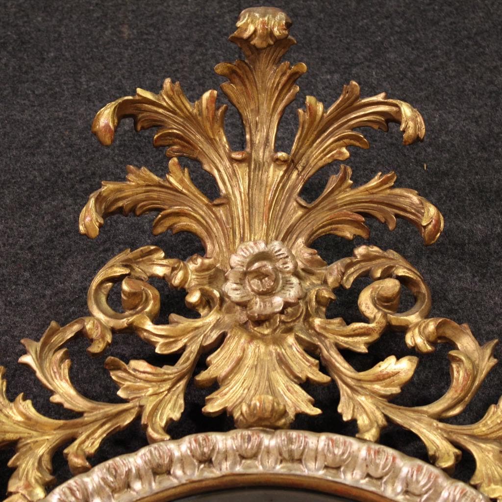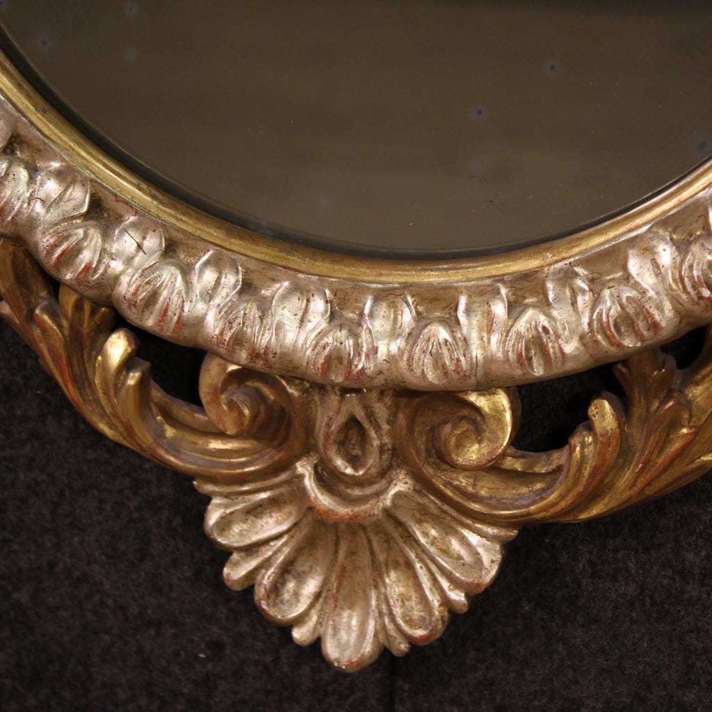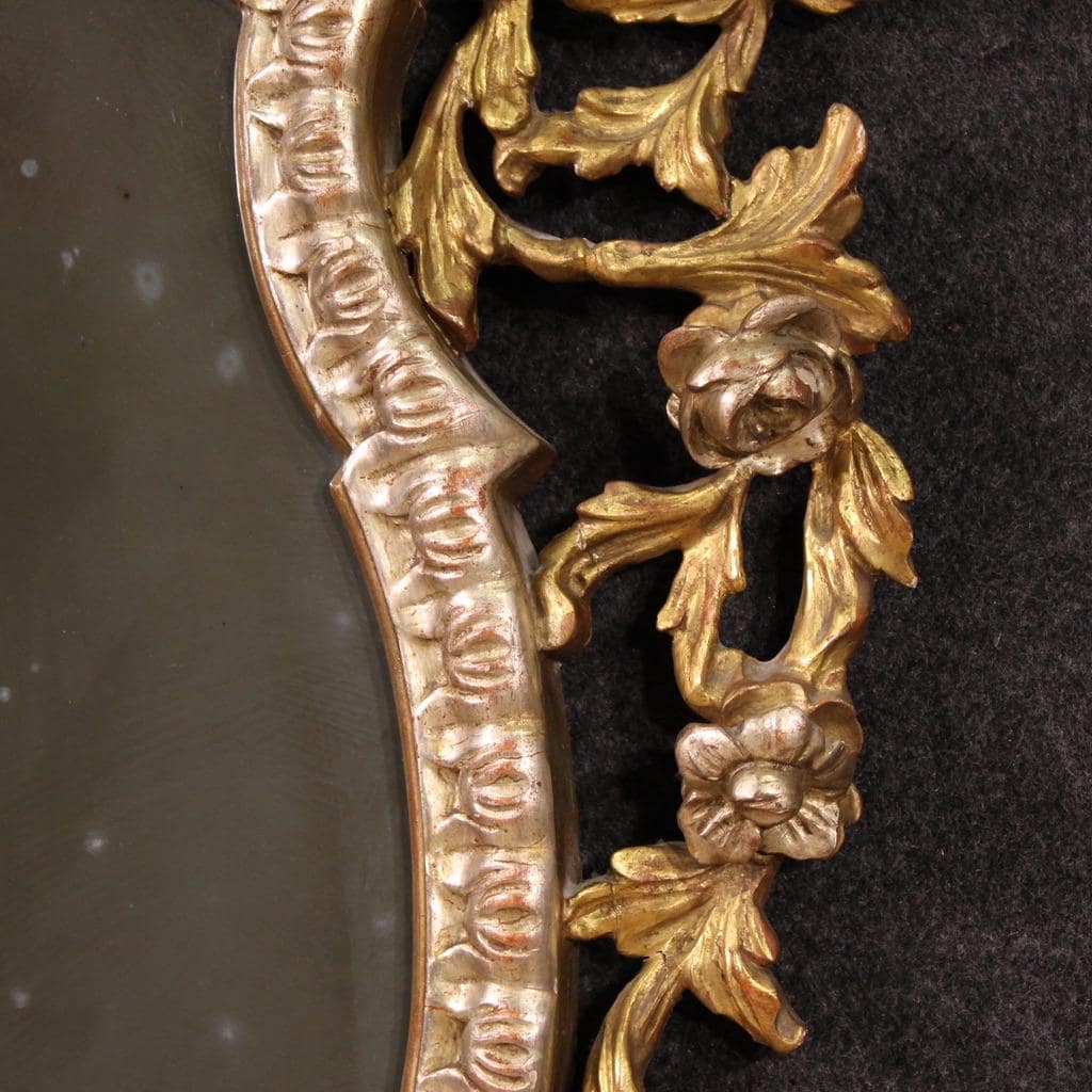 Italian mirror from the second half of the 20th century. Carved, gilded, and silvered wood mirror in the Louis XV style, beautifully sized and striking. The mirror comes complete with the original antiqued mirror, offering a slightly cloudy reflective surface with small stains (see photo).