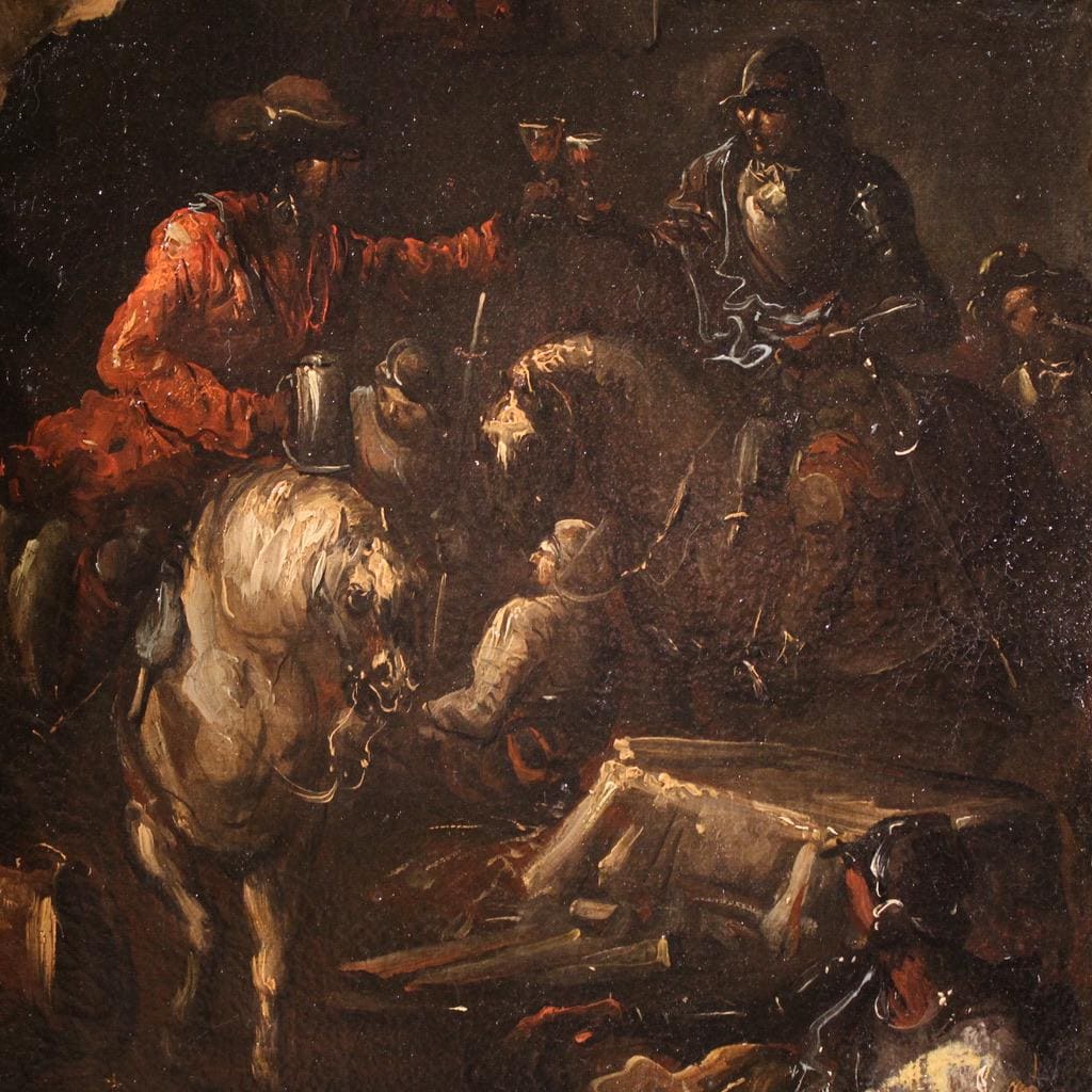 The rapid, energetic brushstrokes, the agitated figures, and the epic atmosphere recall the works of the great Italian painter Pietro Graziani (1662-1731), a specialist and absolute master of the genre. (The painting is not currently accompanied by an expert opinion, but one can be requested upon payment of the relevant additional costs.) A striking painting of excellent pictorial quality, ideal for enhancing a study or a reception room, whether classic or modern.
