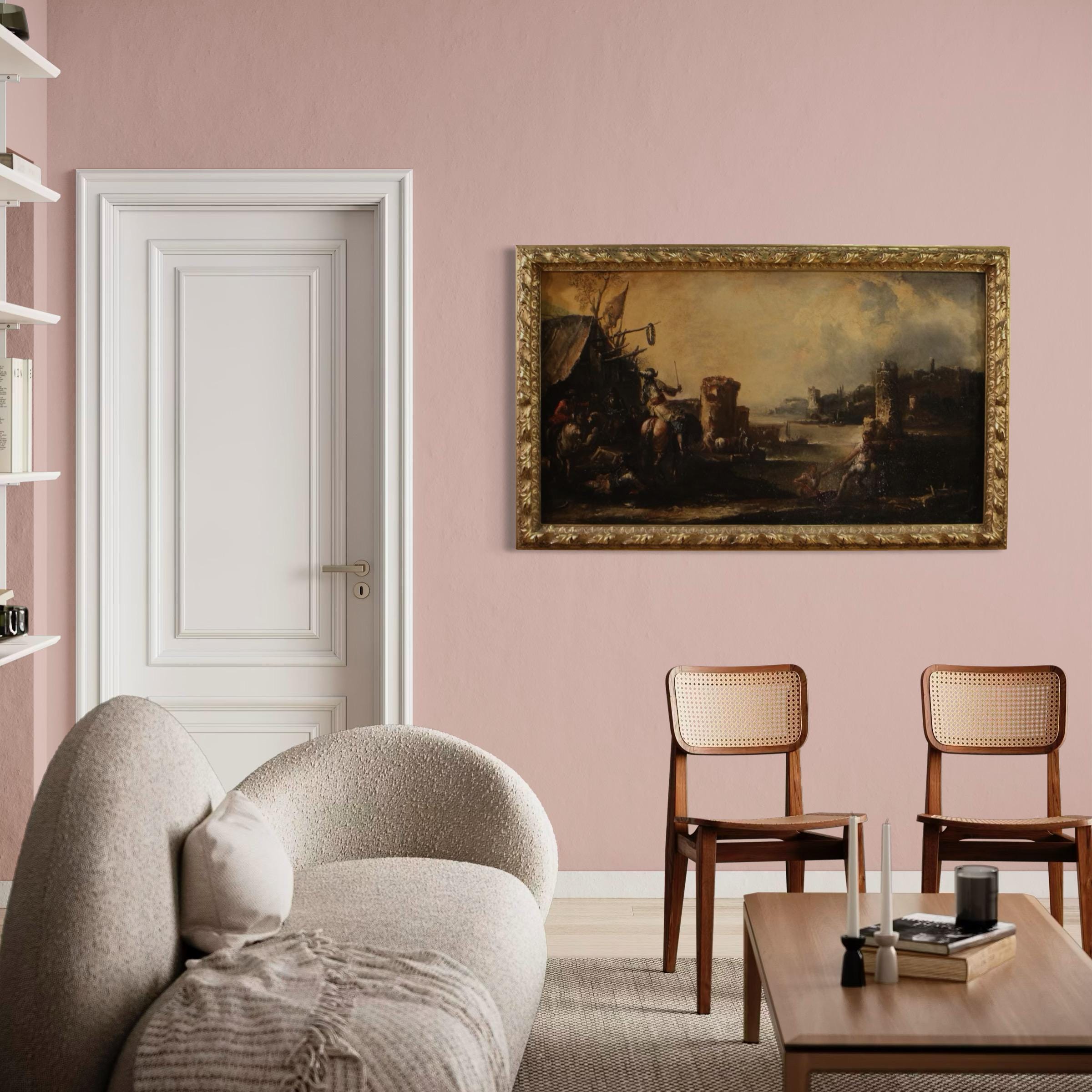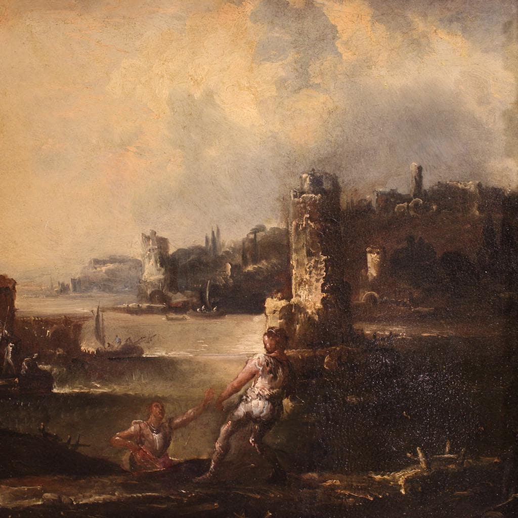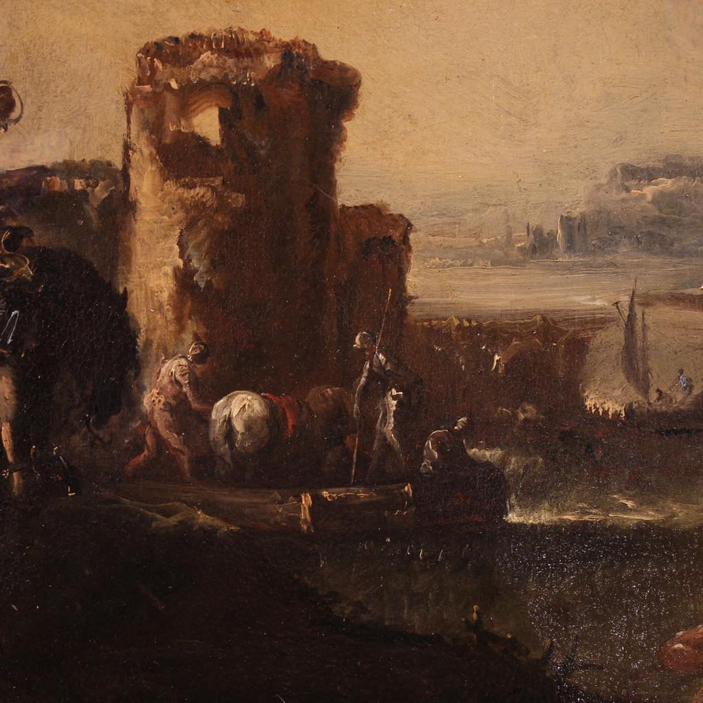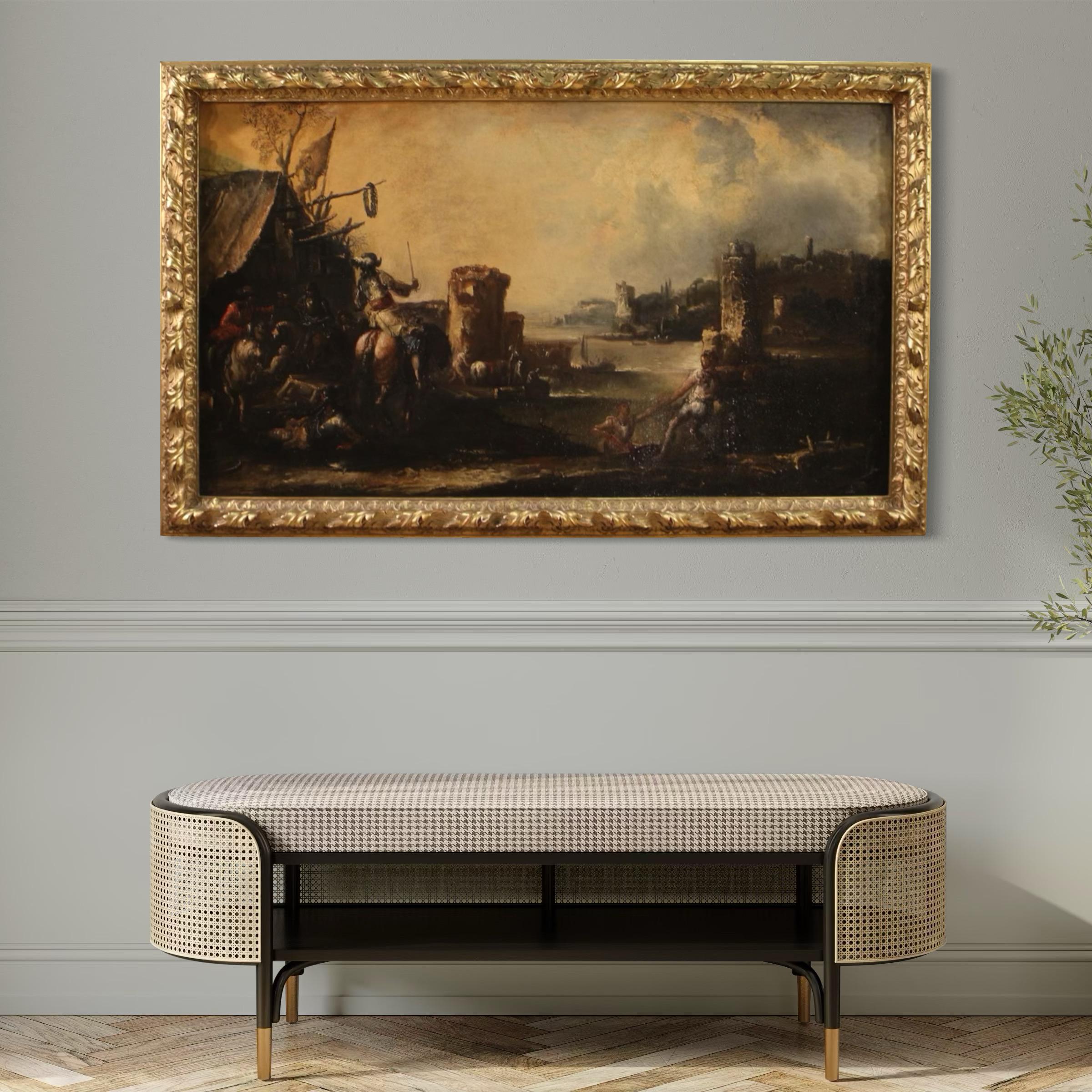 Antique Italian painting from the first half of the 18th century. Oil on canvas artwork depicting a splendid coastal landscape with knights and soldiers. The painting combines the dynamism typical of battles with an imposing backdrop of coastal ruins, where towers and boats emerge from the warm, dramatic light of the sunset.