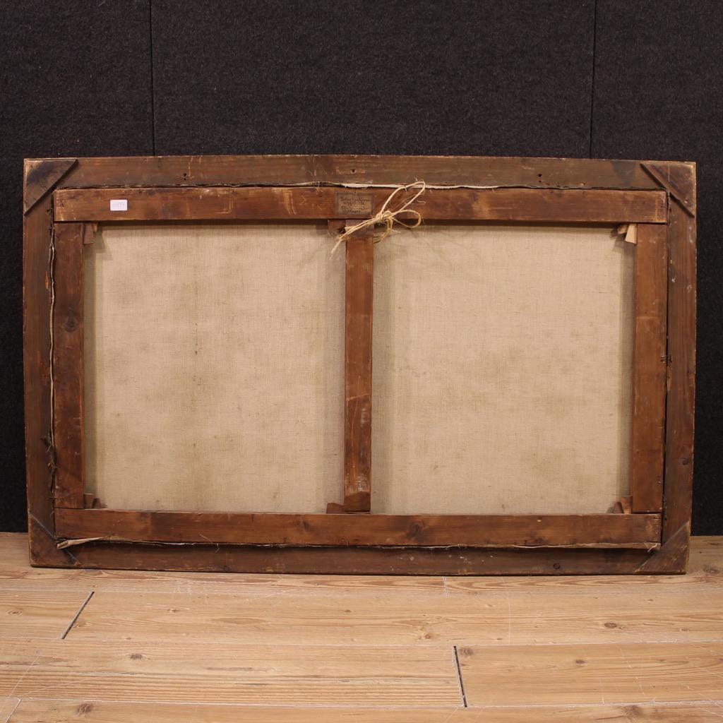 Scenographic 20th-century frame in carved and gilded wood, beautifully decorated, with some signs of aging. The painting has already been restored with re-lining, replacement of the stretcher, and restoration of the color in small areas. Overall, in good condition. Internal dimensions H 70 x W 122 cm.