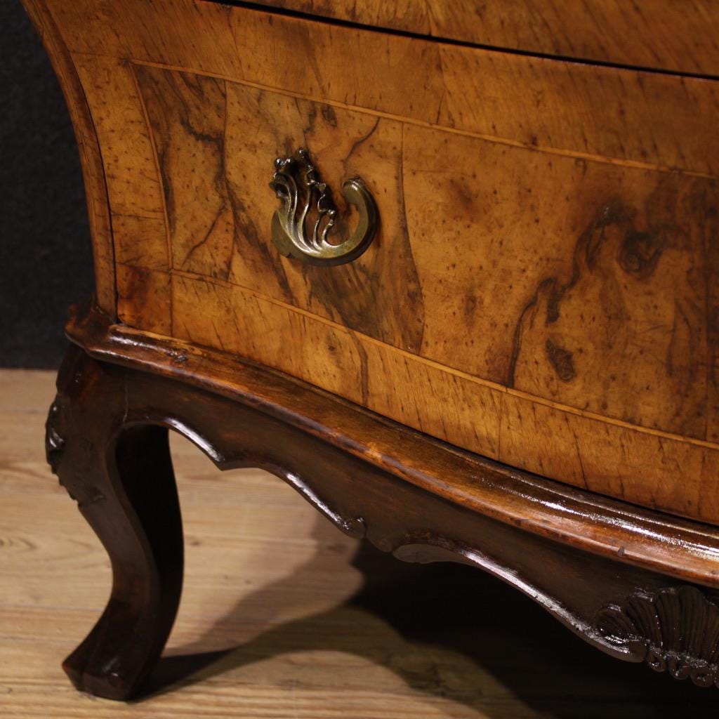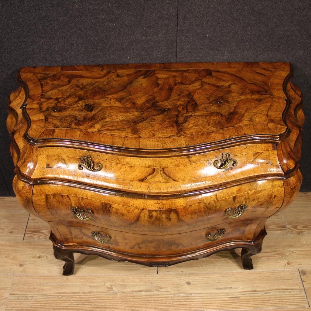 Venetian chest of drawers from the mid-20th century. A stunning furniture with a striking design, carved, veneered, and inlaid in walnut, burl, maple, and beech. The curved, rounded commode features three spacious drawers and a well-sized, functional wooden top.