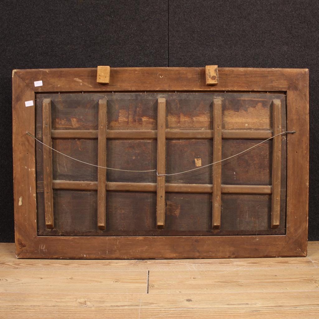 An ideal artwork for a collector of early Flemish paintings, perfect for reception rooms, professional studios, or prestigious contemporary spaces. Spectacular 20th-century gilded wood and plaster frame, with some signs of age. Already restored, with new parquetry on the back and retouching of the color in small spots. Overall in good condition. Internal dimensions: H 59 x W 104 cm.