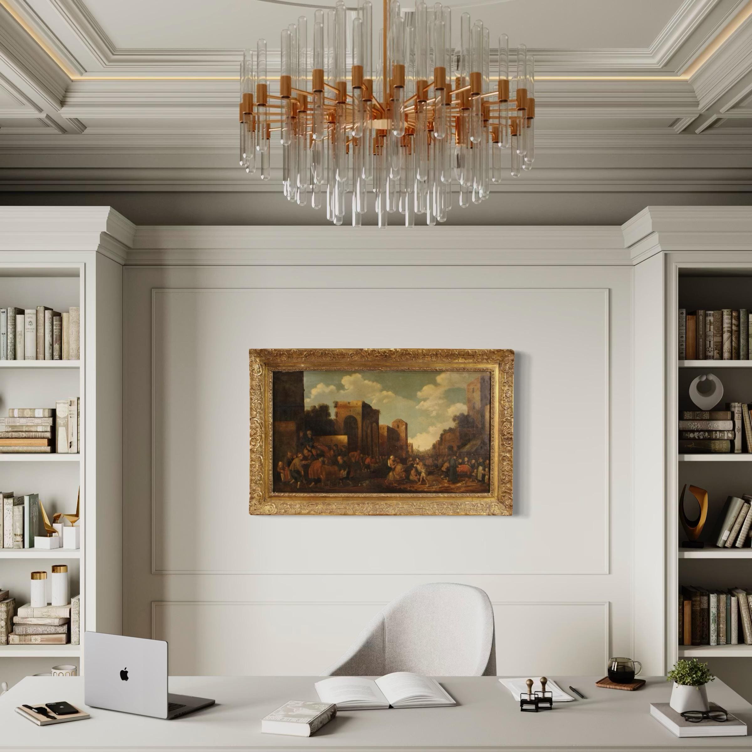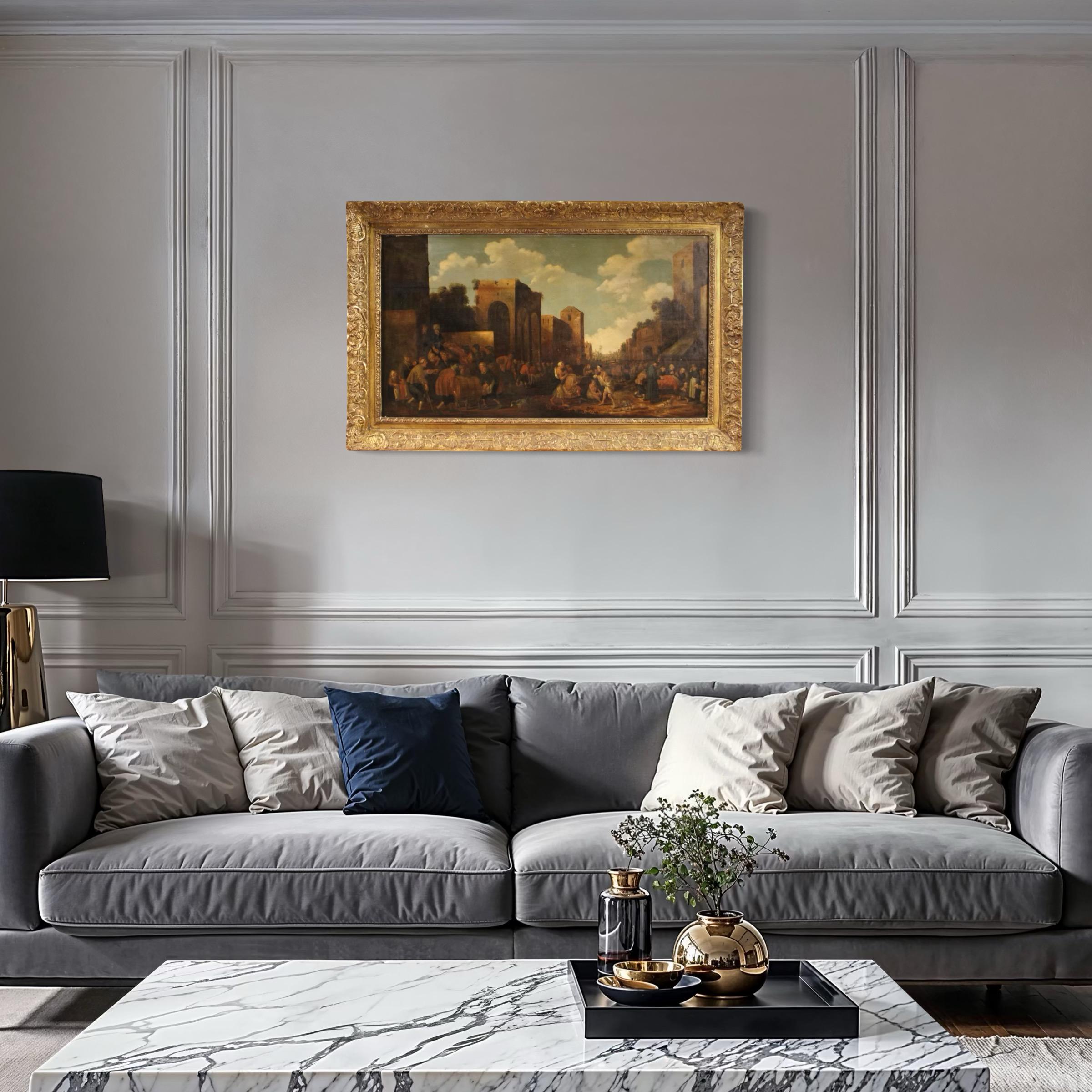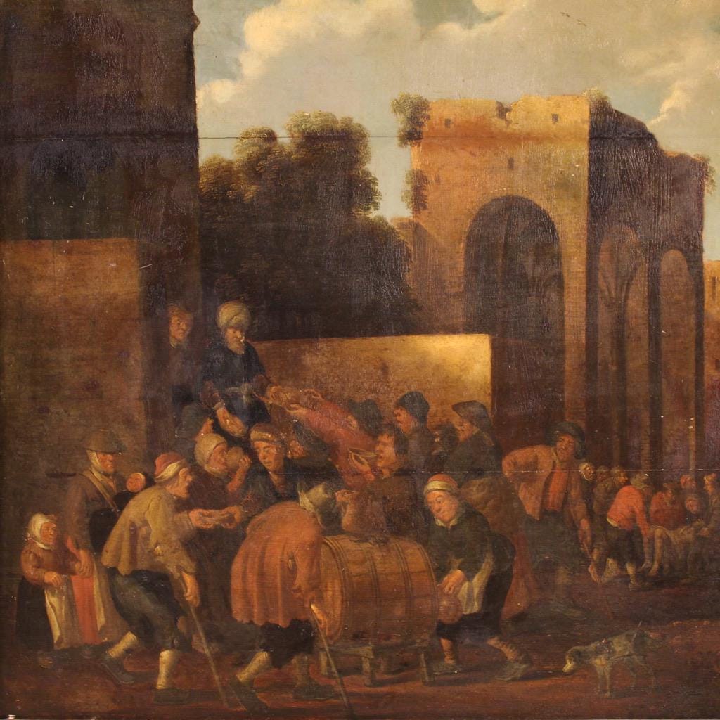 A rare Flemish painting, signed and dated 1646. This artwork oil on panel depicts a marvelous genre scene set in a Nordic-style city, enlivened by a teeming crowd of beggars, the sick, and clergymen begging for alms. Signed on the lower left wall (J.C. Droochsloot) and dated 1646, it is attributed to the great Dutch painter Joost Cornelisz Droochsloot (1586–1666).
