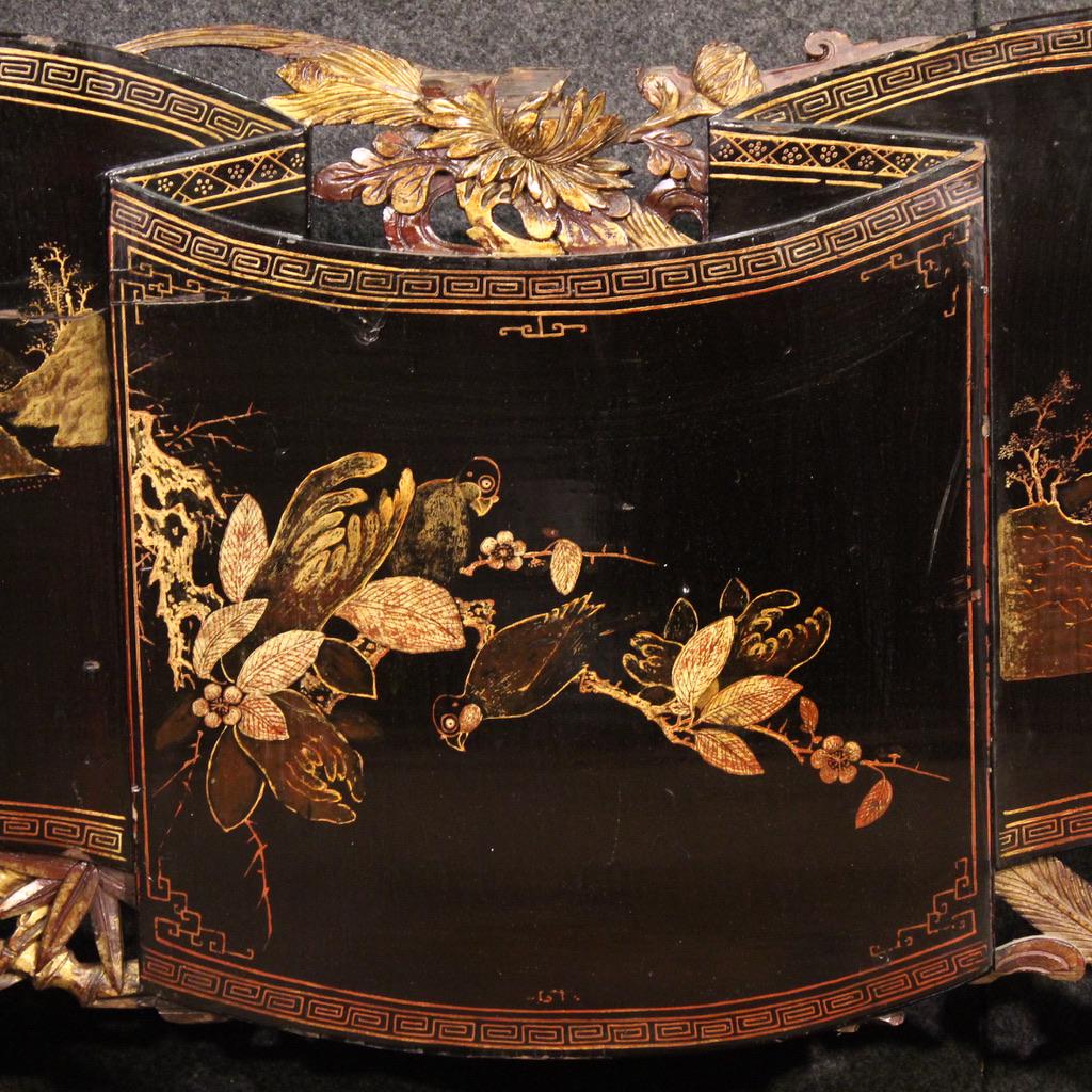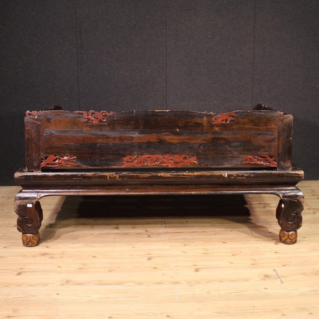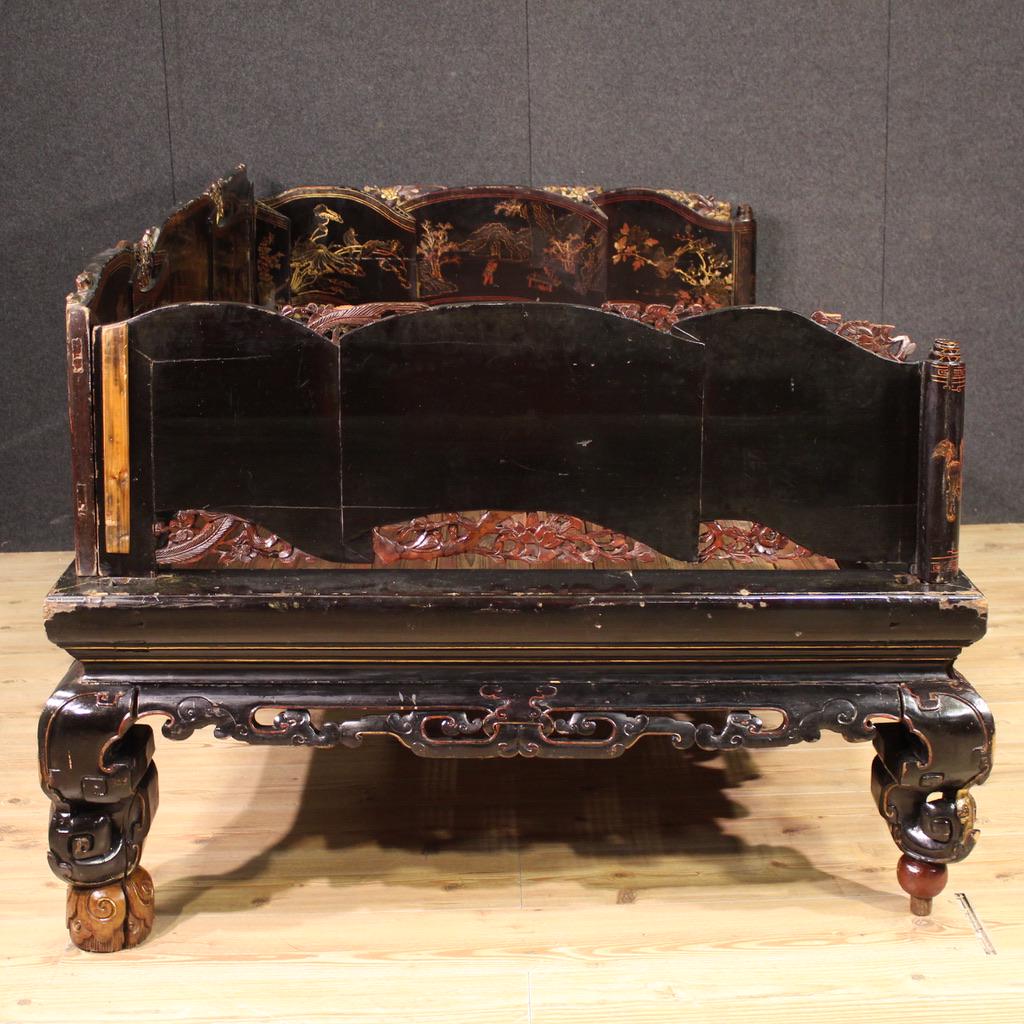 Great Chinese opium bed from the late 19th century. Finely carved, lacquered, gilded, and hand-painted exotic wood, this bed is of excellent quality and visually striking. The sofa base is constructed from a single block and cannot be dismantled. The headboard and side panels are adorned with painted flowers and landscapes with characters in antique Oriental style (see photo).