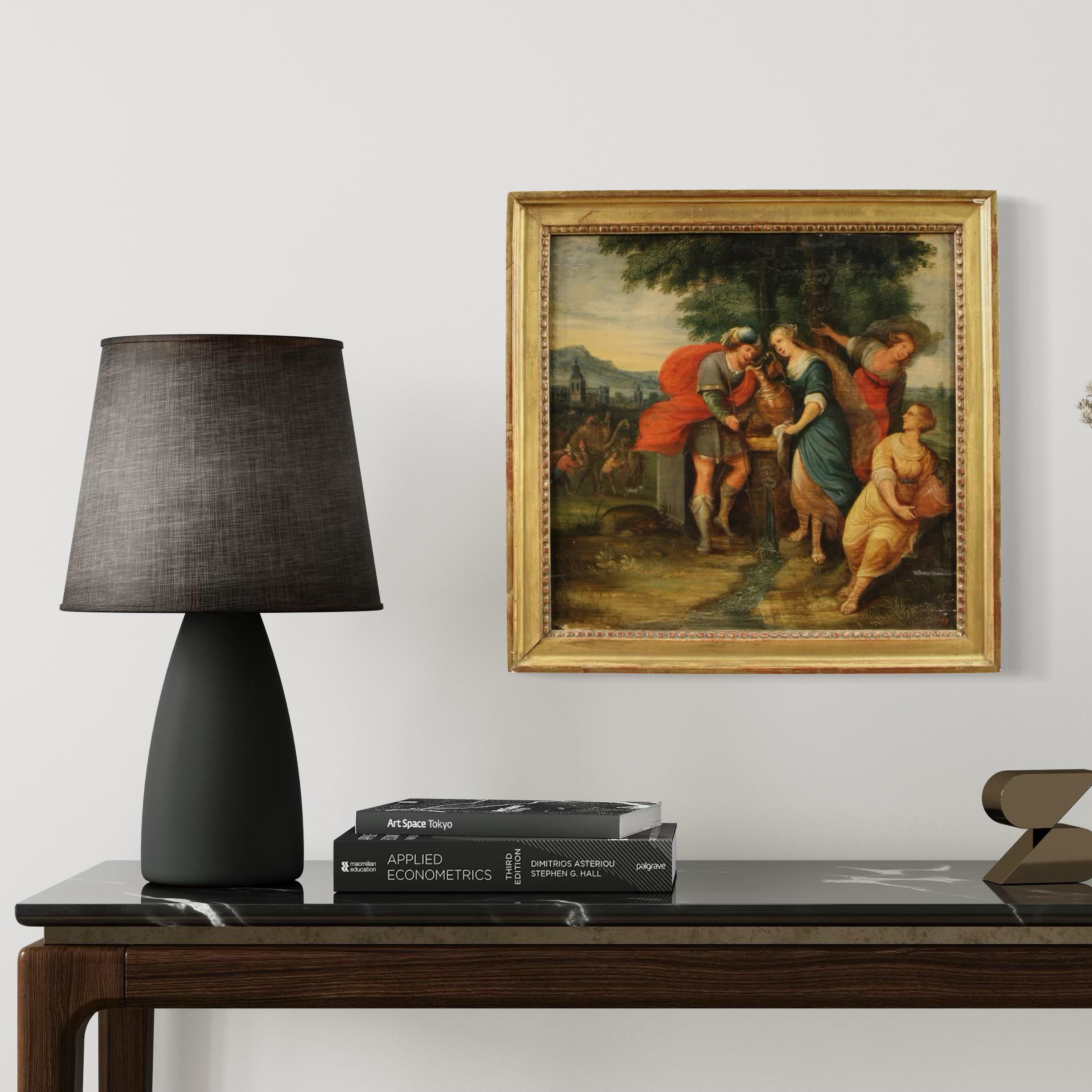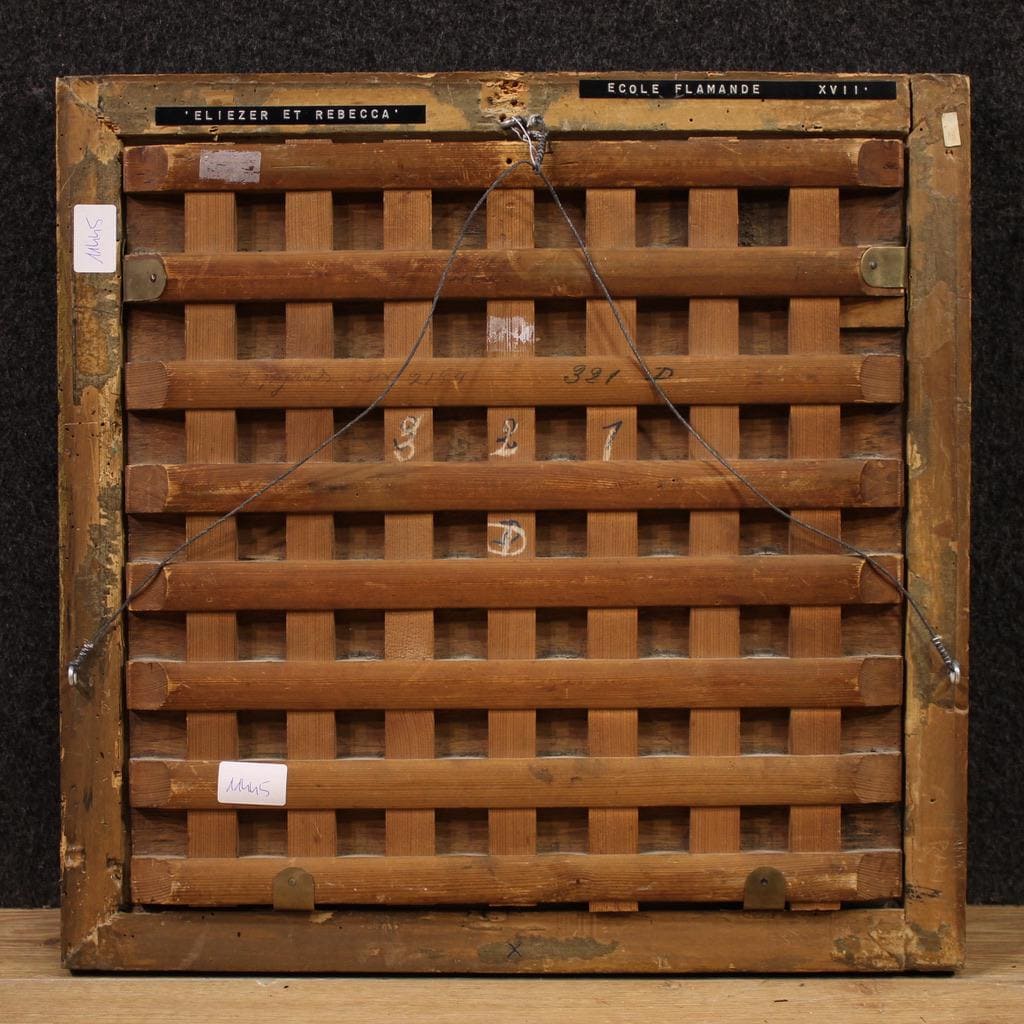 Antique 17th-century Flemish panel. Painting oil on oak panel of excellent pictorial quality. This painting depicts Rebecca at the Well, a biblical subject with a pleasing luminosity, characterized by numerous details and great dynamism. Rebecca is depicted offering water to Eliezer, Abraham's messenger charged with finding the bride chosen by God for his son Isaac.