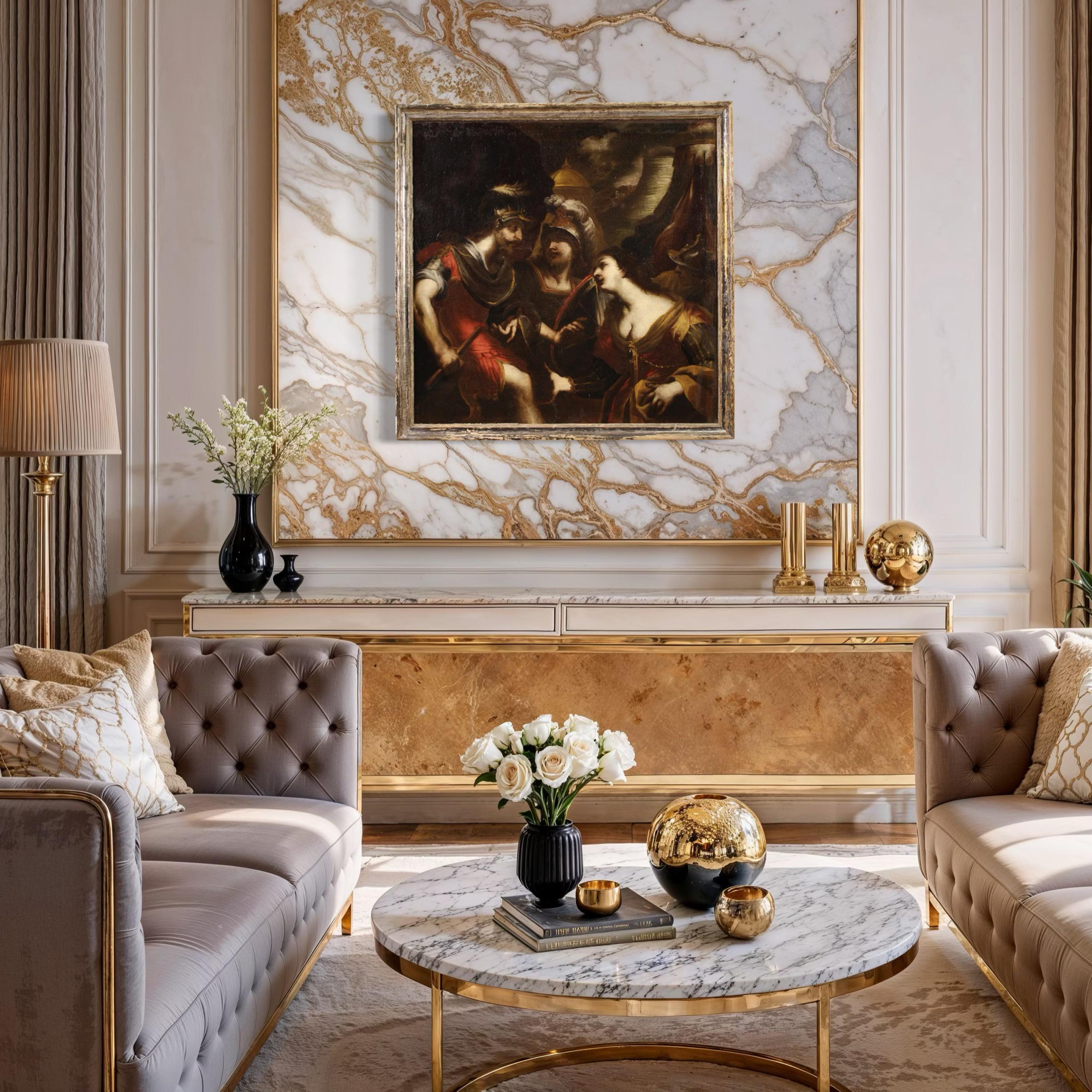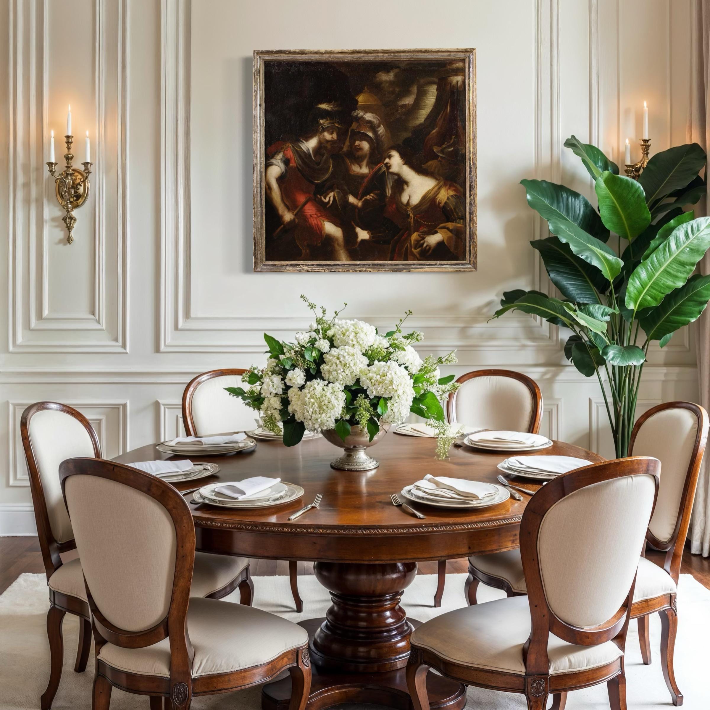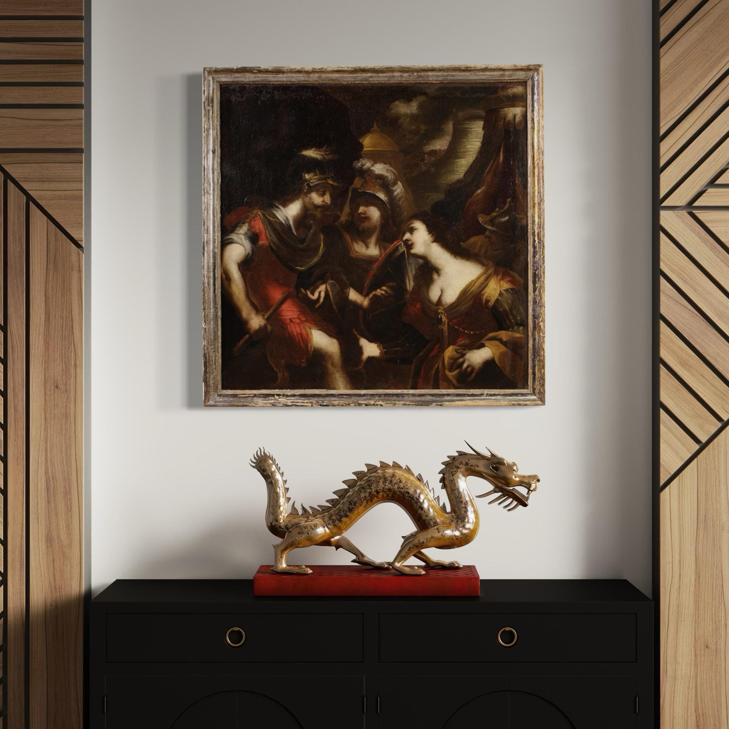 A magnificent 17th-century Italian painting. This artwork oil on canvas depicts a famous episode from the Iliad, the dispute between Agamemnon and Achilles over Briseis. During the Trojan War, the god Apollo had unleashed a plague among the Achaeans because Agamemnon refused to return Chryseis, the daughter of Chryses, the temple priest. To end the plague, the King of Mycenae was forced to return her to the Trojans, but decided to take Briseis, the spoils of war and Achilles' slave, as a consolation prize. The Greek hero, now fond of the girl, was outraged and withdrew from the fight, only returning to the battlefield after the death of Patroclus. On the left, we see Agamemnon with the scepter of command, on the right, the beautiful Briseis, while in the center we find an enraged Achilles.