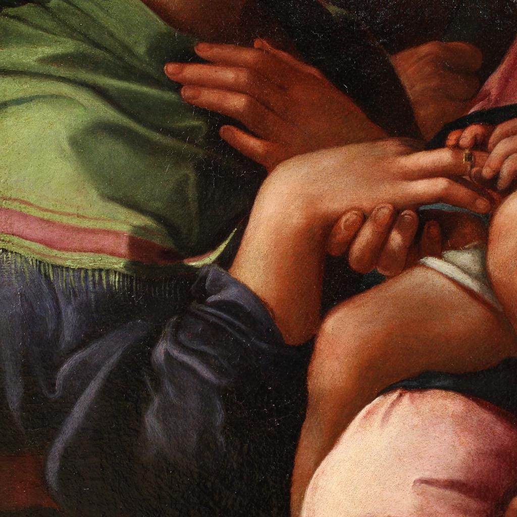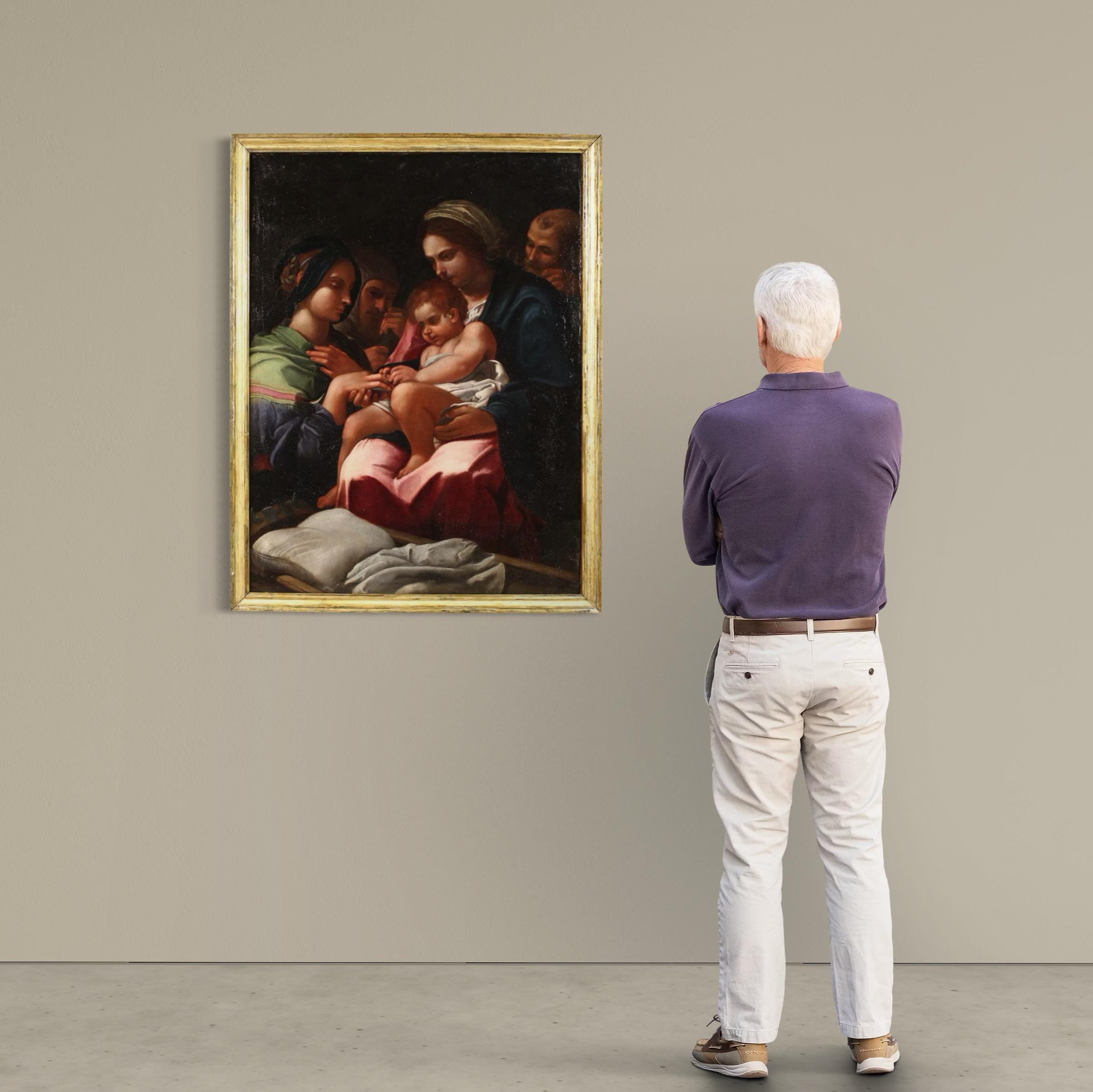 A splendid 17th-century Italian painting. This oil on canvas artwork depicts the mystical marriage of Saint Catherine of Alexandria, recognizable by the cogwheel of martyrdom in the foreground. A princess of Alexandria, Egypt, rejected all earthly marriage, declaring herself already the bride of Christ. During a mystical vision, the Virgin appeared to her with the child, who placed a ring on her finger, sealing an eternal spiritual union.