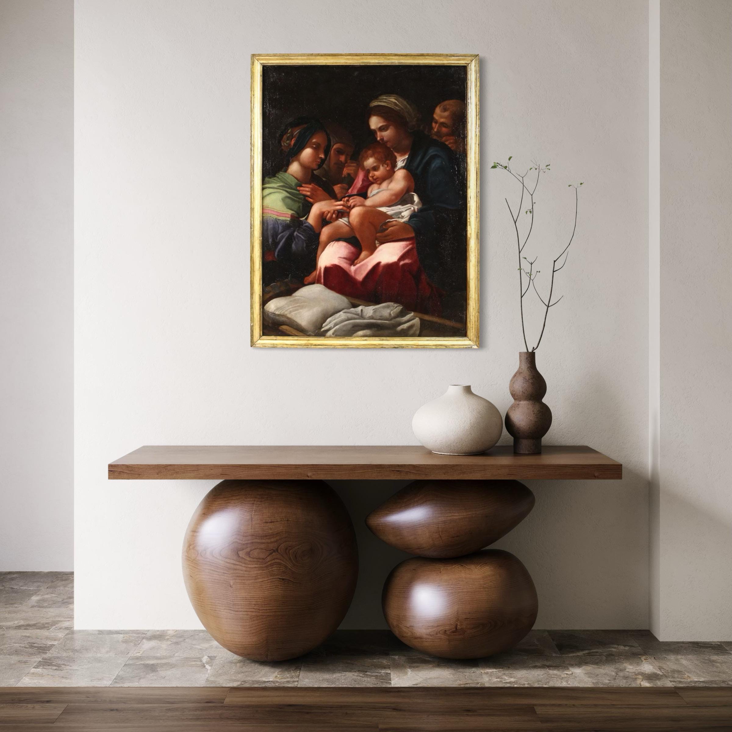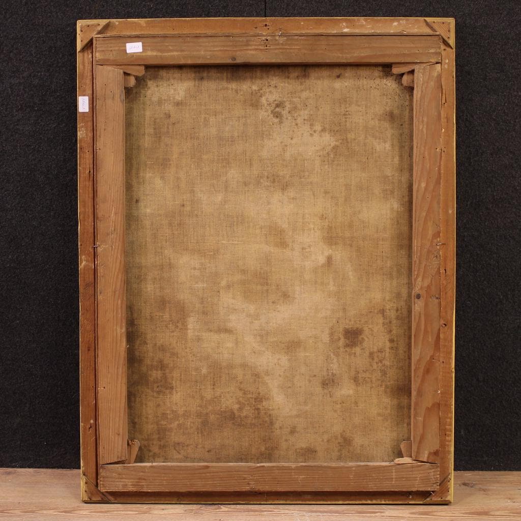A rare artwork of great spiritual intensity, ideal for prestigious settings, both classical and modern. The 20th-century carved and gilded wooden frame shows various signs of aging. The painting has already been restored with re-lining, replacement of the stretcher, and repainting in some areas. Overall, it is in good condition. Internal dimensions: H 99 x W 75 cm.