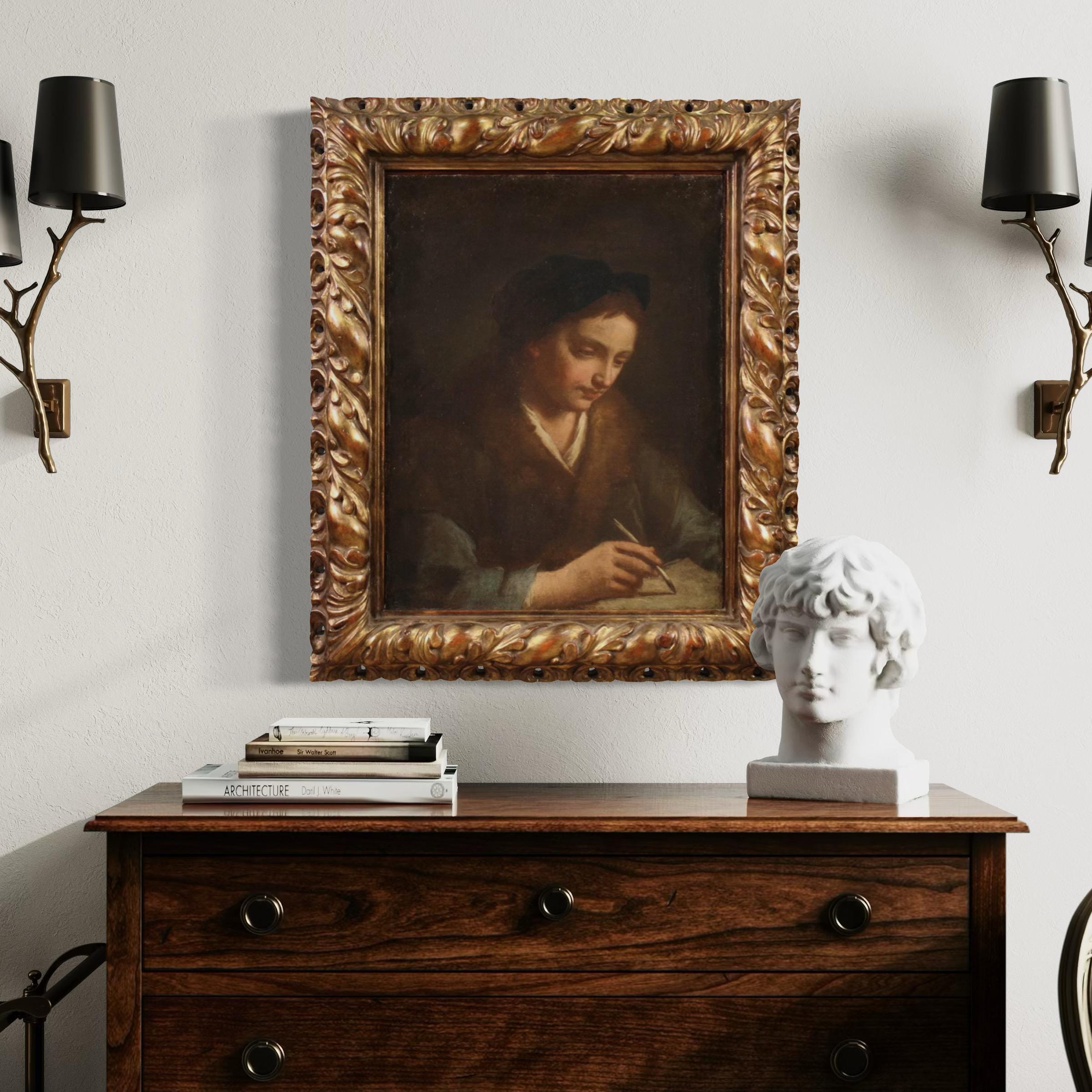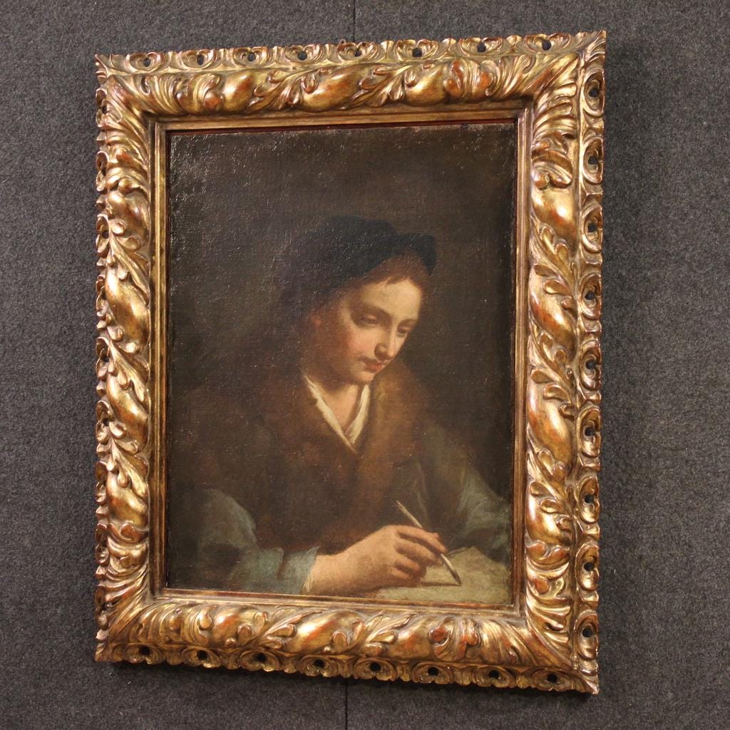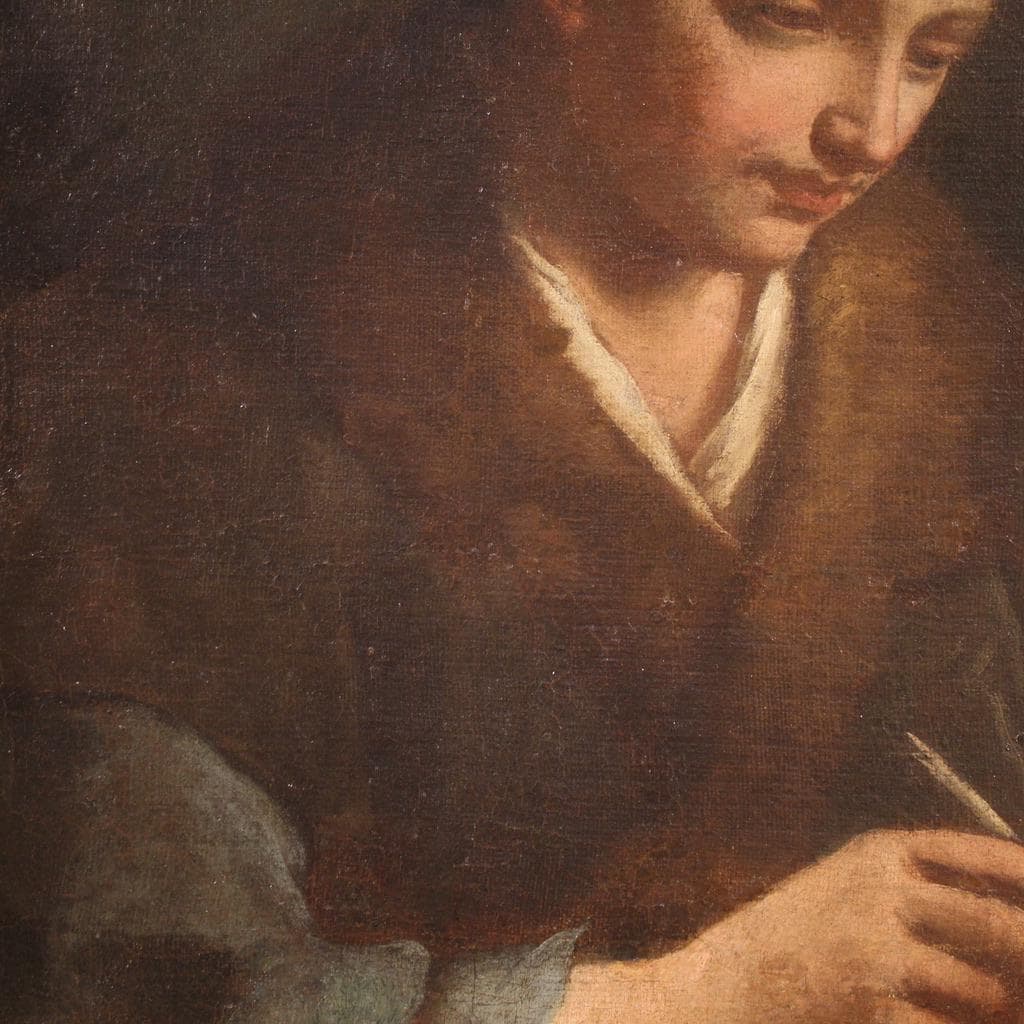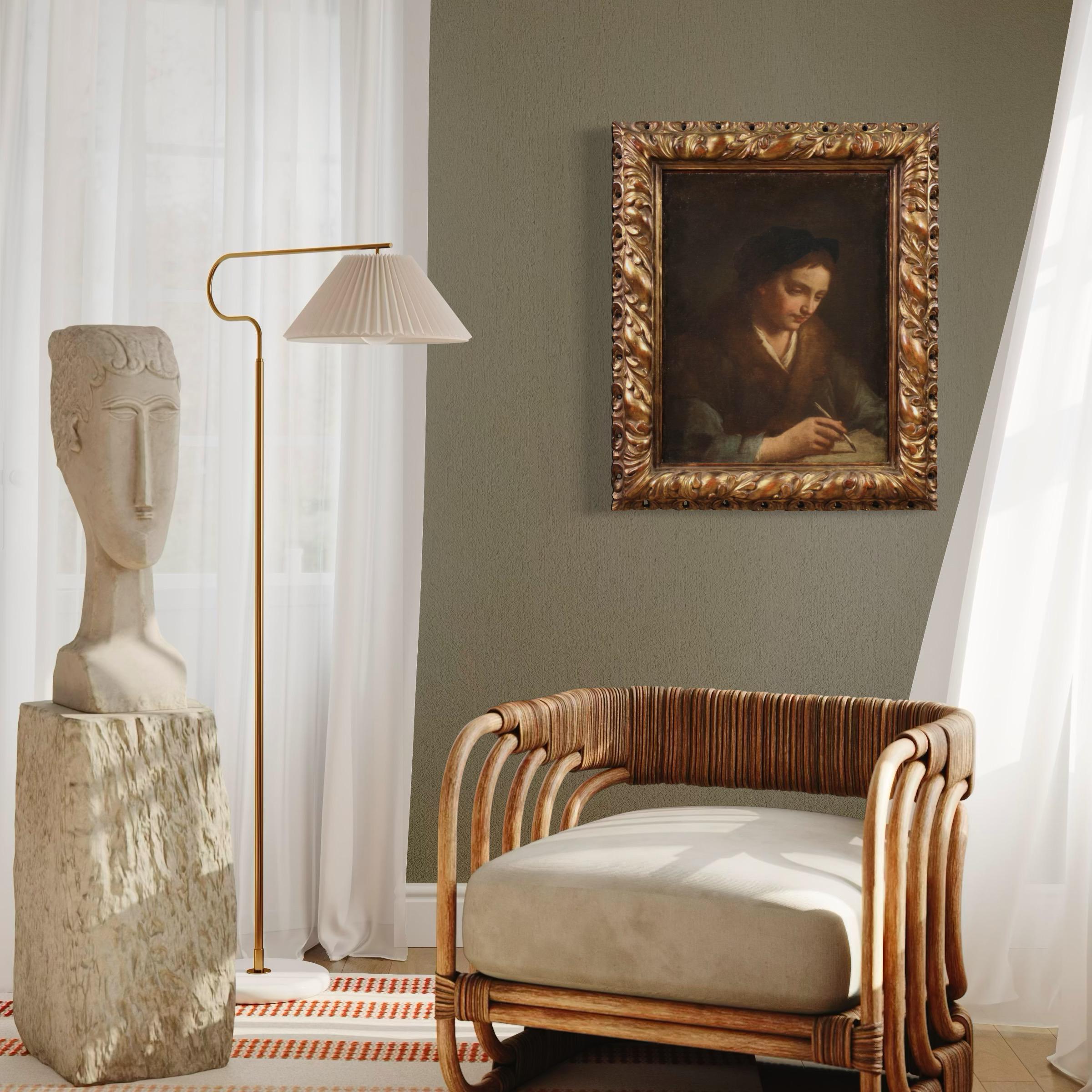Antique 17th-century Italian painting. Oil on canvas artwork depicting the portrait of a young scholar/artist with excellent painting skills. The painting is adorned with a richly carved and gilded modern frame, beautifully decorated. The painting, which extends vertically, is of excellent proportion and easily fits into any room in the home.