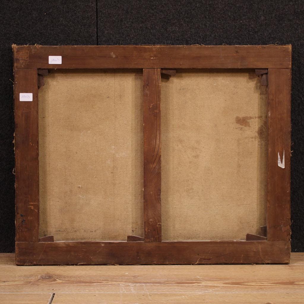 In the foreground, the painter depicts Jesus placing his right hand on the blind man's face. A few figures nearby witness the scene (see photo). The painting has good luminosity and has undergone conservative restoration, relining, replacement of the stretcher, and restoration of the color in some areas (see photo). In good condition.