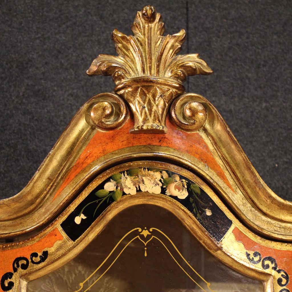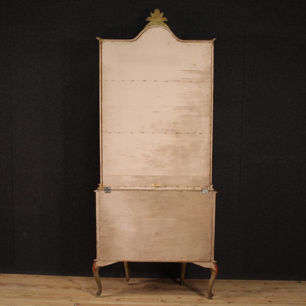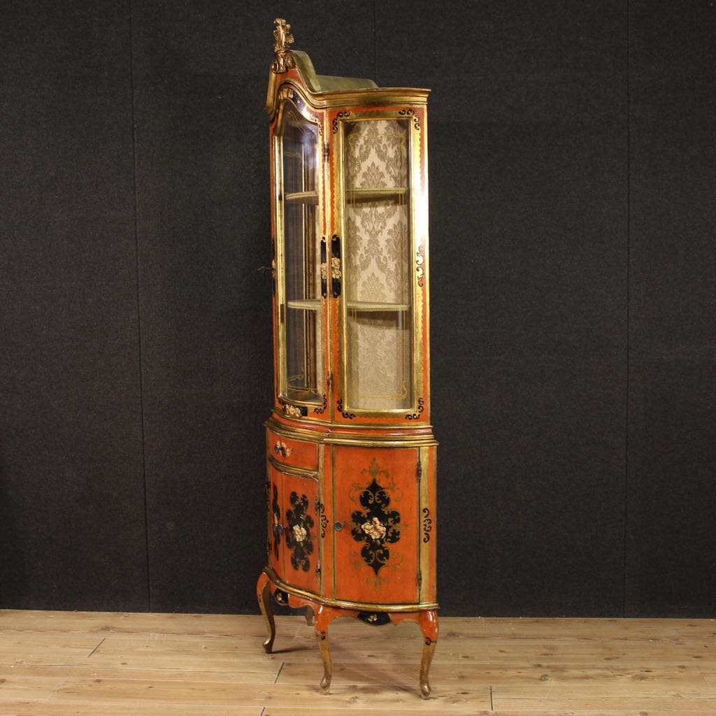An elegant Tuscan display cabinet from the second half of the 20th century. A curved furniture of carved, lacquered, gilded, and hand-painted wood with exquisite floral decorations. The double-body display cabinet features four doors and a lower drawer. The upper body has a central door complete with a working key. The interior is upholstered in damask fabric and is in good condition.