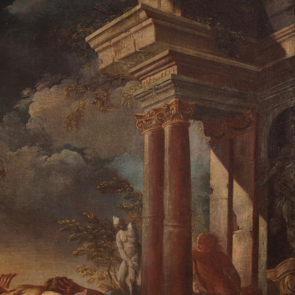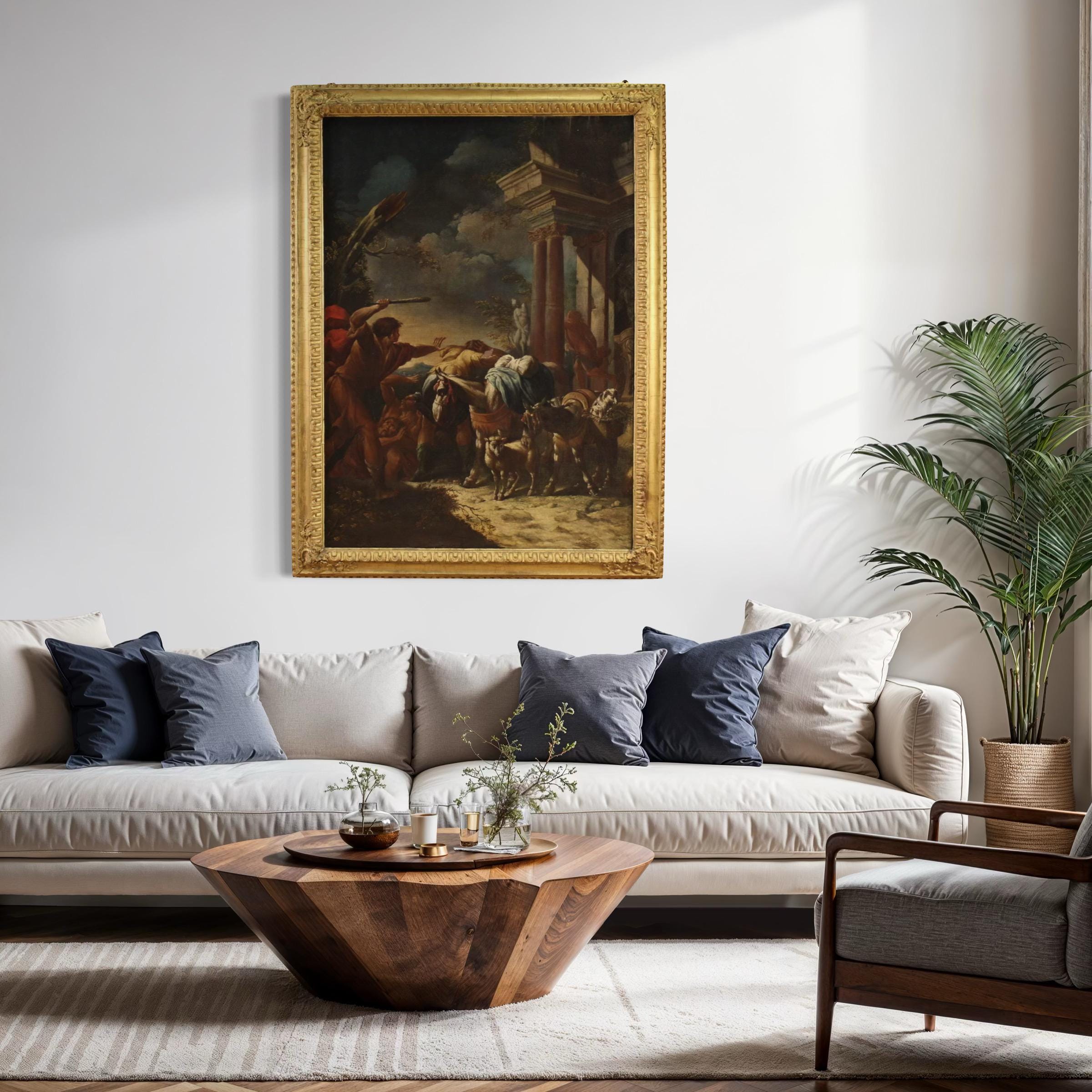 Magnificent Italian painting from the first half of the 18th century. This artwork oil on canvas depicts the biblical episode of Moses driving the shepherds from the well of Midian. Having fled Egypt, Moses helps Jethro's daughters by driving away the shepherds who were preventing them from drawing water from the well. The canvas clearly reveals the hand of the great Neapolitan artist Domenico Brandi (1684-1736), one of the greatest exponents of animal painting.