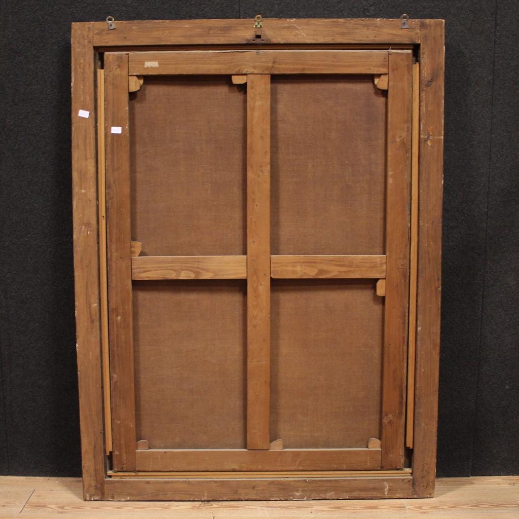 A large, impactful painting, ideal for a reception room or prestigious professional studio. A scenic 20th-century frame, beautifully decorated, with some small losses and signs of aging. The painting has already been restored with re-lining, replacement of the stretcher, and restoration of the color in small areas. It has some noticeable paint drops in the central section (see photo), easily restoreable, and is in overall good condition. Internal dimensions: H 148.5 x W 105 cm.