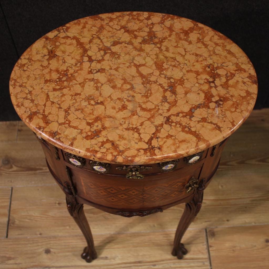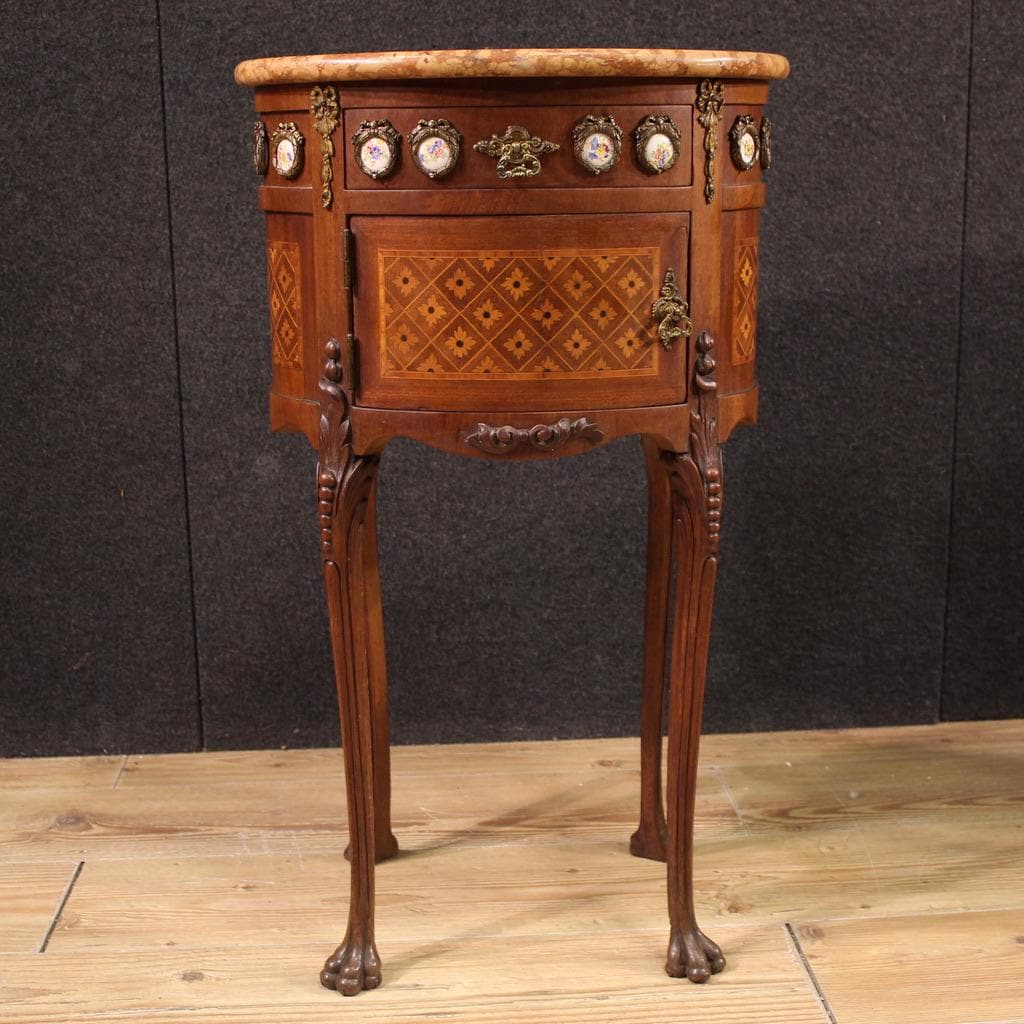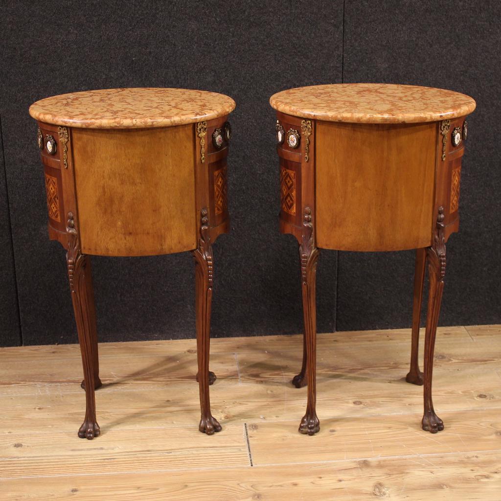 A pair of French bedside tables from the first half of the 20th century. Oval-shaped furniture with bronze ornaments, veneered and inlaid with mahogany, maple, rosewood, and fruitwood. The tables are finely adorned with painted ceramic plaques with floral decorations (see photo).