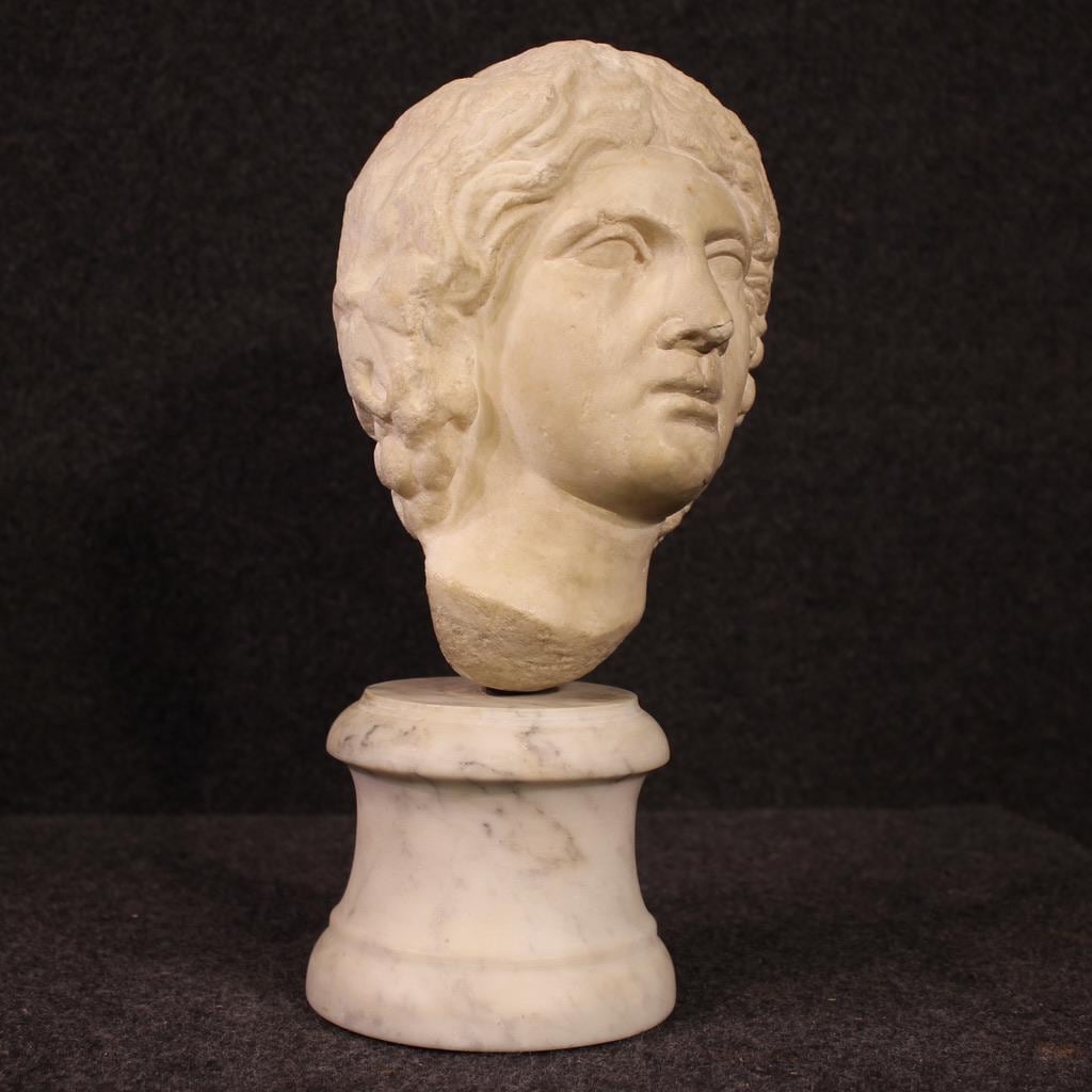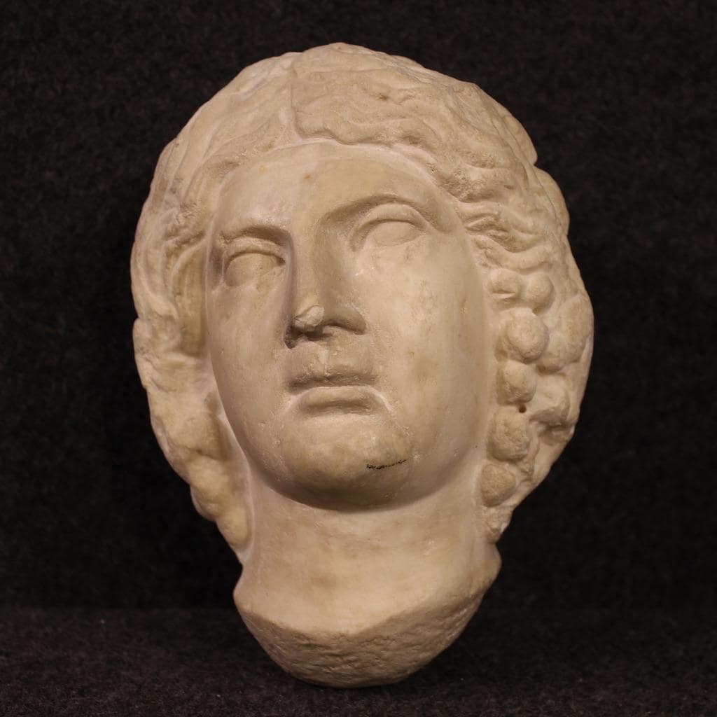 A rare Italian statue from the second half of the 17th century. A finely crafted white statuary marble artwork depicting the head of a young woman, reminiscent of the iconography of a goddess or an idealized female portrait. The sculpture is conceived with a refined and measured language, inspired by the models of ancient Roman culture. The composed expression and the wavy hair, treated with restraint and elegance, are elements of classical influence.