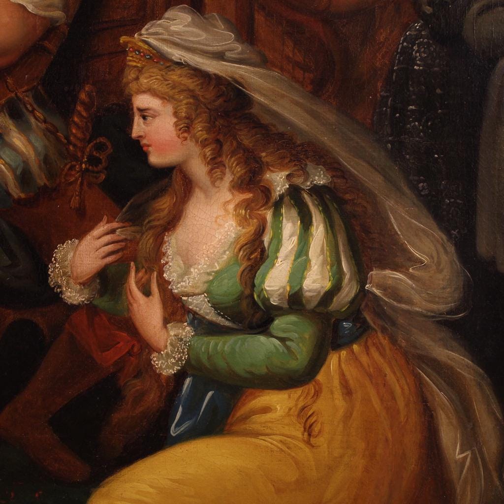 Antique French painting from the first half of the 19th century. Oil on canvas artwork entitled Solomon and the Queen of Sheba, of excellent pictorial quality. A beautifully sized and impactful painting, richly adorned with a scenic carved and gilded wooden frame.