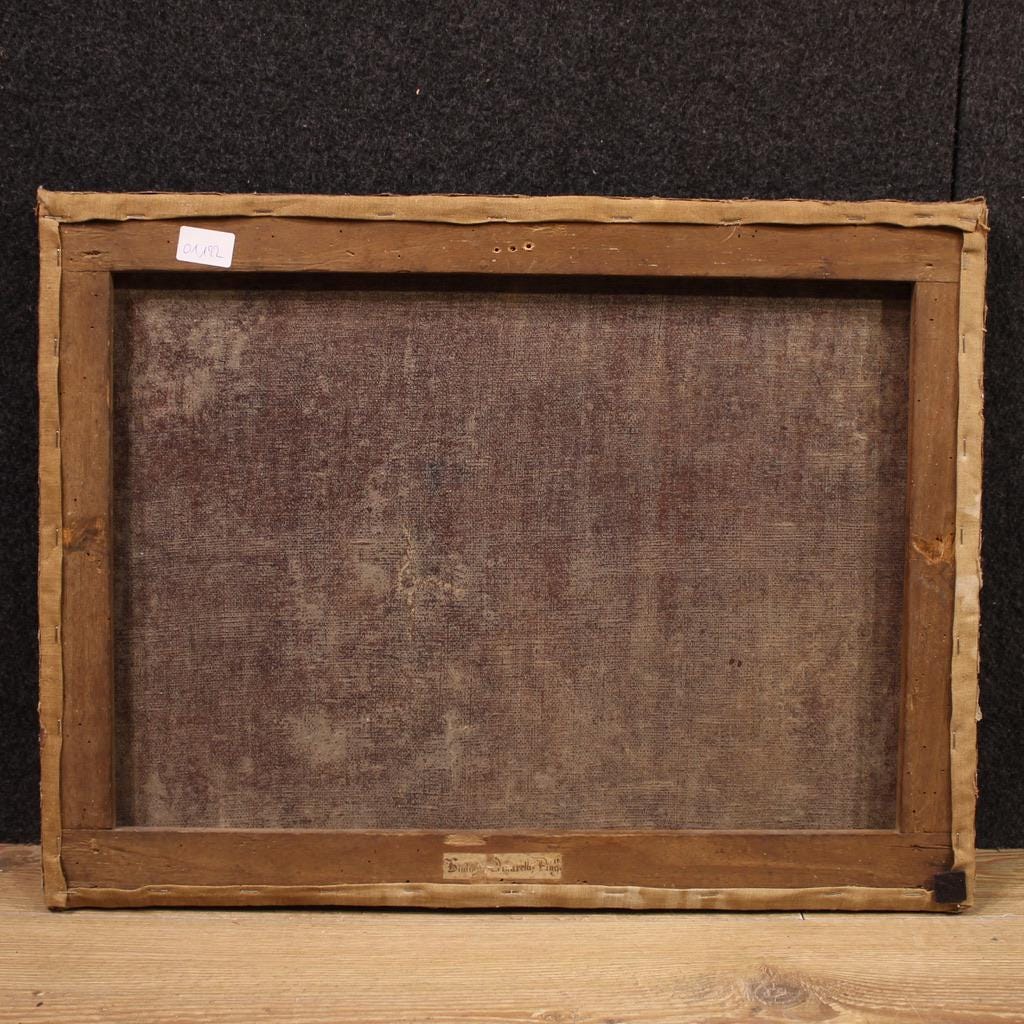 This artwork is attributed to the Bolognese painter Giuliano Dinarelli (1629-1671), a favorite student of Guido Reni and a specialist in religious scenes. (The painting does not currently come with an expertise, but one can be requested upon payment of the relevant additional costs.) This rare painting is perfect for cultured and discerning collectors, ideal for refined settings and prestigious professional studios. The painting has already been restored with re-lining, replacement of the stretcher, and re-coloring in small areas. Overall, it is in good condition.